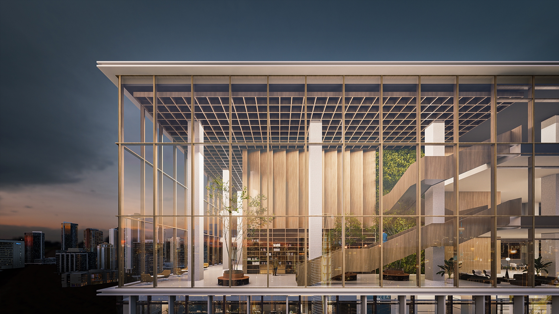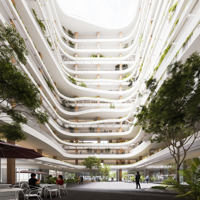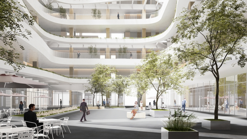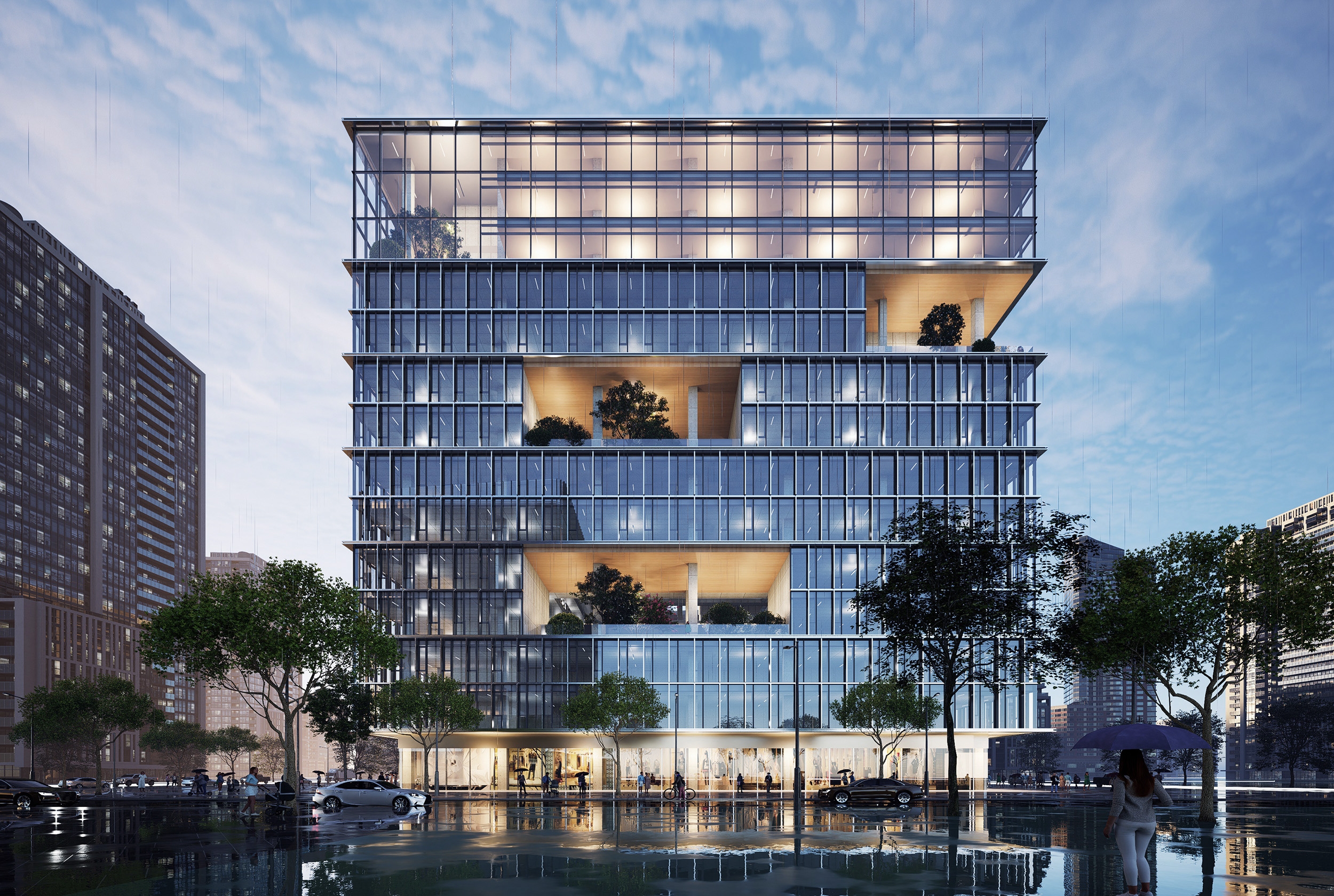 The building takes "ecology" and "agriculture" as its core, creating a green and comfortable office environment through the concept of an "ecological garden." The design increases the potential for communication in public areas and breaking the closedness and monotony of traditional office buildings. The fourteen-story structure is a hollow rectangle, featuring a green public area—a sky garden on each floor.Connected to an atrium that reduces the building's energy consumption. This design provides a diverse spatial experience and an open communication environment while improving natural ventilation and lighting, thereby reducing electricity consumption. Using crops for atrium greening not only fulfills experimental functions but also creates an eco-agricultural atmosphere. The indoor stacked platform curves resemble green terraces, with plants extending from the ground to the roof, forming a complete ecosystem that elevates the visual experience and air quality. The external double-layer curtain wall, paired with aluminum blinds, ensures heat insulation and shading, further reducing energy consumption and carbon emissions.