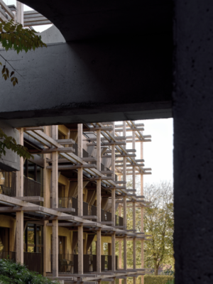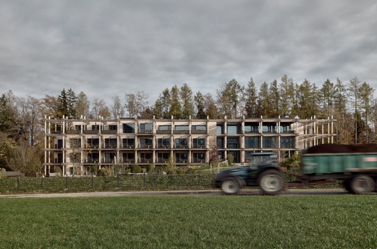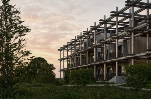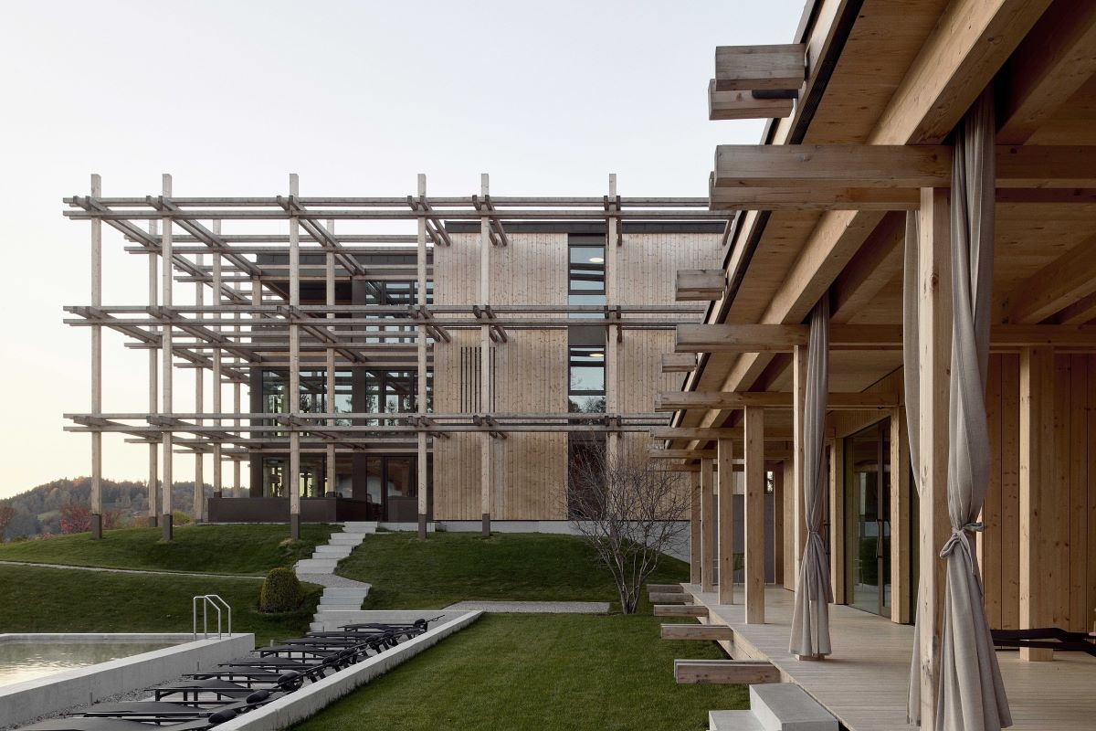 The hotel emerges confidently but thoughtfully from the neighboring forest. The aboveground exterior walls of the guest wing were prefabricated in timber frame construction with pre-installed windows. Together with the prefabricated concrete ceilings, they contributed significantly to the building being ready for occupancy in just 17 months. The wooden façade construction made from the supposedly "low-value", local spruce wood performs not only in an aesthetic and narrative way but also in physical building functions. Thanks to a further developed, vernacular construction structure, in which the weak points of the wood were optimized using the latest material knowledge (PU sealing of the end grain surfaces), it was possible to create a prototype that can avoid energy-intensive metal covers for the wooden parts and the use of high-quality wood species. The façade is inspired by the surrounding urban forest and its structural tectonics. The vertical wooden supports with their horizontal balconies in a three-dimensional net symbolize the individual trees of the forest, which weave themselves into a three-dimensional structure (the forest) via their horizontally spreading branches.