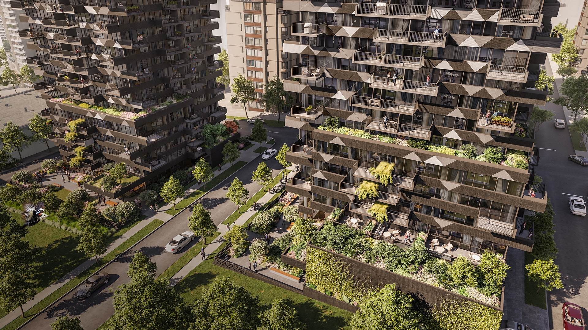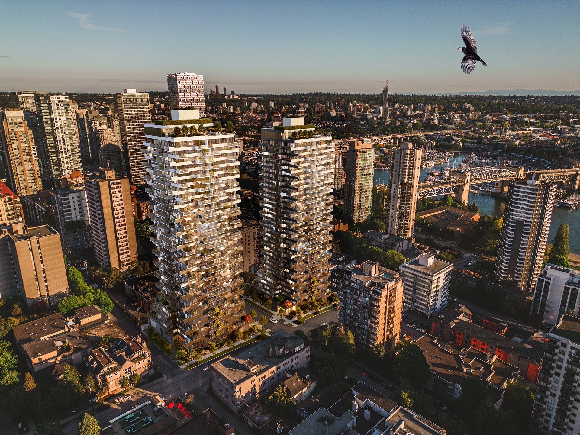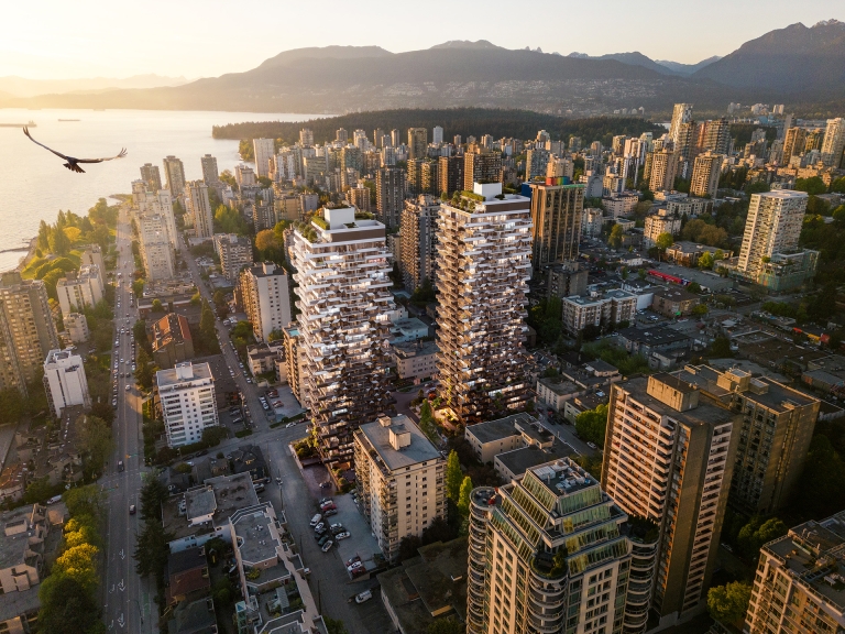 The West End was developed in the 1970s with tall residential towers on relatively small urban blocks. The resulting slender towers allow light to penetrate to street level and enable lush foliage at grade. Massing of the new towers respects this context, maintaining existing private views.