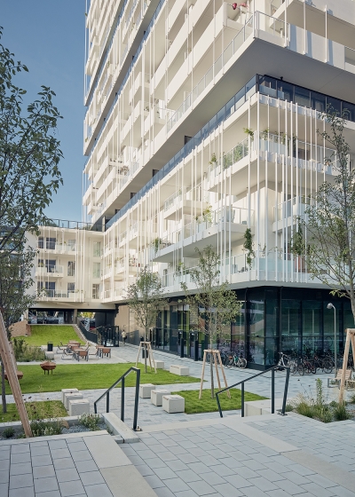The Taborama is a residential high-rise characterized by its greenery and vibrant, multi-storey community rooms. The building's horizontal structure is accentuated by dark setbacks with generous heights, which shape its architectural identity.