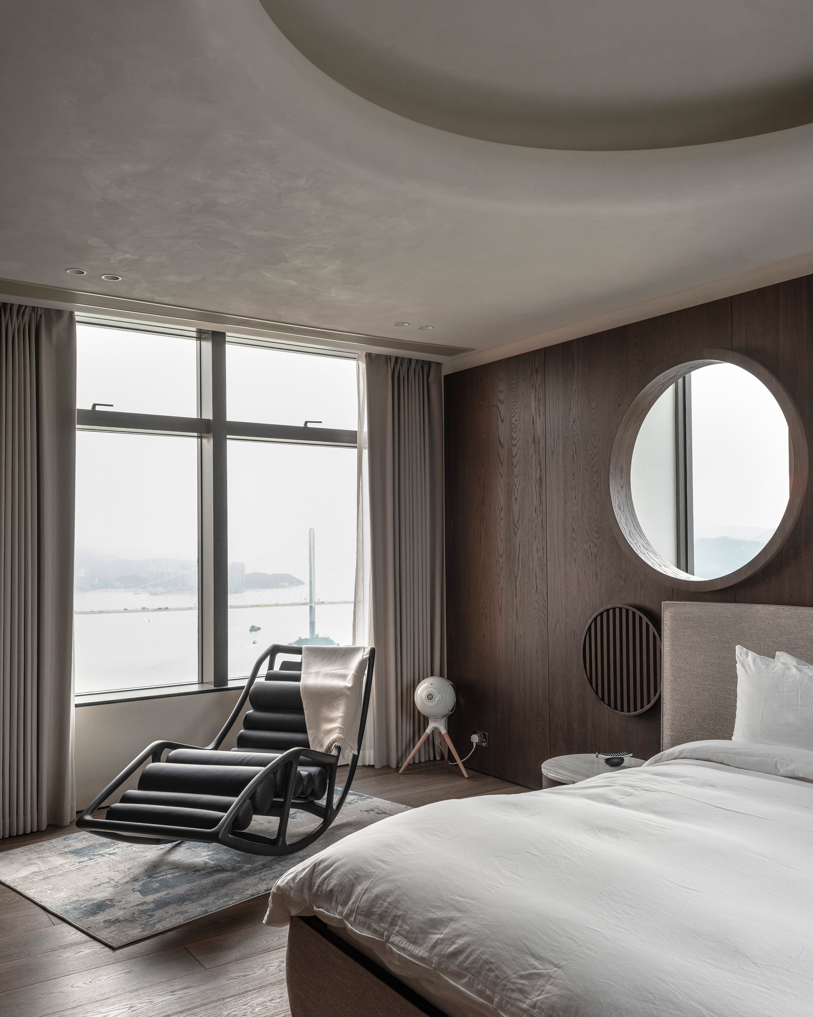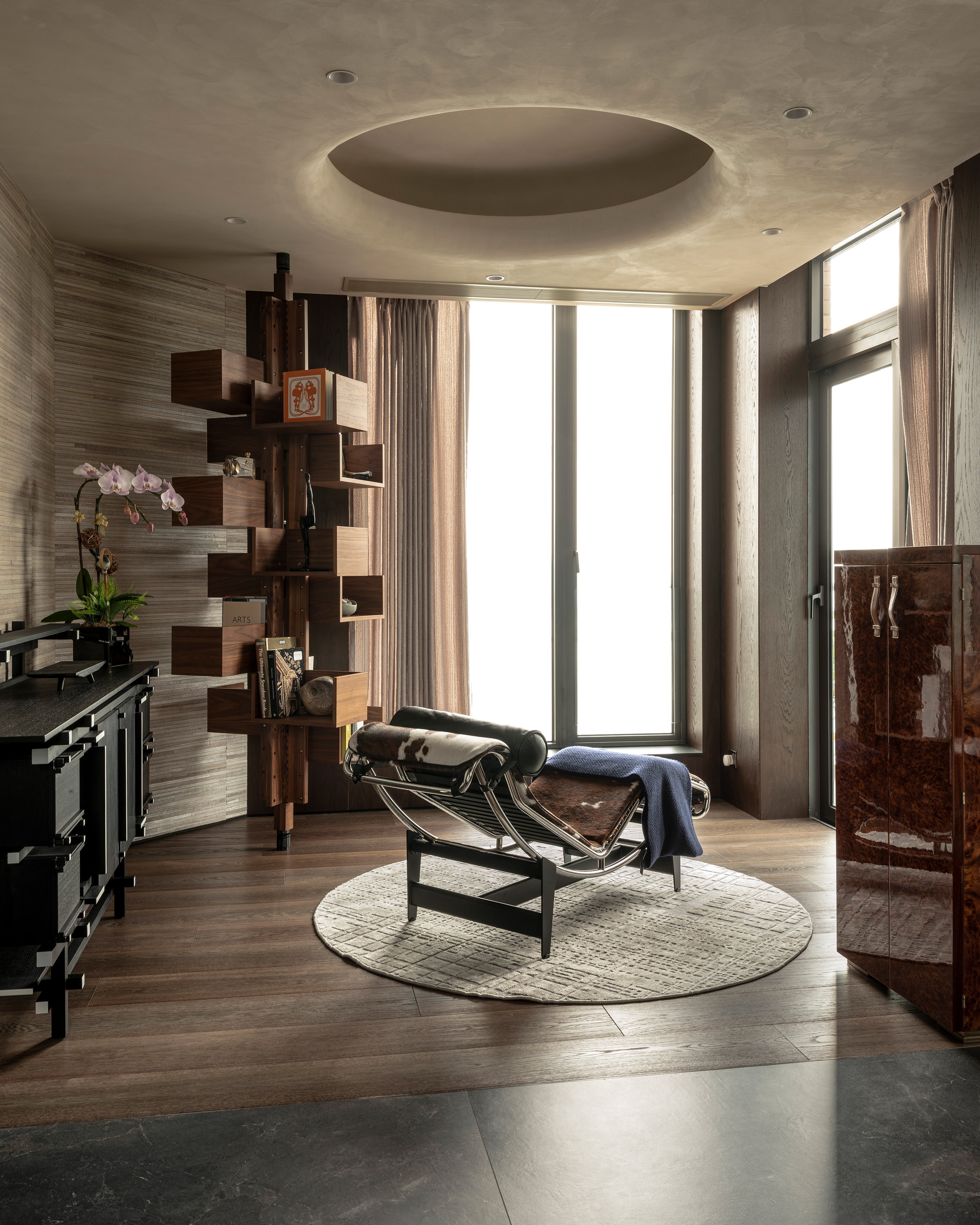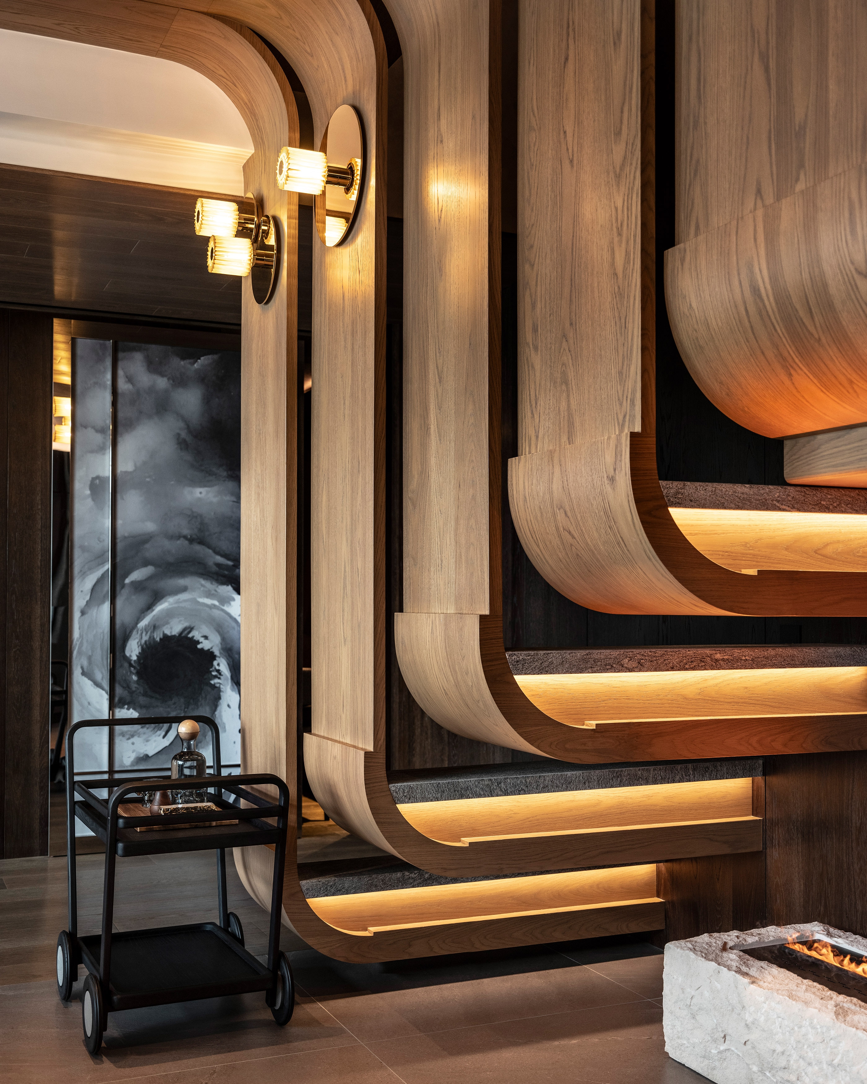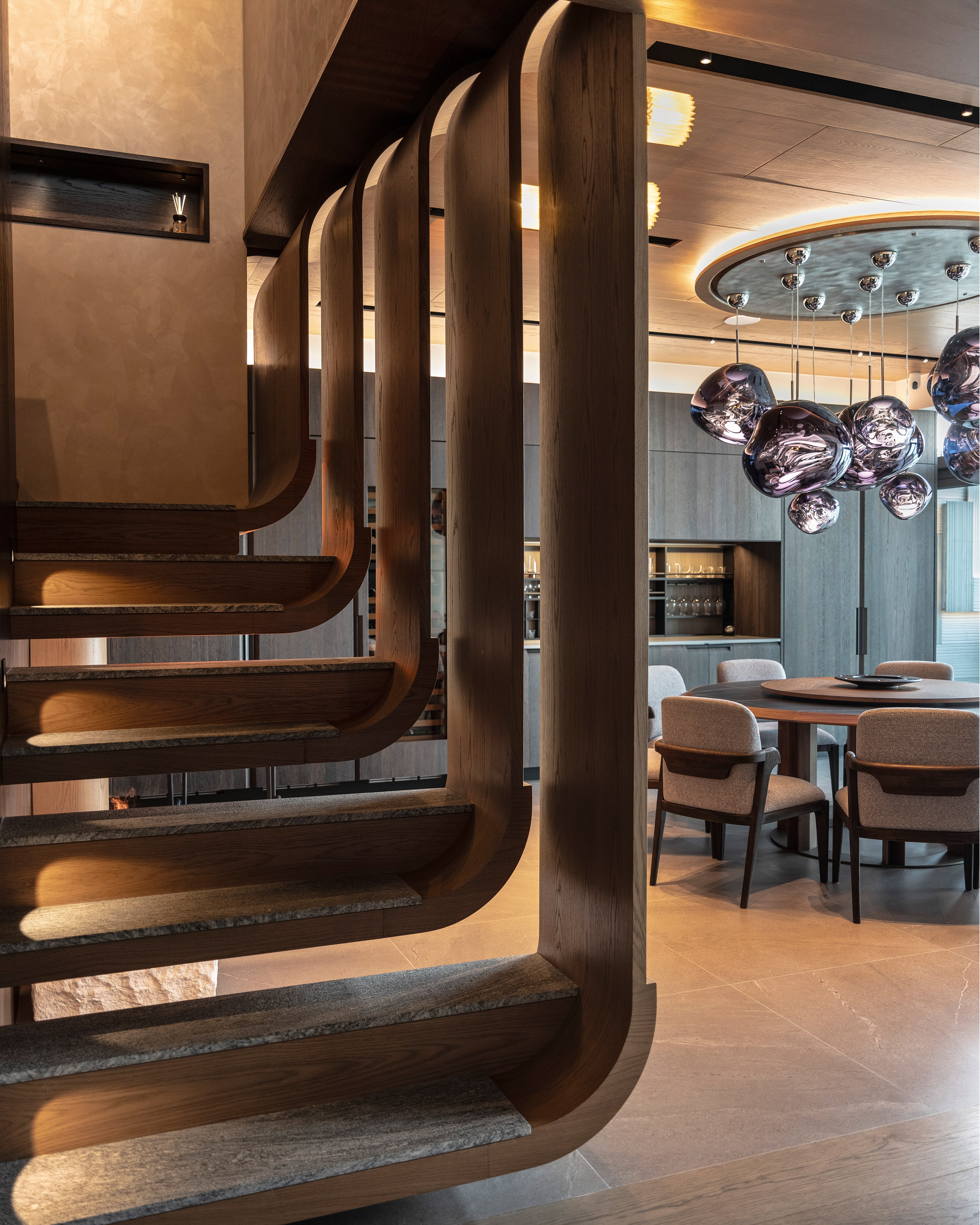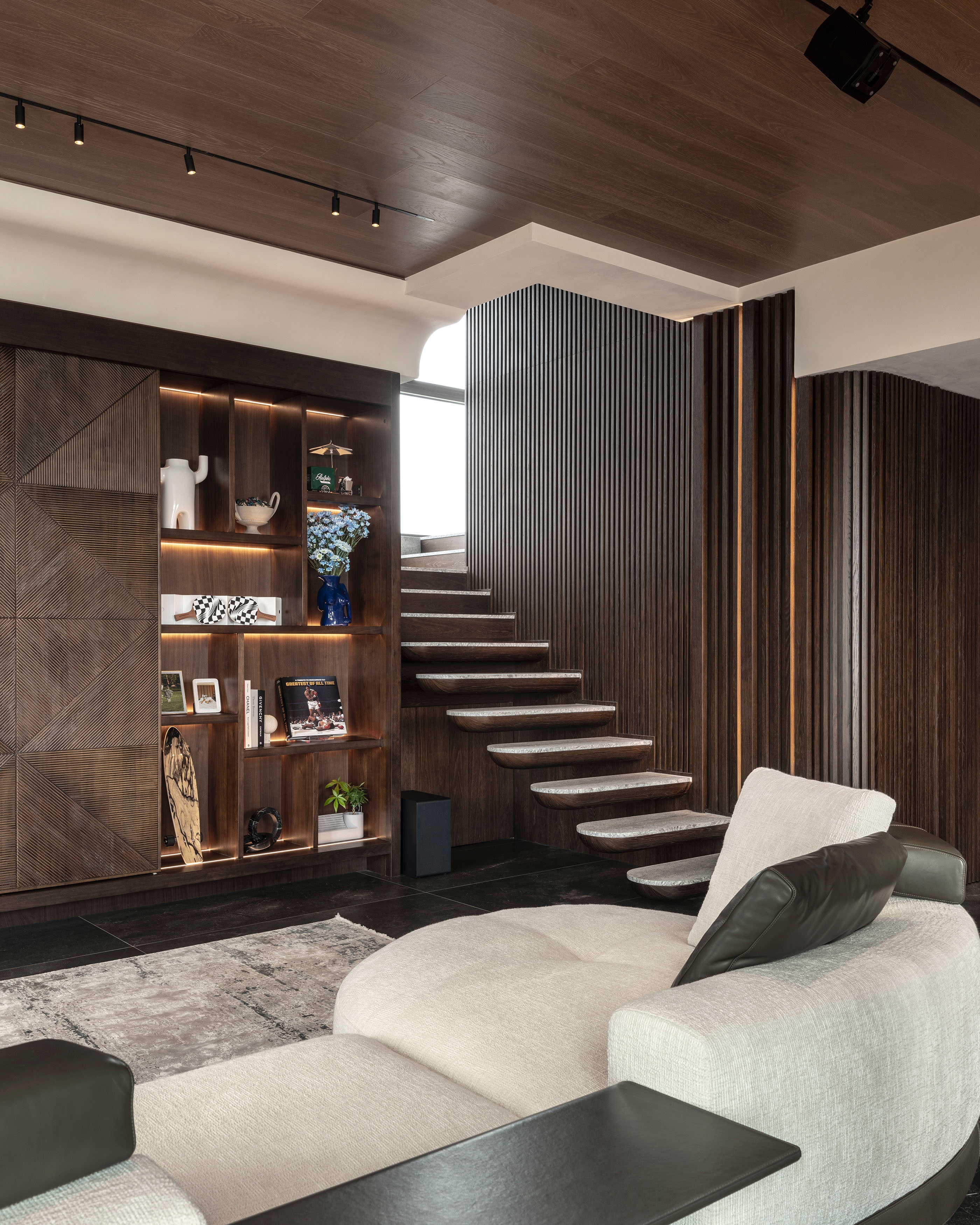 Staircase design-features open risers and horizontal wooden treads, giving the appearance of floating steps. These treads are connected to a central dark metal stringer, which adds a sleek and contemporary touch to the overall design. The handrail, also made of wood, curves smoothly around the edge of the staircase, enhancing its aesthetic appeal. This design combines functionality with modern elegance, creating an architectural focal point within the room. The use of natural materials and clean lines contributes to a sophisticated and inviting atmosphere.