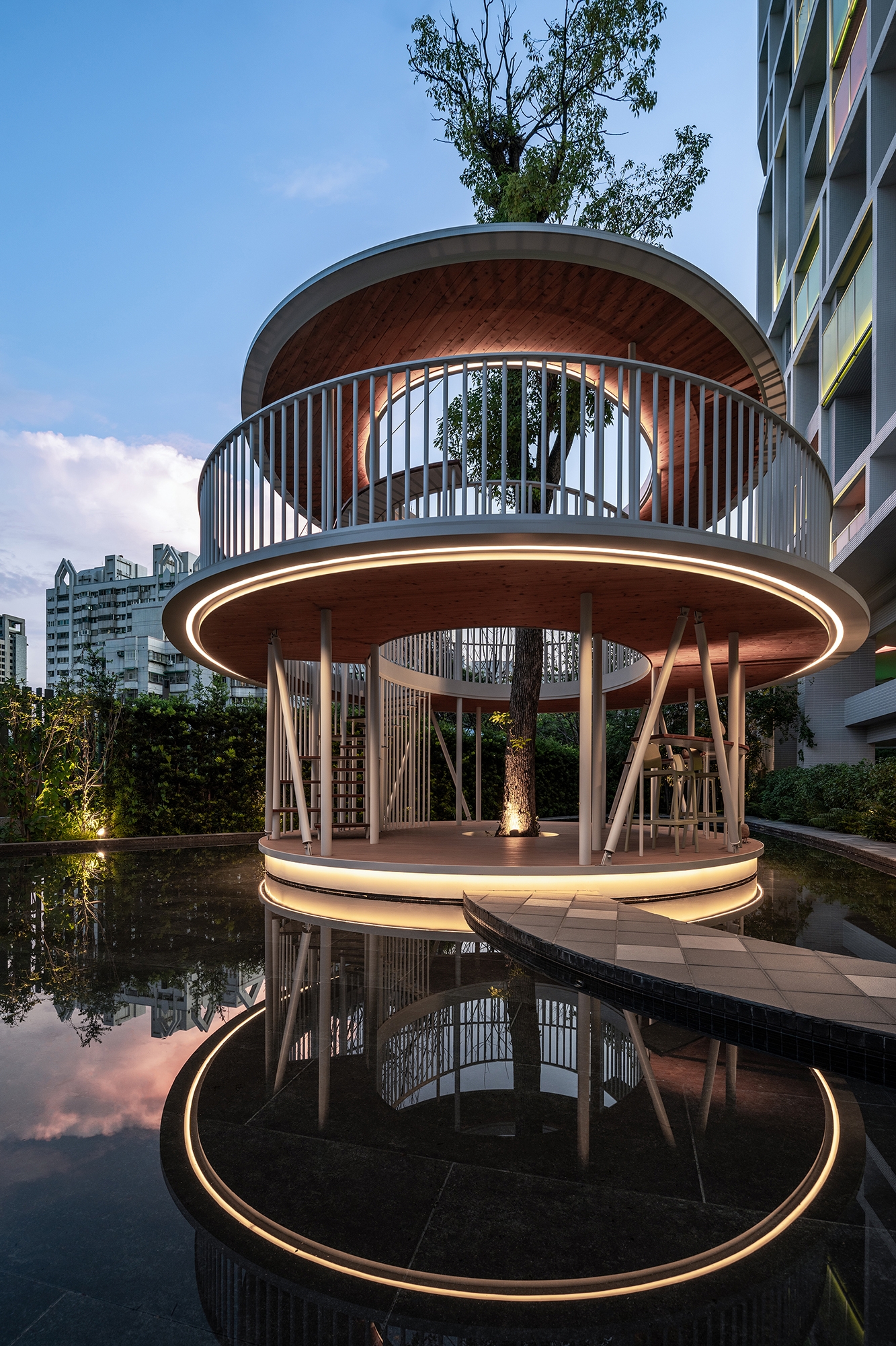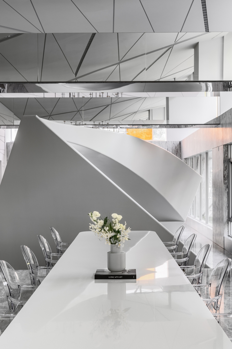 The presented project pertains to the design implementation for the communal area of a residential property, wherein deliberate emphasis has been placed on the incorporation of white and high-tech concepts as the primary design principles. Through the strategic simplification of interior furnishings, adoption of an open design, and utilization of white as the foundational element, the resultant interior environment is characterized by openness, fluidity, and seamless interconnectedness. Diverging from traditional residential arrangements that epitomize rigidity and compartmentalization, the project advocates for a unified white design underscored by intertwining lines. In addition, the integration of specially crafted art chairs and tree houses, both indoors and outdoors, culminates in the creation of a living space that exudes the ambiance of an art gallery, offering its residents an experiential fusion of aesthetic appeal and functional living. The design concept is centered around creating an open and airy space that minimizes visual and psychological distractions, promoting a sense of relaxation and well-being.