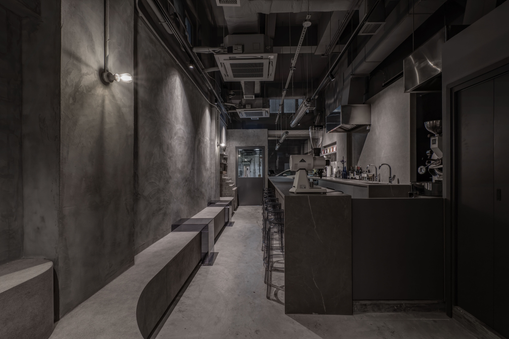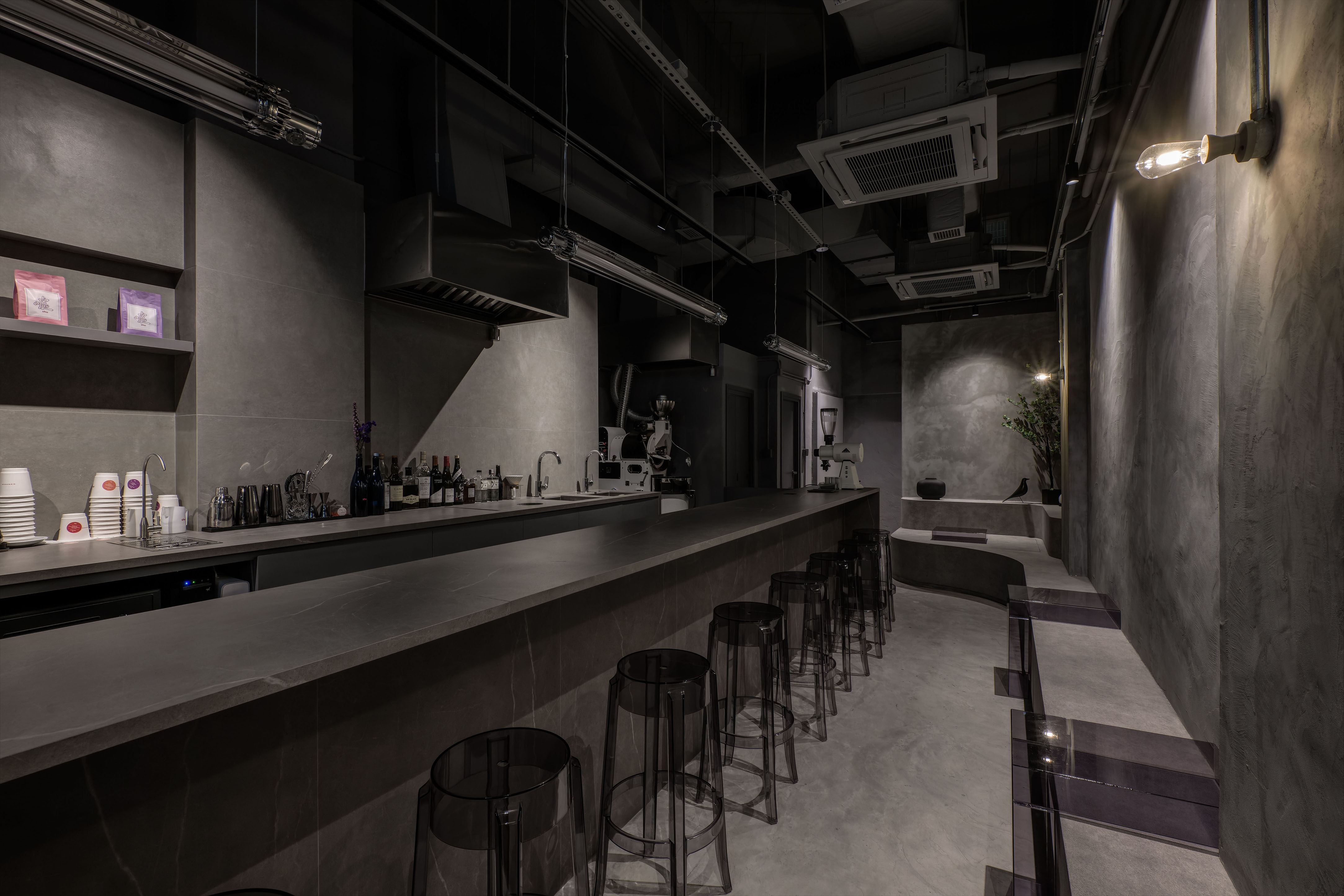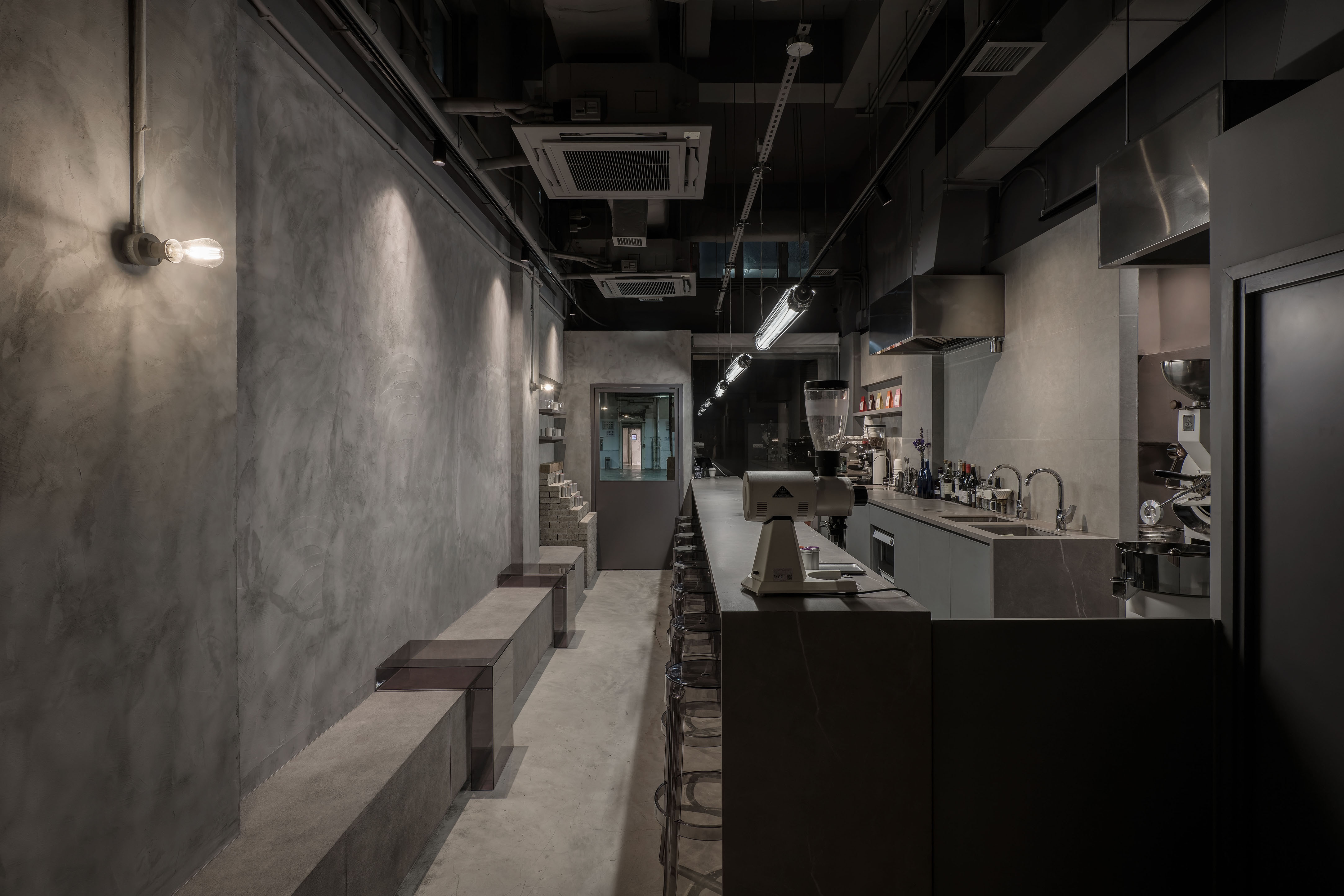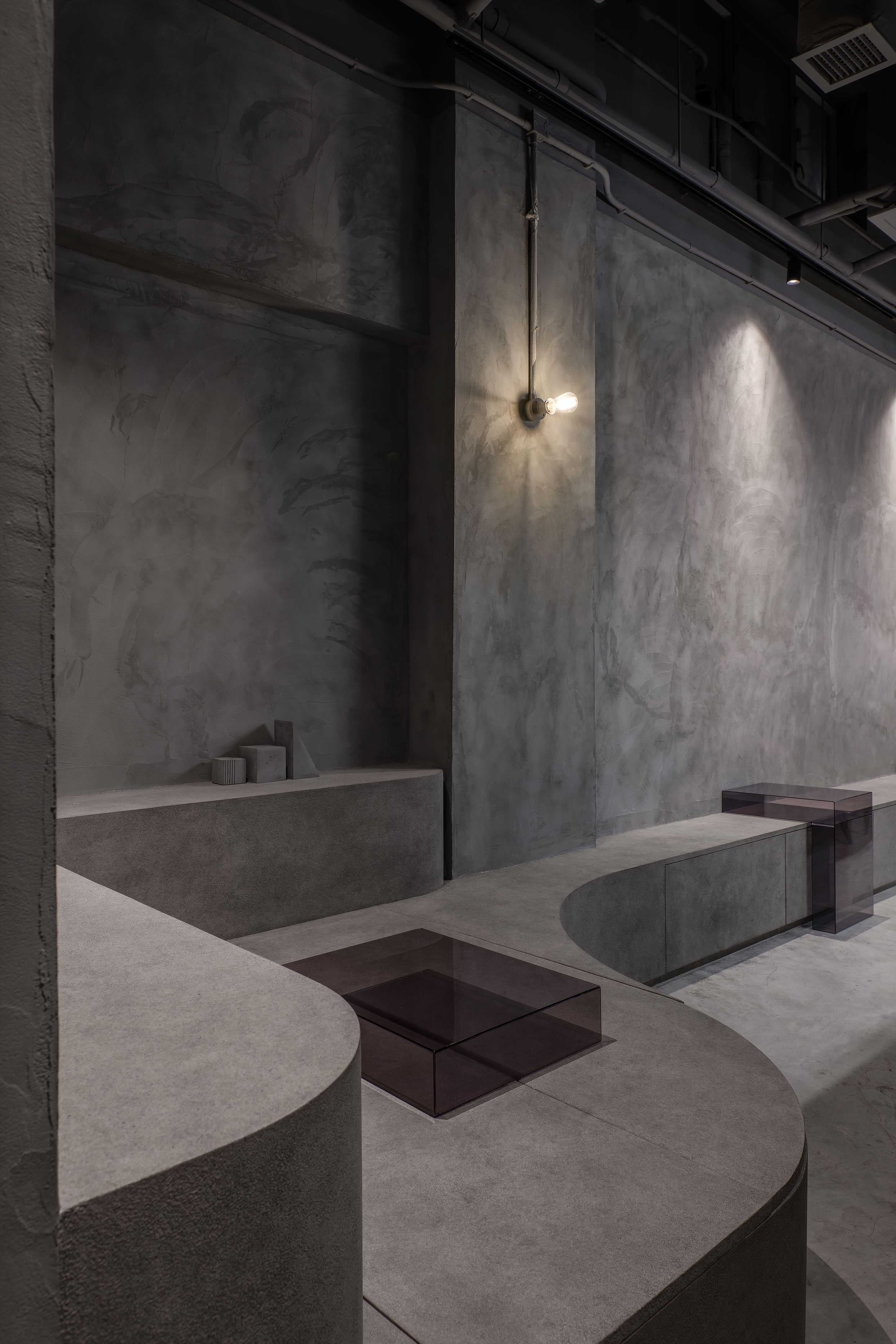 The entire space uses gray throughout the interior and exterior, hoping to create a sense of unity, and uses different gray materials to create a layered feel.