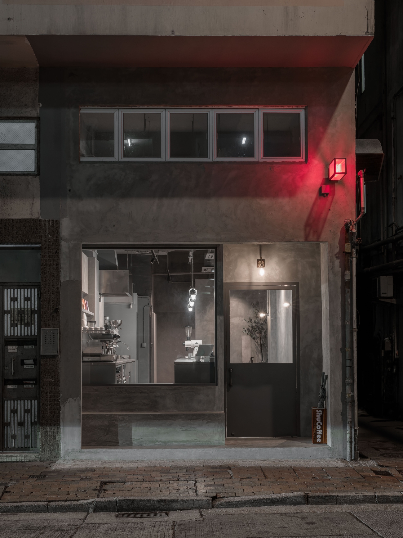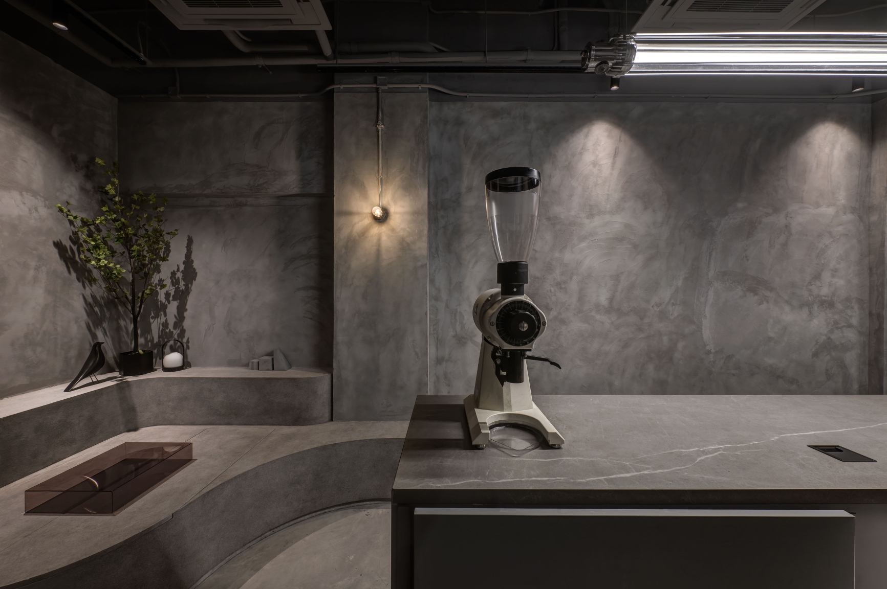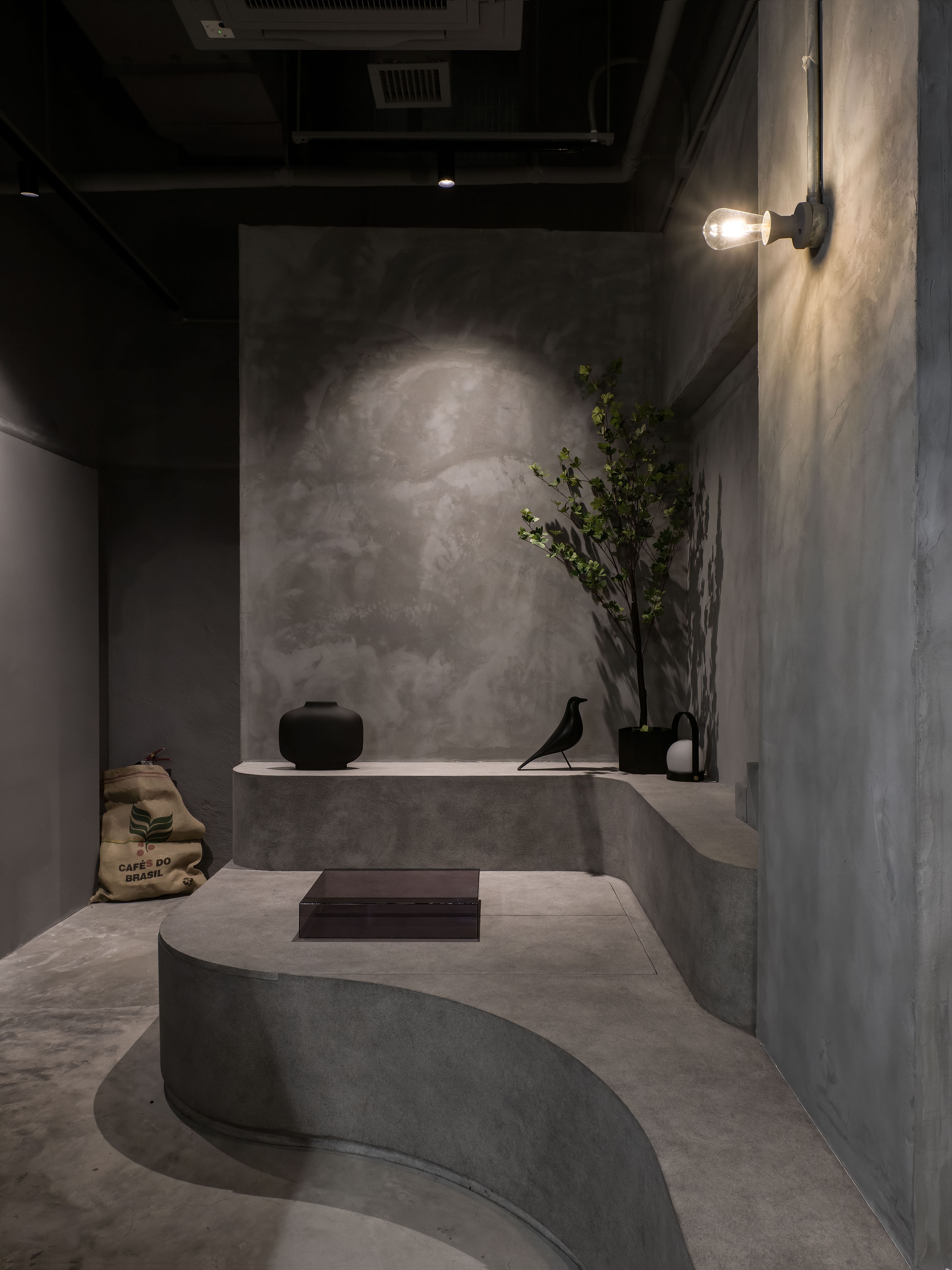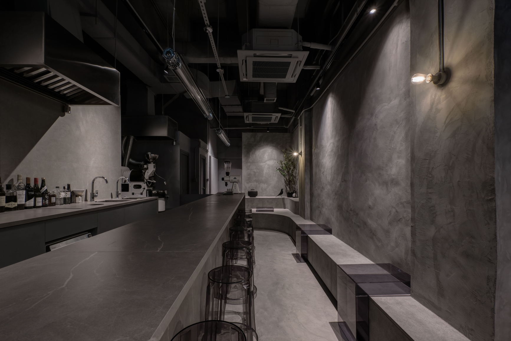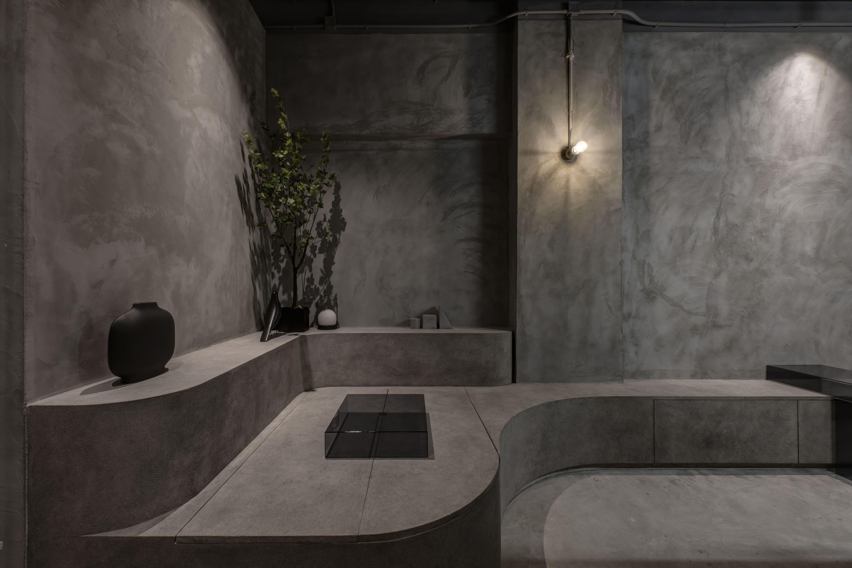 The entire space uses gray throughout the interior and exterior, hoping to create a sense of unity, and uses different gray materials to create a layered feel.