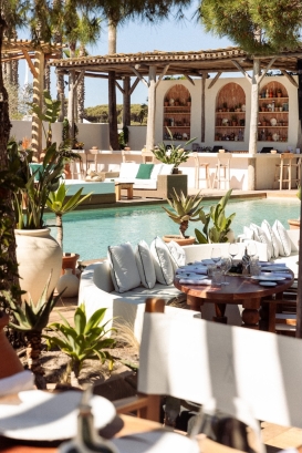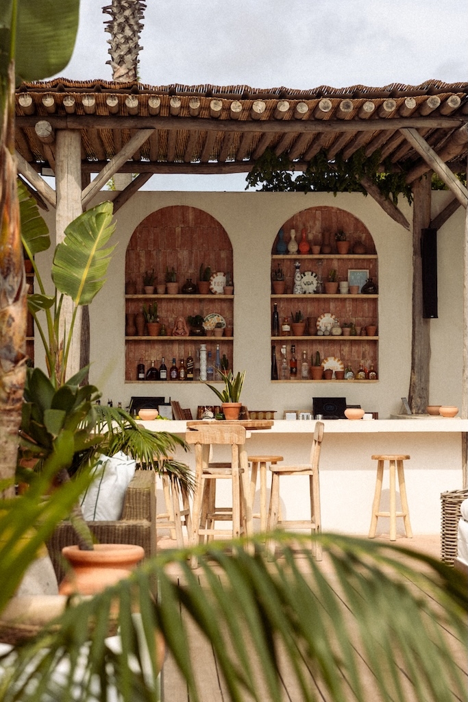 The Mediterranean-inspired bar, with its arched shelving crafted from organic materials, exudes timeless artistry. Just steps away, the pool area is a haven of relaxation, featuring soft daybeds shaded by wooden pergolas, creating a lavish retreat for sunseekers.