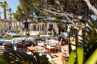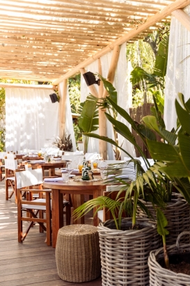 The space seamlessly blends nature's elements with contemporary elegance, creating a serene yet luxurious atmosphere. The outdoor dining area, nestled beneath large trees and pergolas, invites guests to relax in a tranquil, shaded setting. Wooden furnishings adorned with plush white cushions and surrounded by vibrant greenery enhance the natural charm, offering a perfect escape.