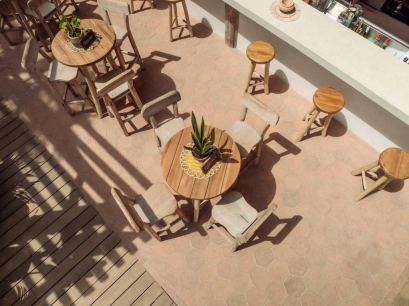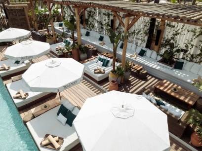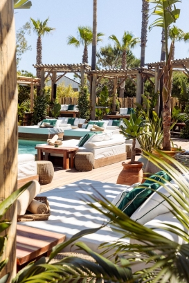 Neutral tones, rich textures, and lush plants unify the design, making the entire space a cohesive extension of the beach club’s laid-back elegance. Special touches of the South of France are sprinkled throughout, like the olive oil canisters from Popolo, a French brand with an Italian soul that offers a taste of la dolce vita.