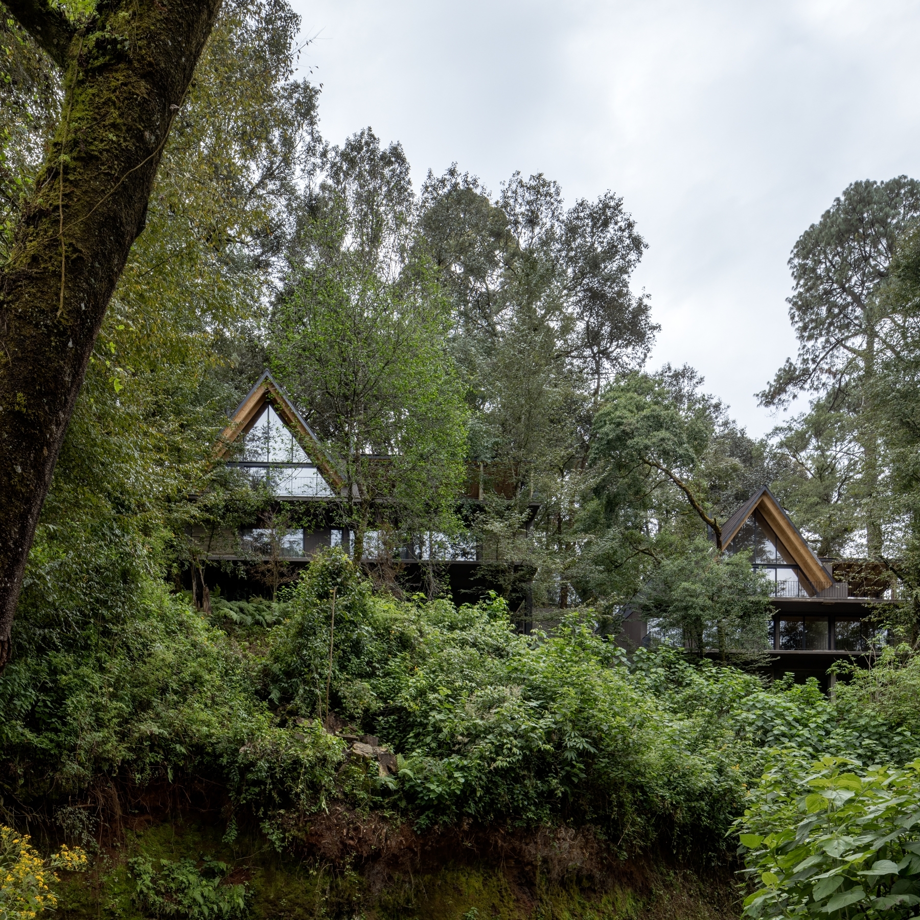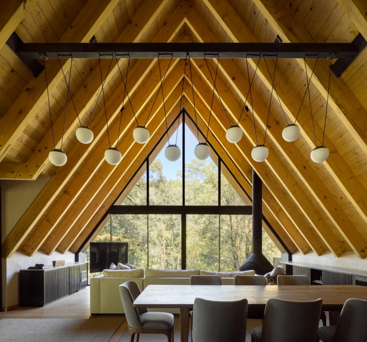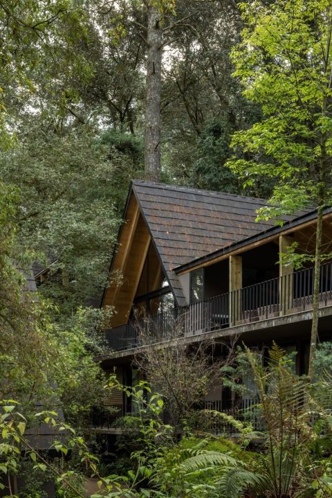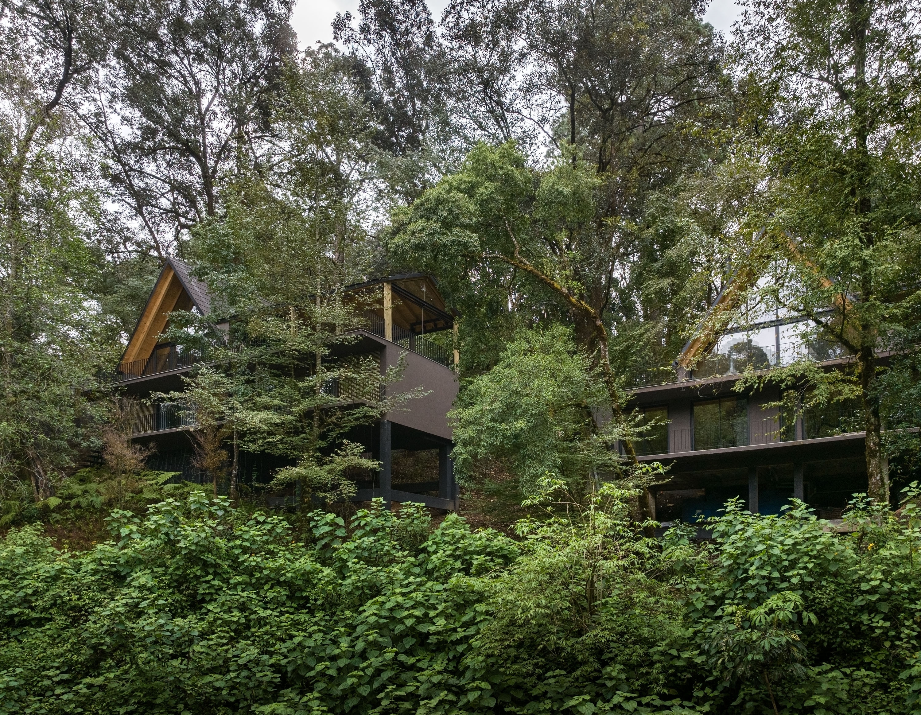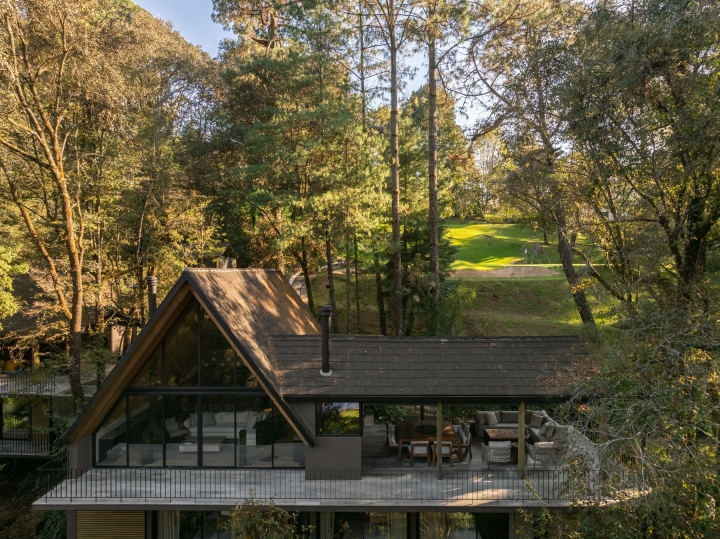 El Ocojal is a residential complex of six 350 m2 houses nestled in the forest over a plot of 7,000 m² in a weekend destination for Mexico city inhabitants. Its name refers to the predominant vegetation of the area. The project was conceived with the objective of minimizing intervention in the environment, preserving the existing vegetation and carrying out only minimal logging of three trees, thus ensuring the integration with the landscape. It is achieved both through the layout of the houses and through the use of materials such as timber and clay-tile that respond to the natural context, establishing a color palette aligned with the context.The A morphology provides spatial amplitude, with double-height areas and large windows that frame the landscape and establish a direct visual connection with the surroundings.