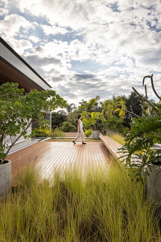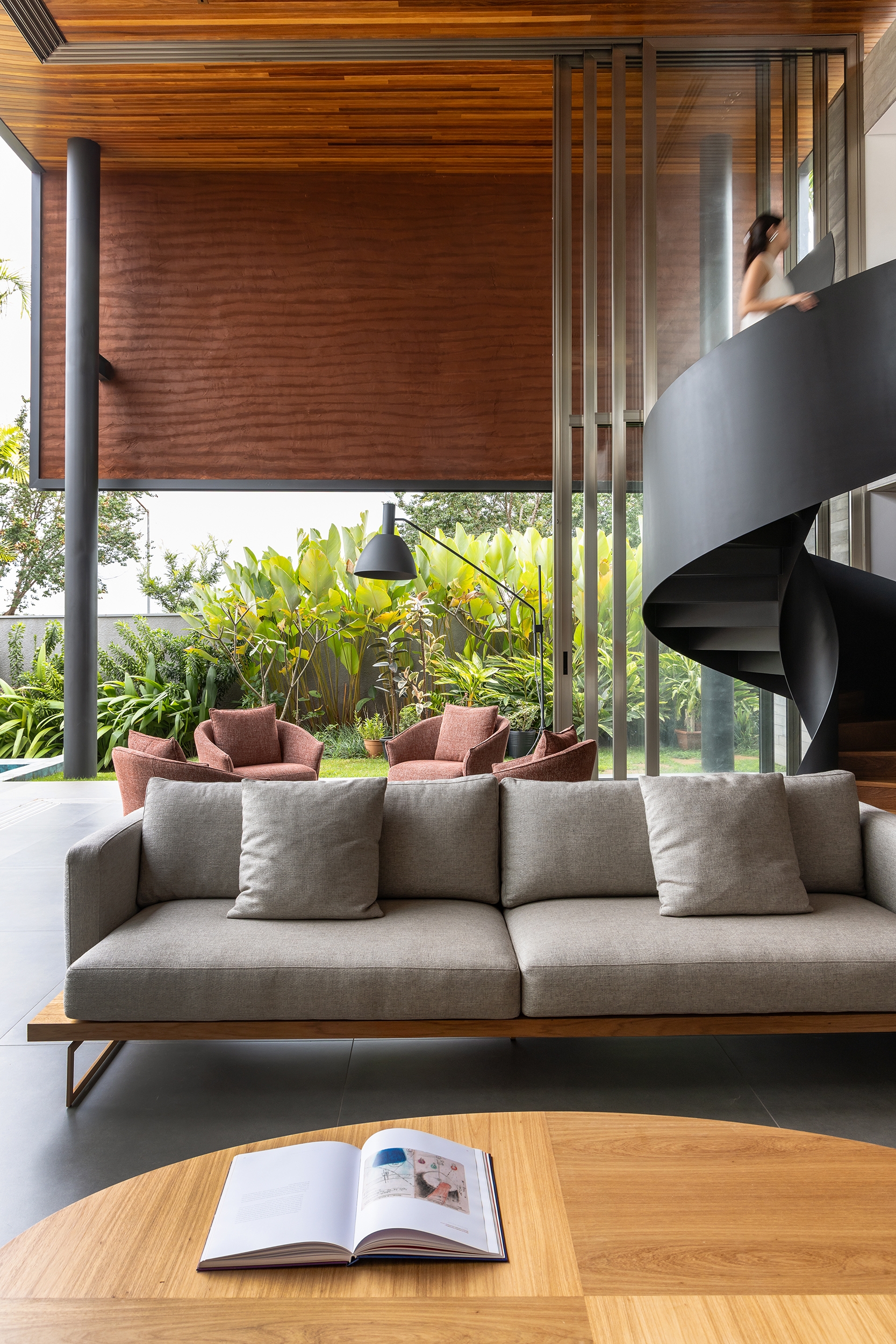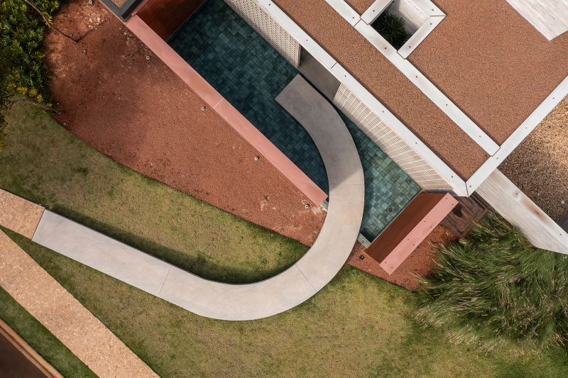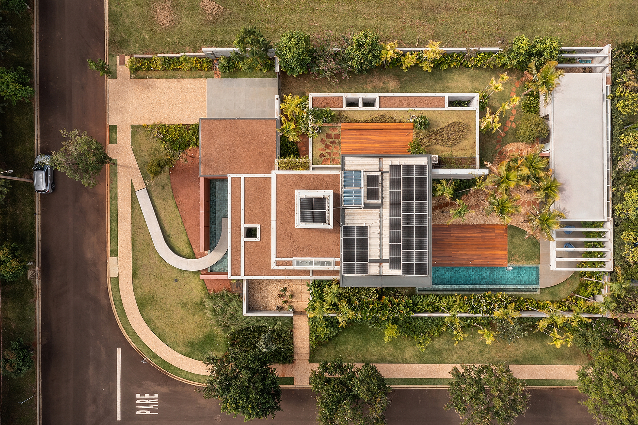 Located in Cravinhos, Casa Oásis turns arrival into a calm transition from glare to shade. A rammed earth frontage shields the house from the street and guides a ramp to the entry patio, where a reflecting pool and cobogó screens cool the air and filter light. On the ground floor, living areas and suites open to the garden; the living room uses large sliding frames to open completely and perform as a continuous veranda. A mezzanine with TV room and study connects to a green terrace above the bedrooms, which adds natural insulation and extends outdoor use. Comfort relies on passive means, thermal mass in rammed earth, cross ventilation, and an L shaped plane over the living room that combines a vertical rammed earth screen with a horizontal sandwich roof to reduce solar gain. Ventilated skylights exhaust warm air; water and shade stabilize a domestic microclimate. Rainwater is captured for irrigation; solar water heating and photovoltaic panels supply energy. Materials were selected for performance and low maintenance. The result is stable temperatures, diffuse light and long views, with precise, quiet architecture.