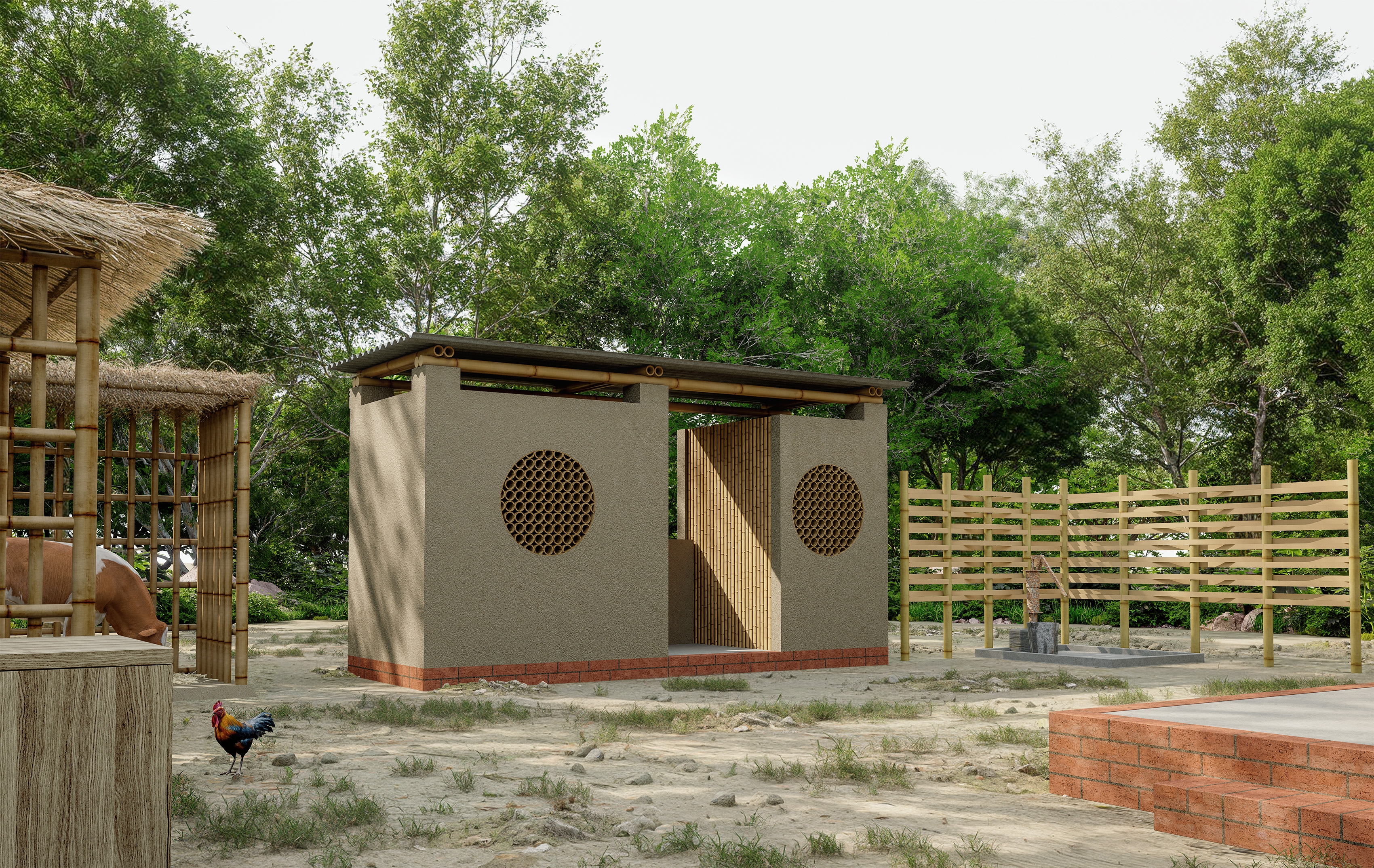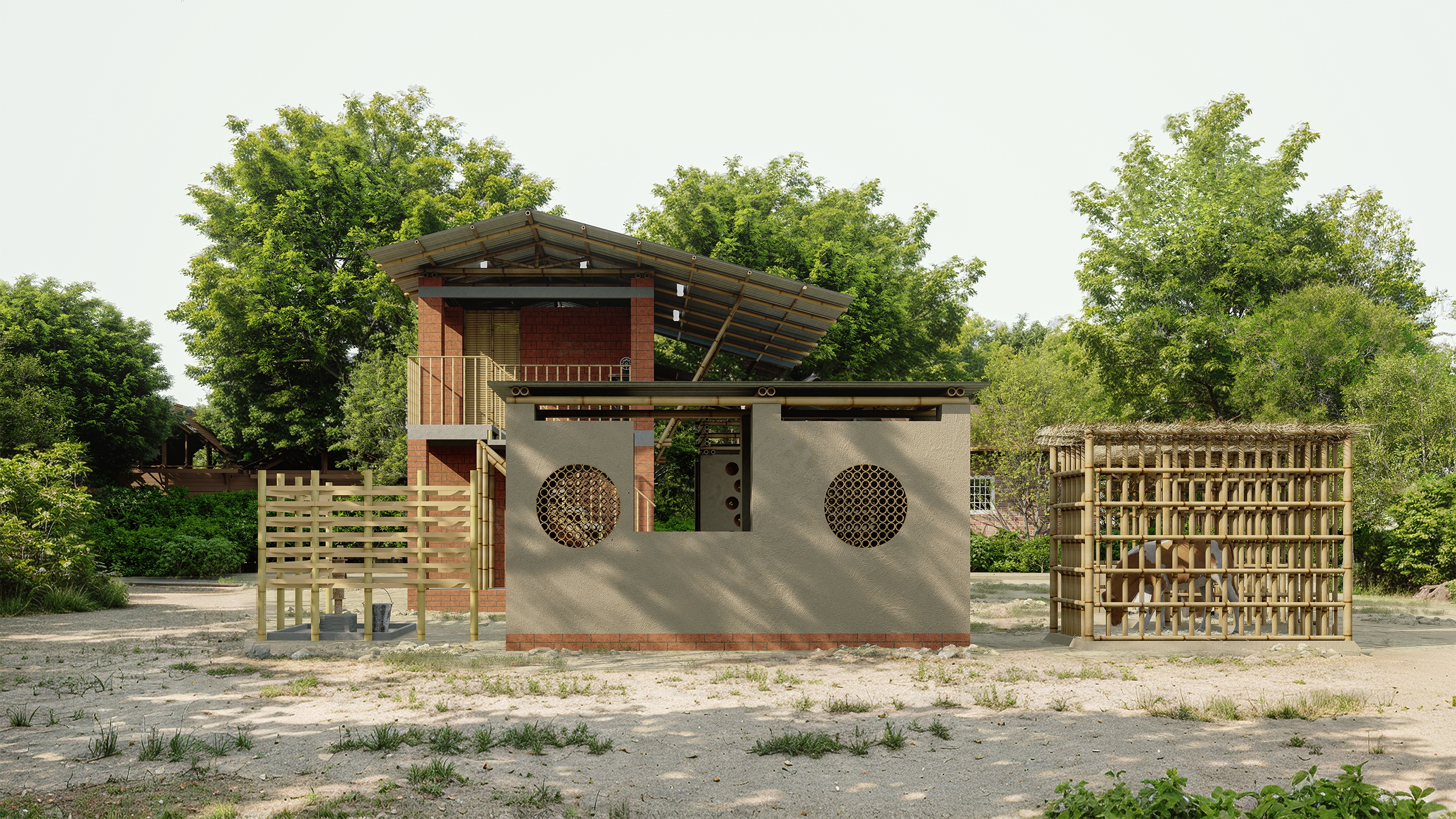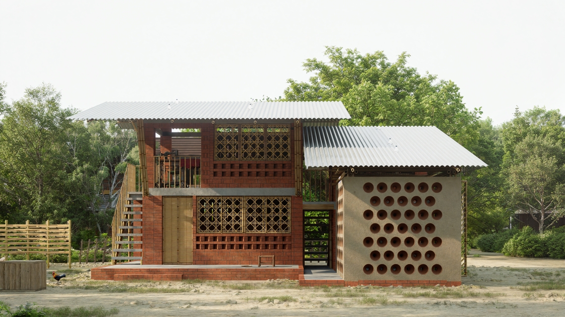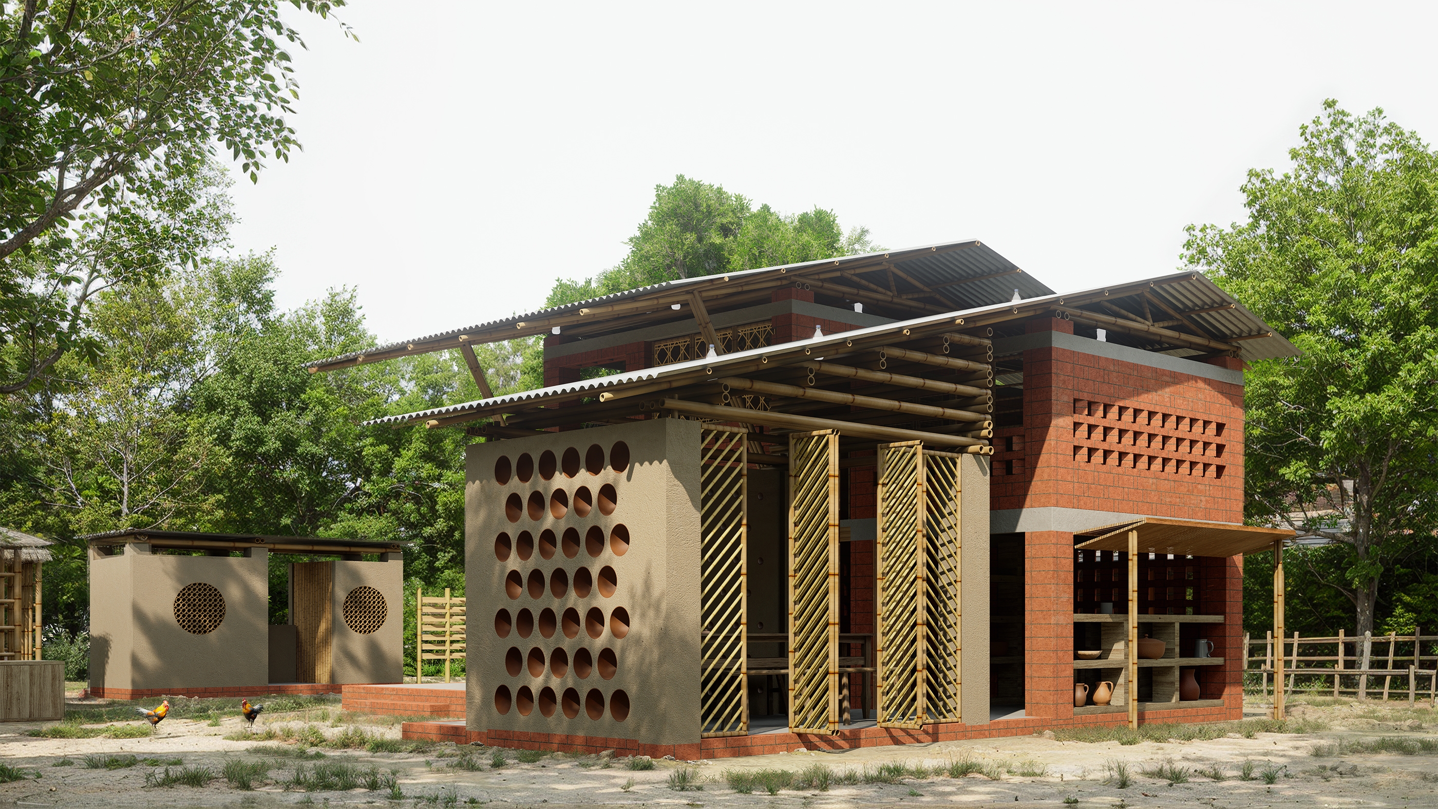 The $2,500 Vernacular Home is a sustainable house designed in Para Dash, the village of Modonpur, Bangladesh. Built with a budget under $2,500, including labor and materials, it uses only local resources: mud, straw, bamboo, bricks, and tin sheets. The home serves a family of four—parents and their son with his wife. To address Bangladesh’s hot climate and long monsoon season, the design uses a raised veranda, steeply pitched roofs for rain runoff, and a layout that ensures every room catches the breeze. Varying window heights on windward and leeward sides enhance ventilation. Clay pots from a nearby village are embedded in the tea house façade to cool air through airflow compression. The house includes two bedrooms, a kitchen, toilet, cow sheds, and a future child’s room. A weaving area for the daughter-in-law sits on the upper-level balcony, allowing her to stay connected to the family while working. The parents' tea house and shop are placed along the village road for accessibility and courtyard privacy. Due to limited electricity, “liter bottles of light” are used in the roof to brighten interiors. Rooted in local knowledge, the design reflects true vernacular sustainability.
