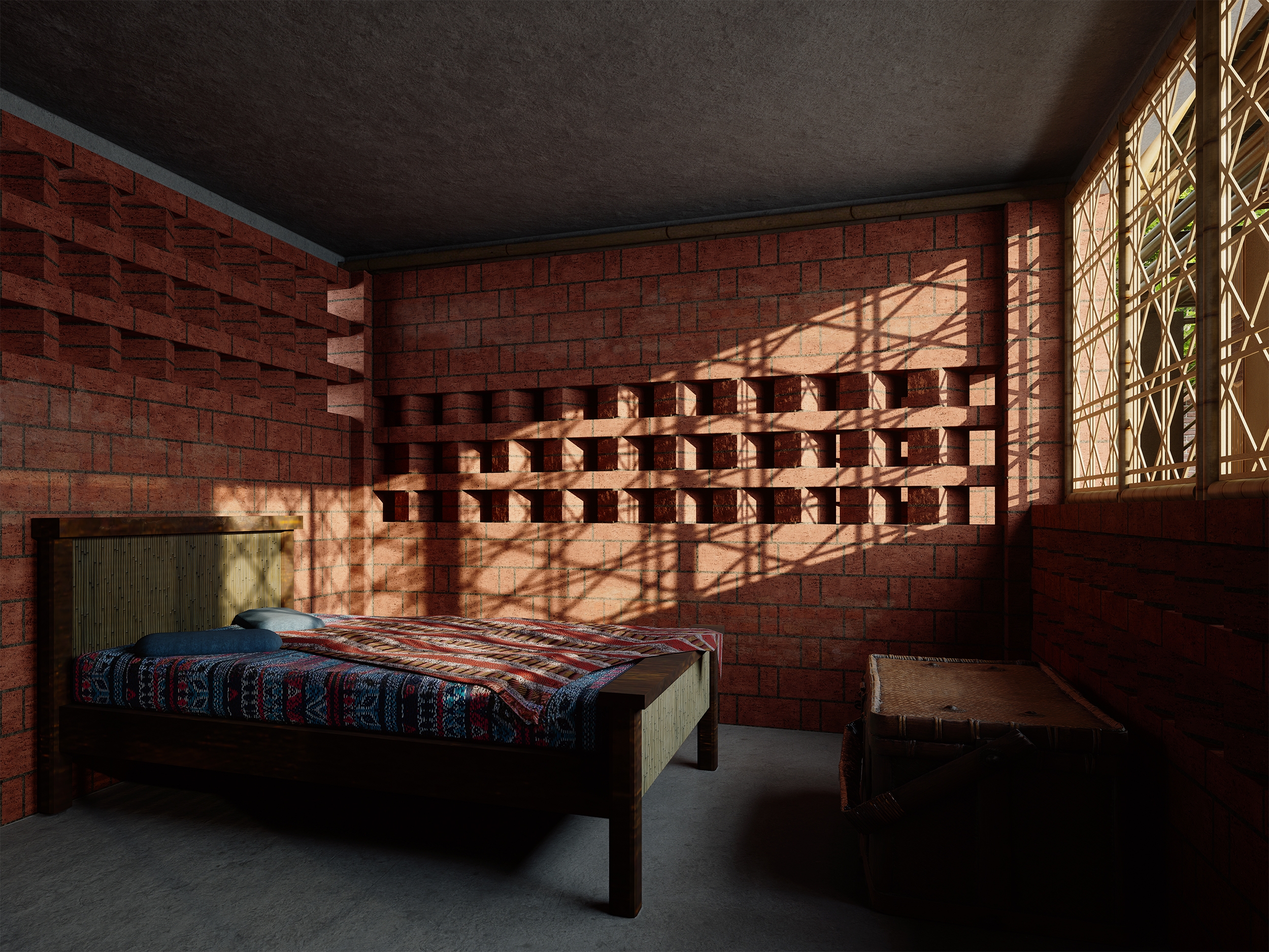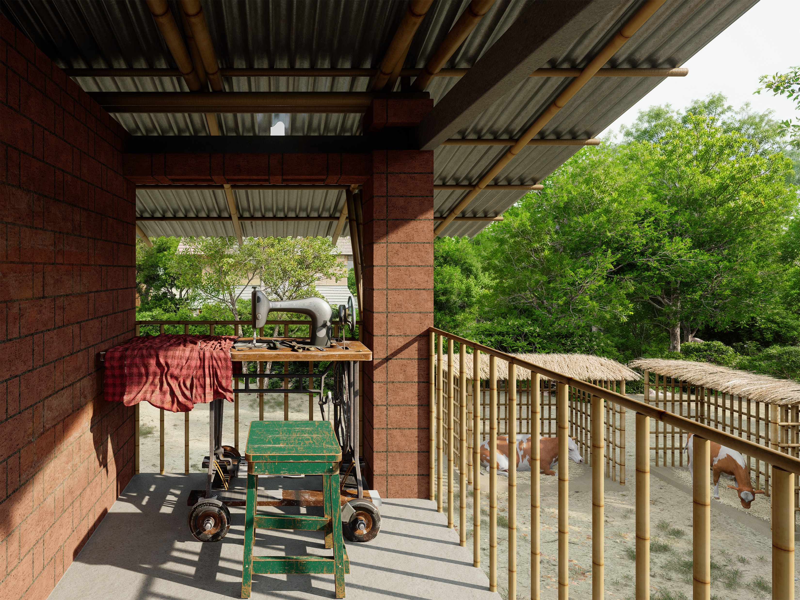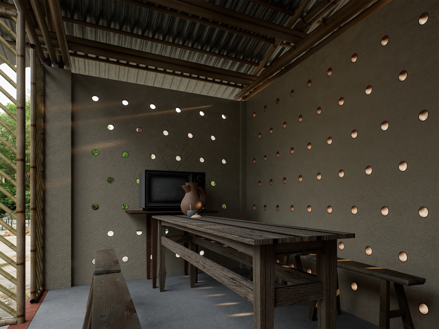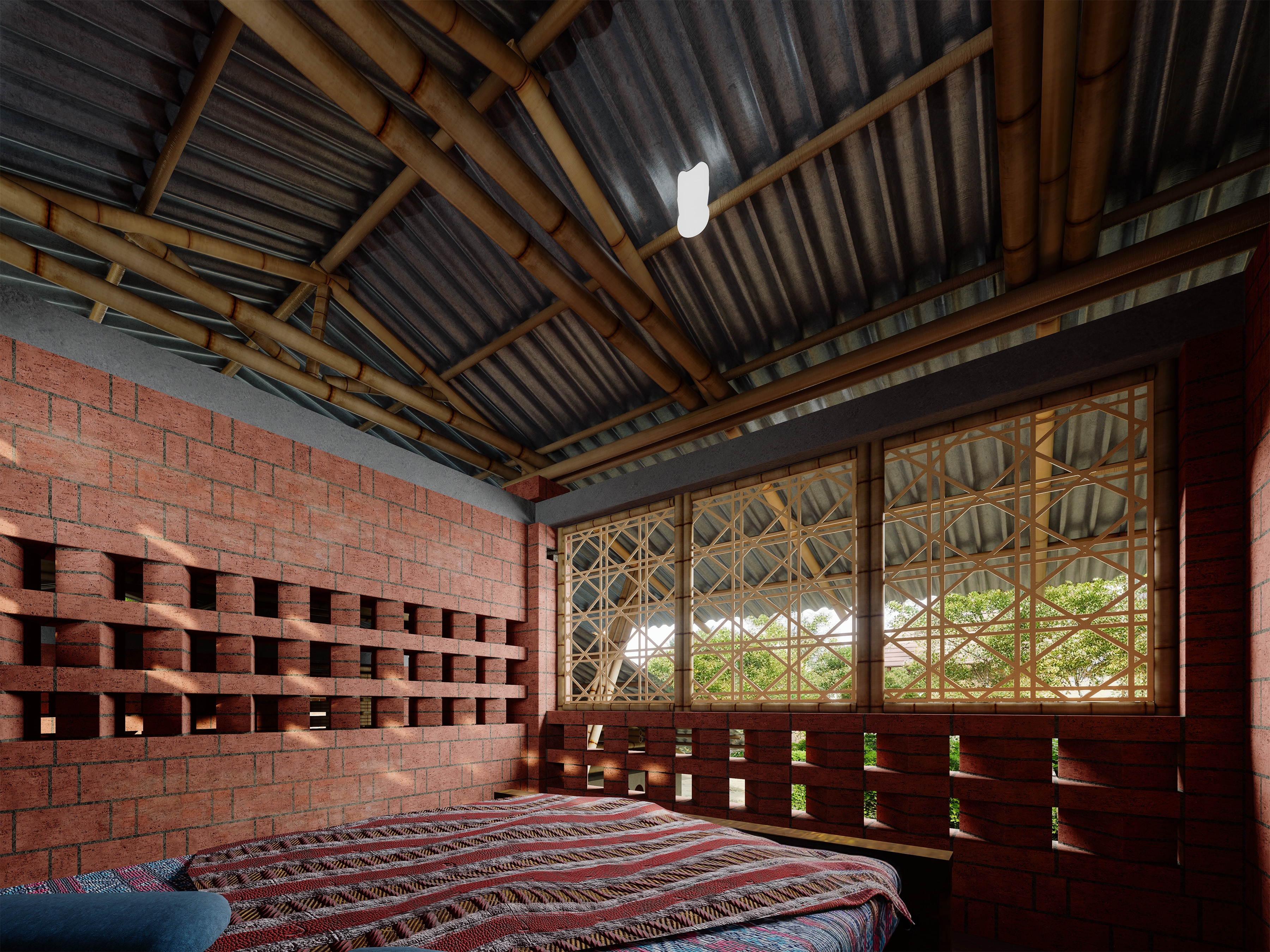 The $2,500 Vernacular Home is a sustainable house designed in Para Dash, the village of Modonpur, Bangladesh. Built with a budget under $2,500, including labor and materials, it uses only local resources: mud, straw, bamboo, bricks, and tin sheets. The home serves a family of four—parents and their son with his wife. To address Bangladesh’s hot climate and long monsoon season, the design uses a raised veranda, steeply pitched roofs for rain runoff, and a layout that ensures every room catches the breeze. Varying window heights on windward and leeward sides enhance ventilation. Clay pots from a nearby village are embedded in the tea house façade to cool air through airflow compression. The house includes two bedrooms, a kitchen, toilet, cow sheds, and a future child’s room. A weaving area for the daughter-in-law sits on the upper-level balcony, allowing her to stay connected to the family while working. The parents' tea house and shop are placed along the village road for accessibility and courtyard privacy. Due to limited electricity, “liter bottles of light” are used in the roof to brighten interiors. Rooted in local knowledge, the design reflects true vernacular sustainability.