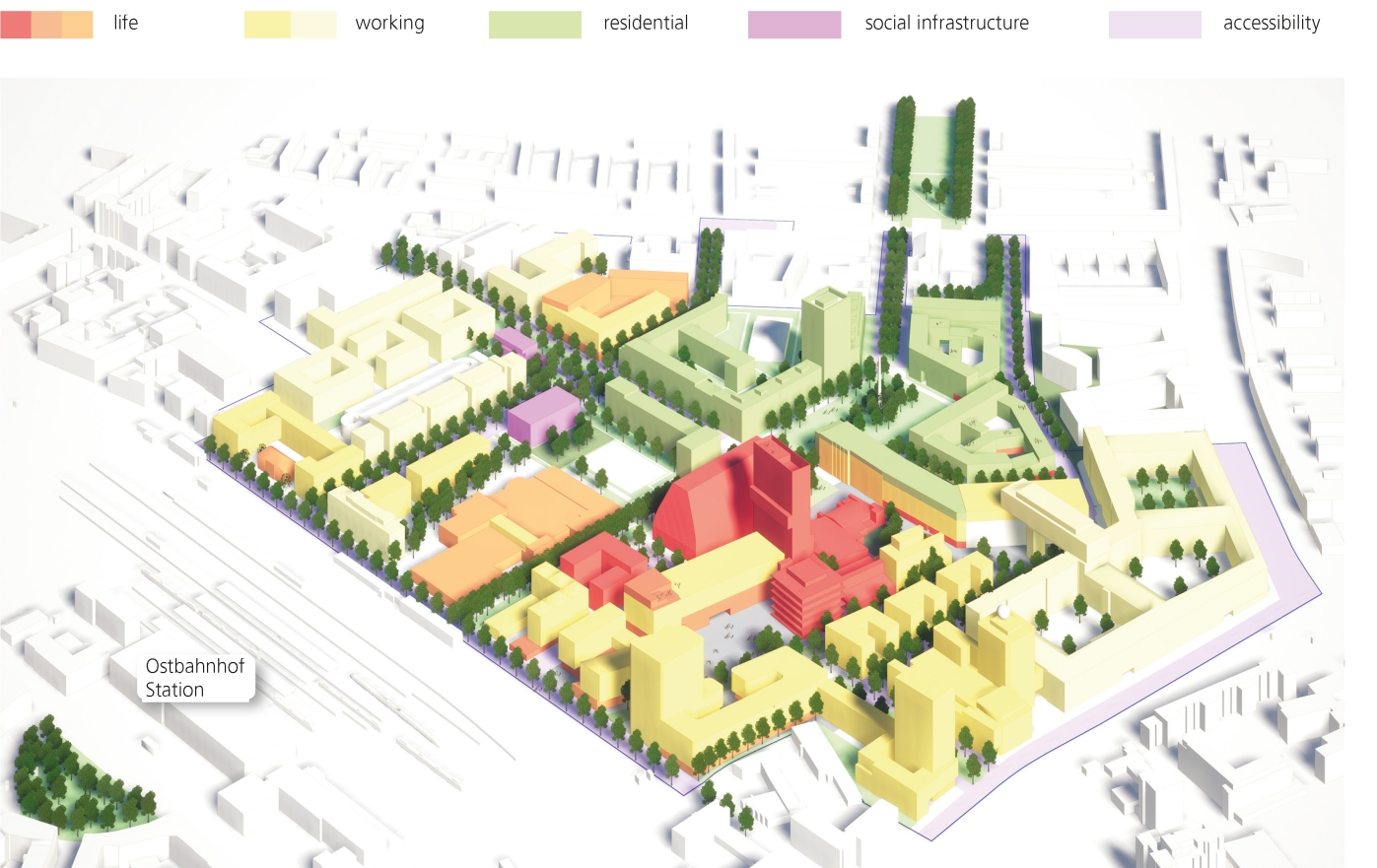 The Werksviertel is connected to the core of Munich by the Ostbahnhof in the north and functions as urban interface.