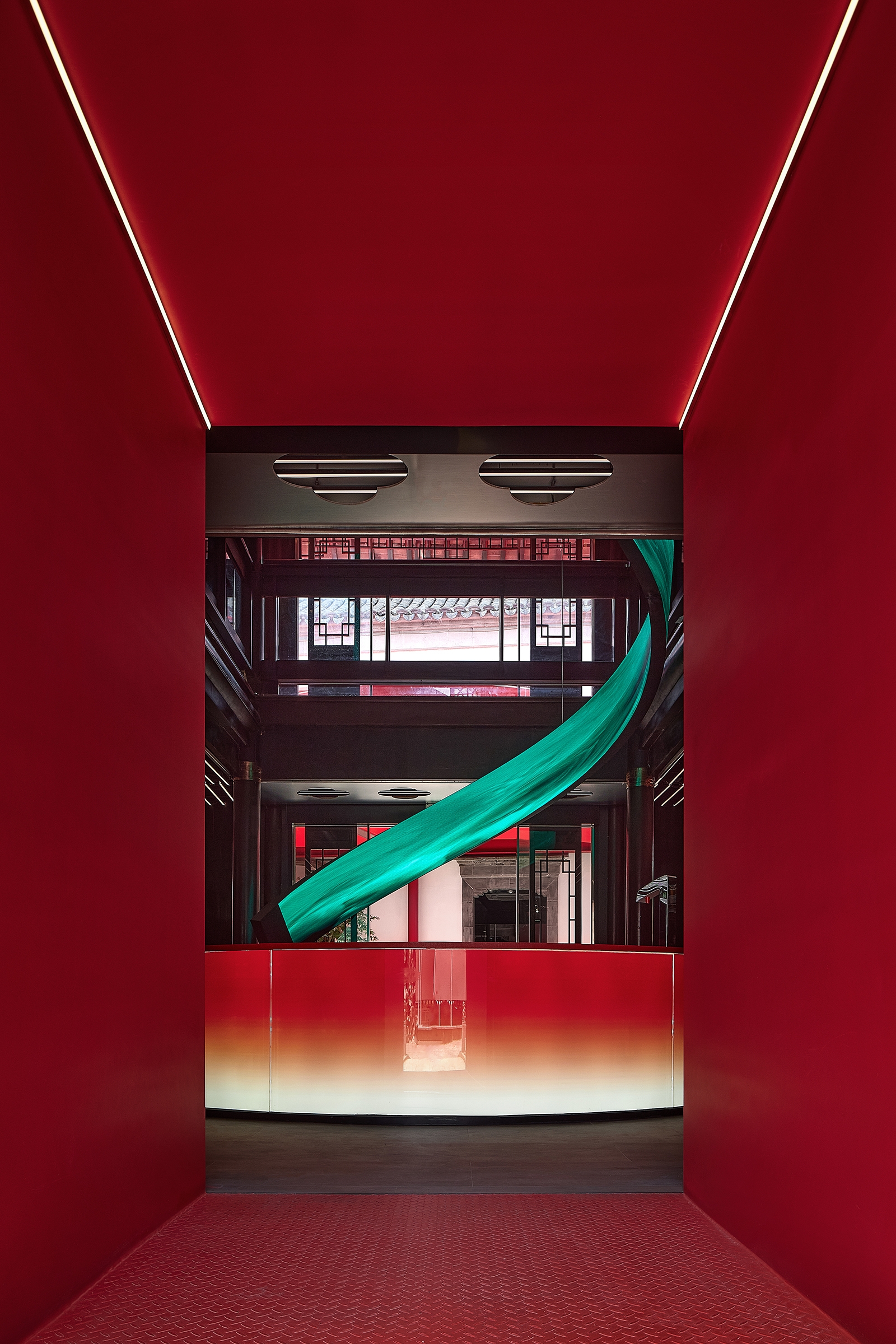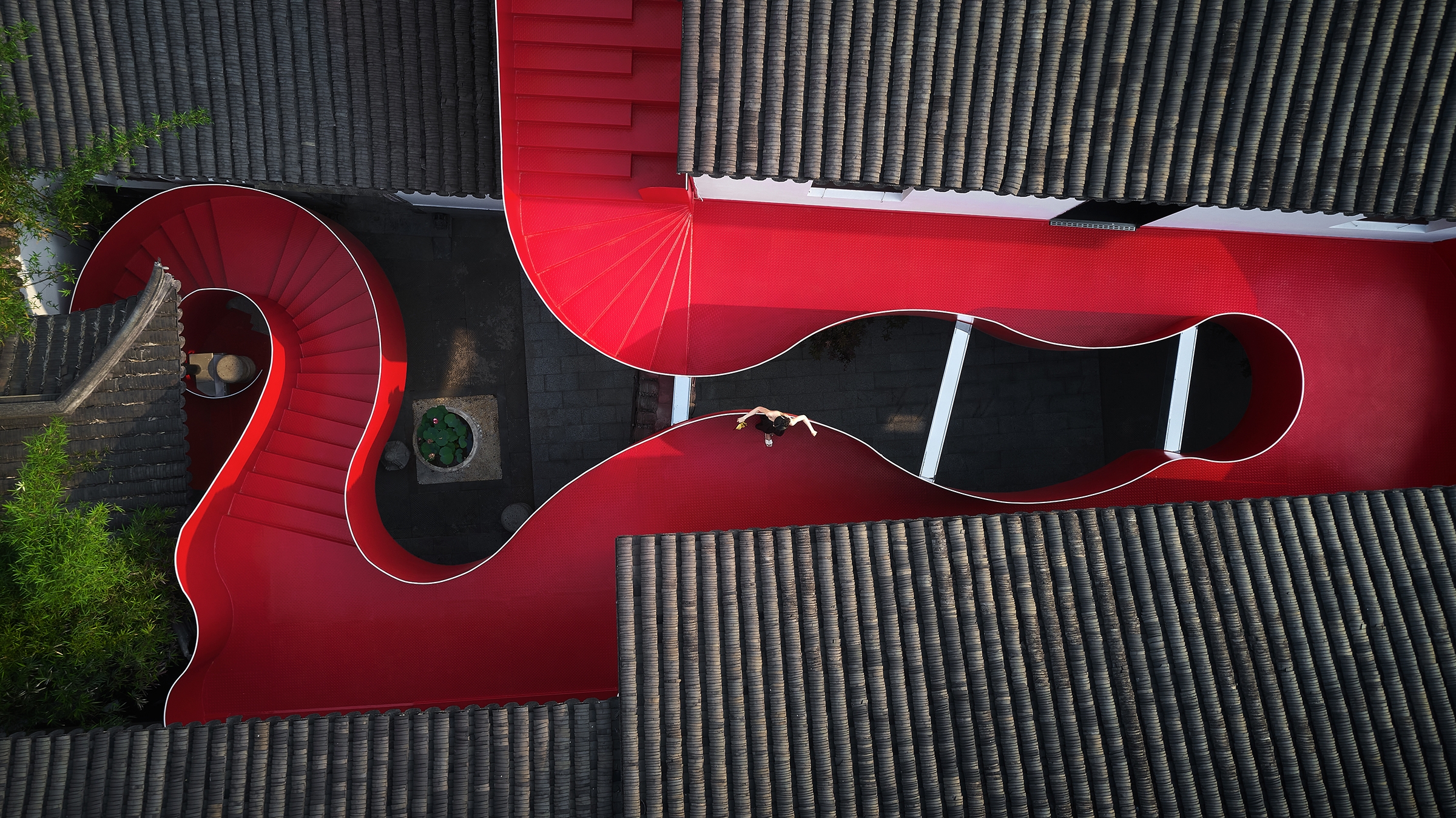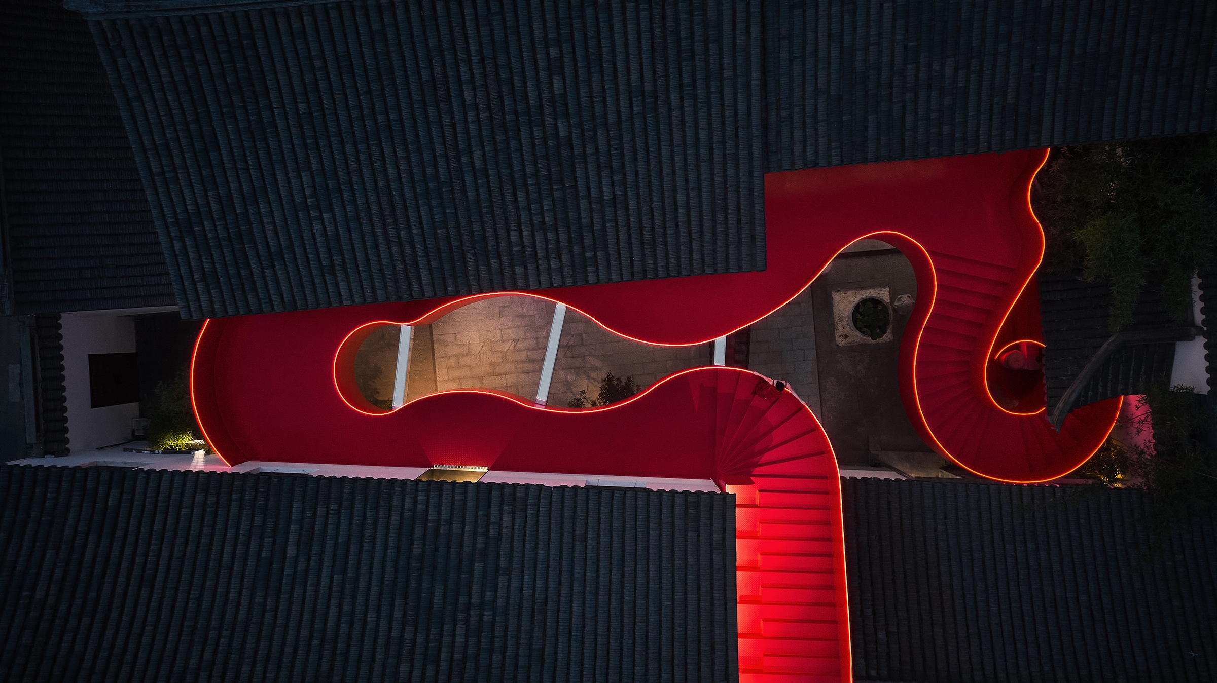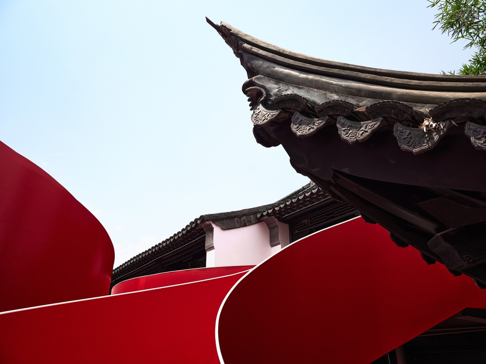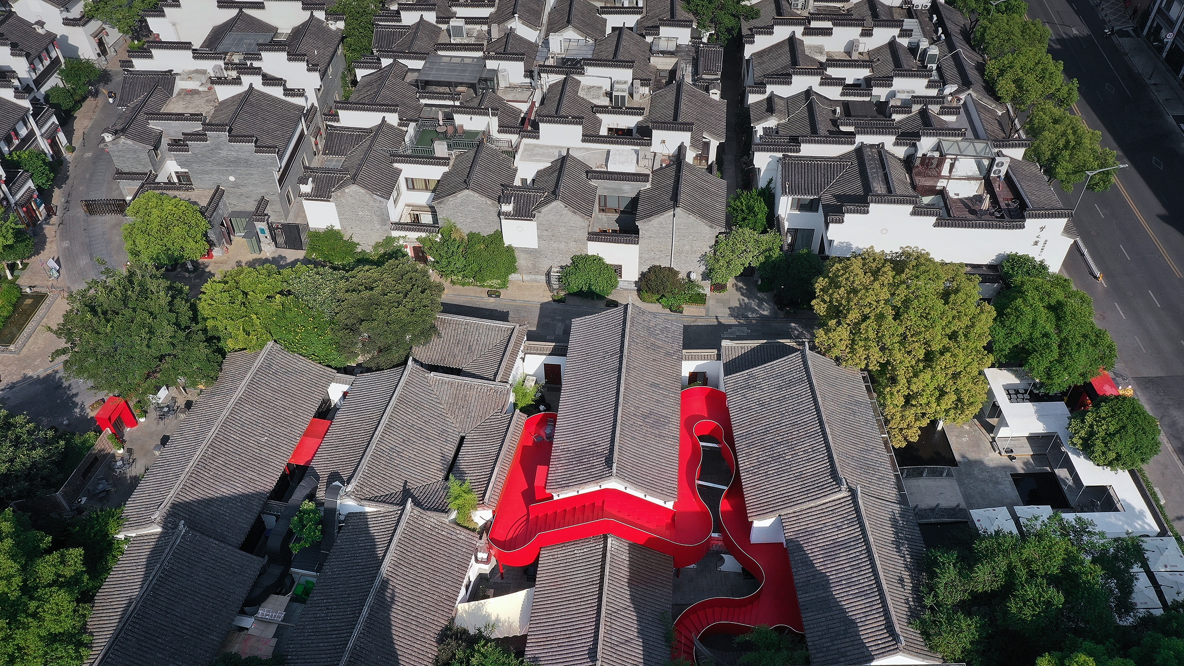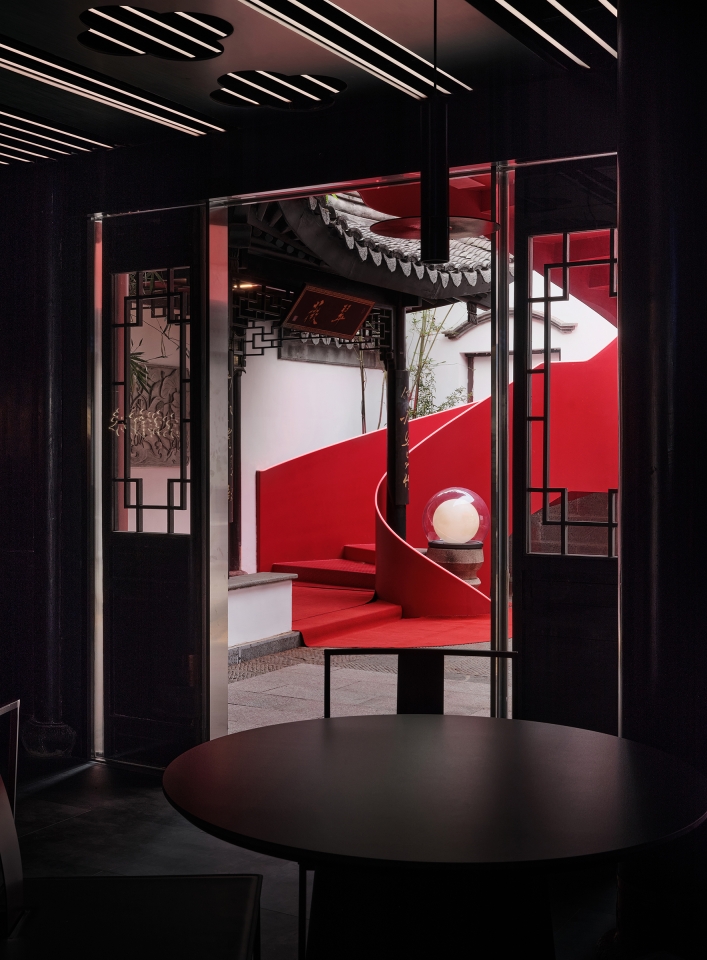 The Big Red Crayfish project, located along the Qinhuai River in Nanjing, creatively blends historical preservation with modern design, transforming a 2,000-square-meter site into a unique dining and commercial space centered around crayfish. This project showcases innovation by integrating modern materials such as metal and glass with traditional Chinese architectural styles, like pavilions and terraces. The design merges minimalist lines with intricate details, creating a fusion of ancient and futuristic aesthetics. A streamlined steel staircase, symbolizing a “guardian dragon,” unites four courtyard buildings, serving as both a practical connection and a striking visual landmark. The vibrant red staircase embodies the theme of the “Big Red Crayfish,” increasing its appeal and becoming a popular photo spot, which boosts commercial traffic. By fusing Eastern and Western design principles, it offers a dynamic space that respects cultural heritage while embracing contemporary needs. The project enhances the local community by revitalizing a historic site, promoting economic growth, and providing a sustainable, vibrant space on the banks of the Qinhuai River.
