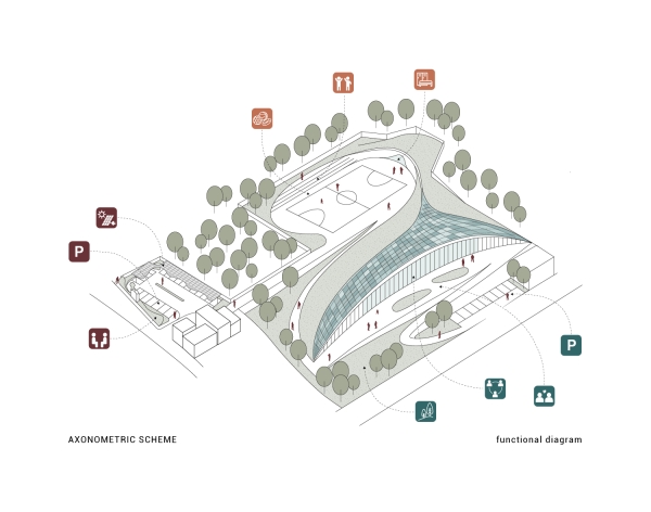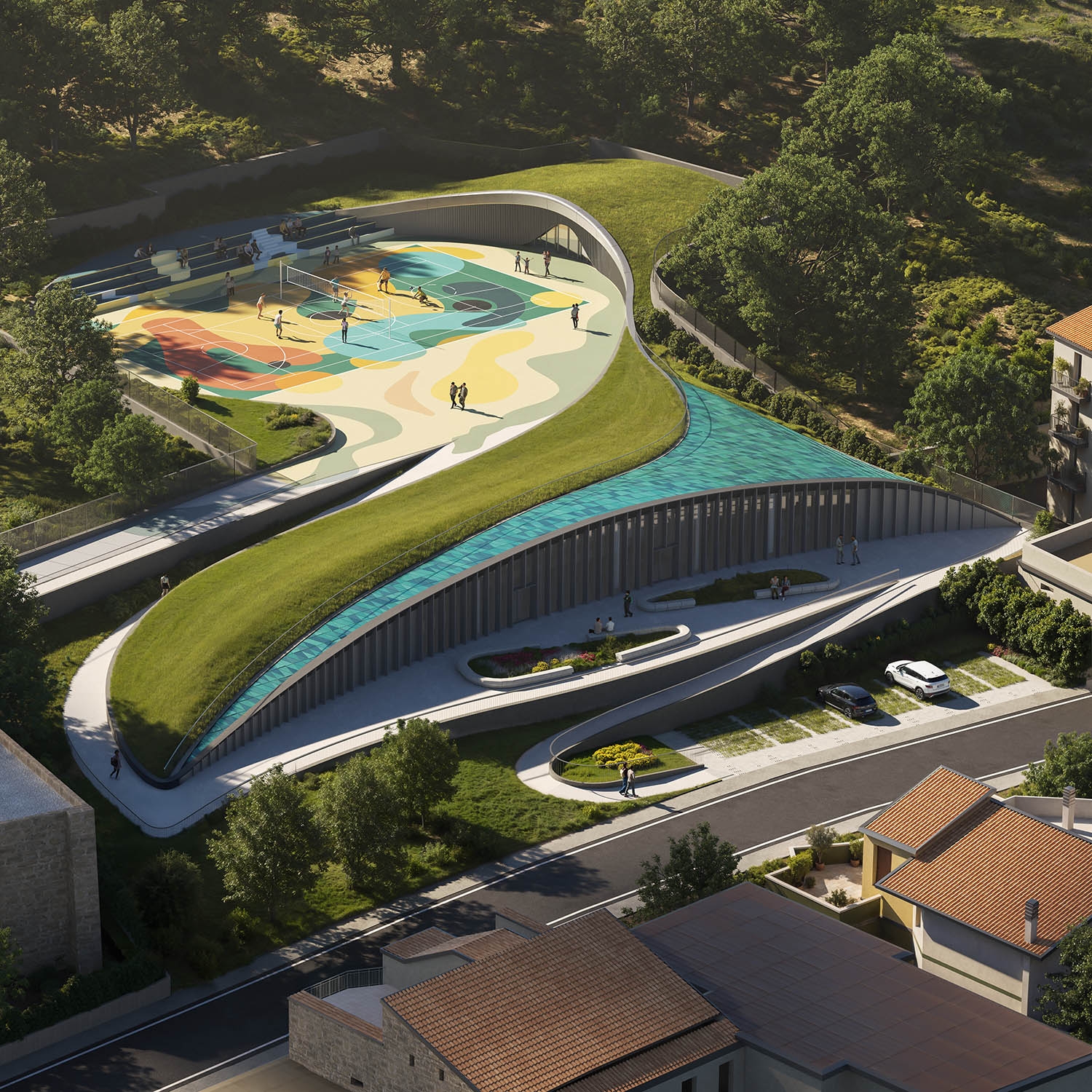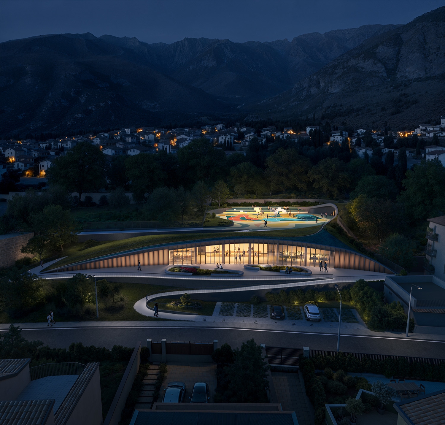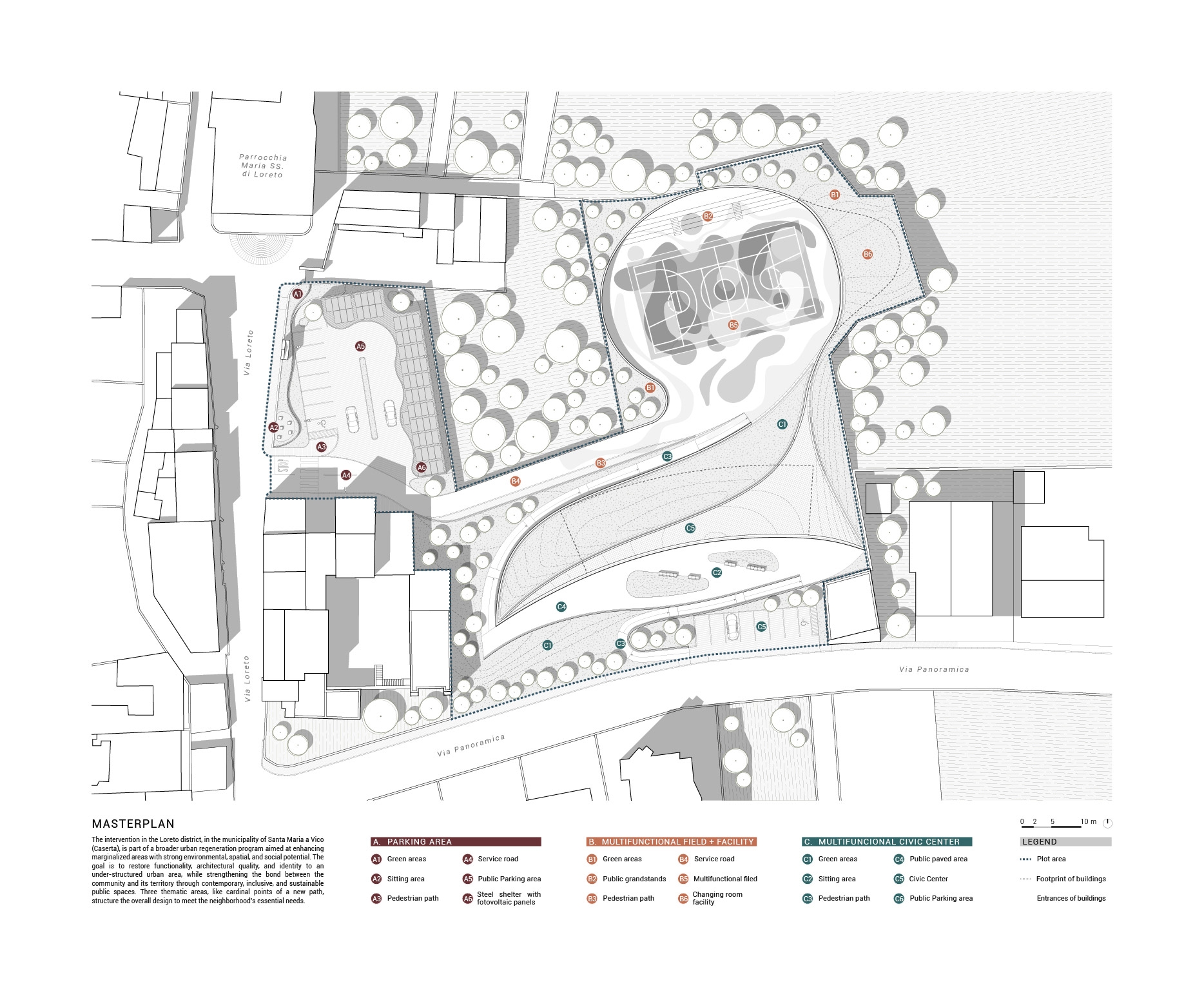 The regeneration of the Loreto district in Santa Maria a Vico is part of a broader urban program involving also Via Mandre and Via Panoramica. The project aims not only to recover abandoned areas but to transform them into vibrant places that foster community, encounter, and shared growth. Loreto regeneration is structured in three thematic areas. The first hosts a multifunctional building inspired by the natural forms of the surrounding landscape, designed as a dynamic center for culture, exhibitions, conferences, and collective work. The second area is dedicated to sports and socialization, with a multipurpose field for football, basketball, and volleyball, alongside a discreetly integrated service building with locker rooms and technical spaces. The third combines functionality and sustainability through a parking area conceived as part of the landscape, with curved lines, greenery, and accessible pedestrian paths. Sustainable rainwater management, low-consumption lighting, and eco-friendly materials reduce environmental impact. Loreto thus becomes a model of sustainable urban development, where modernity and nature coexist in harmony and design strengthens collective identity.