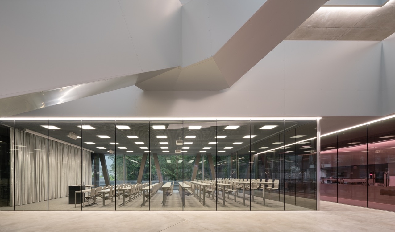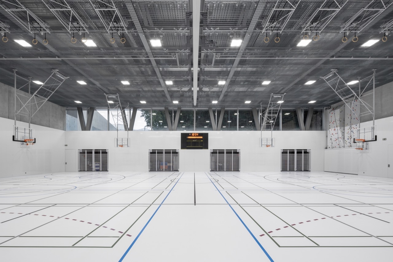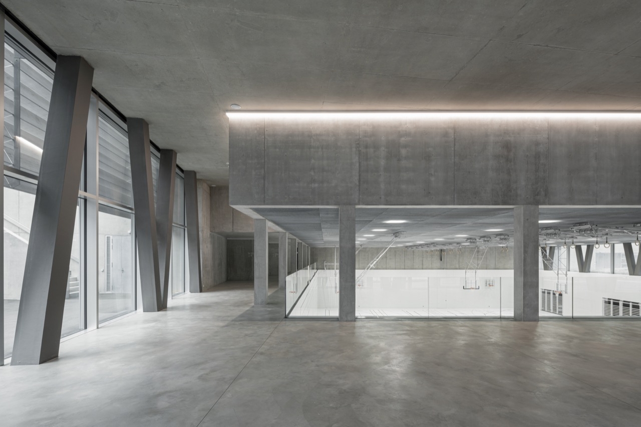 The concrete structure addresses the challenges of overlapping functions, particularly with the double gymnasium situated below. Peripheral load-bearing walls and V-shaped supports ensure seismic stability.