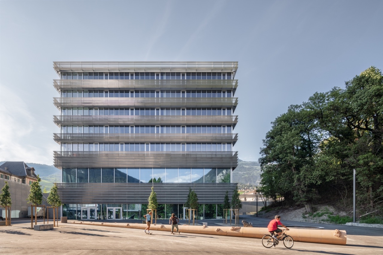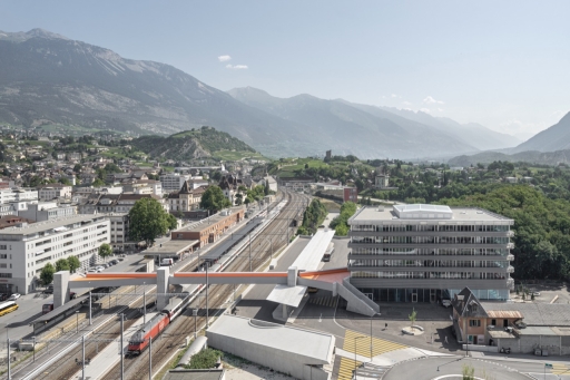 The new business and general education school plays a key role in Sierre's urban development, extending beyond the CFF railway tracks into the Bellevue plain. Located near the University of Applied Social Sciences, it strengthens the area's educational infrastructure. The site takes advantage of the natural slope to organize its programs: the main entrance connects to the train station and pedestrian bridge, while the gymnasium entrance is on the lower level.