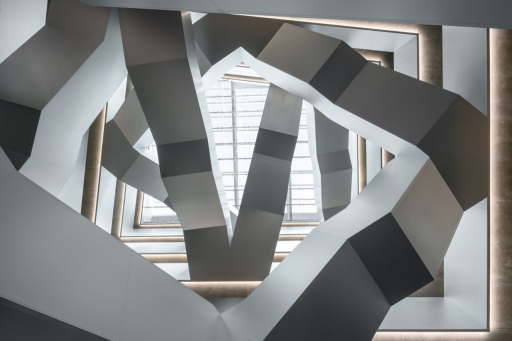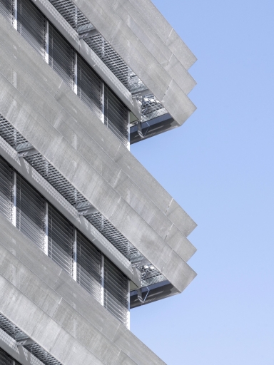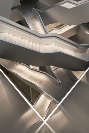 The sleek glass façades, complemented by polished stainless steel guardrails, highlight the building’s modernity. Inside, the use of minimalist materials such as exposed concrete, glass, and aluminum creates a refined and contemporary atmosphere.