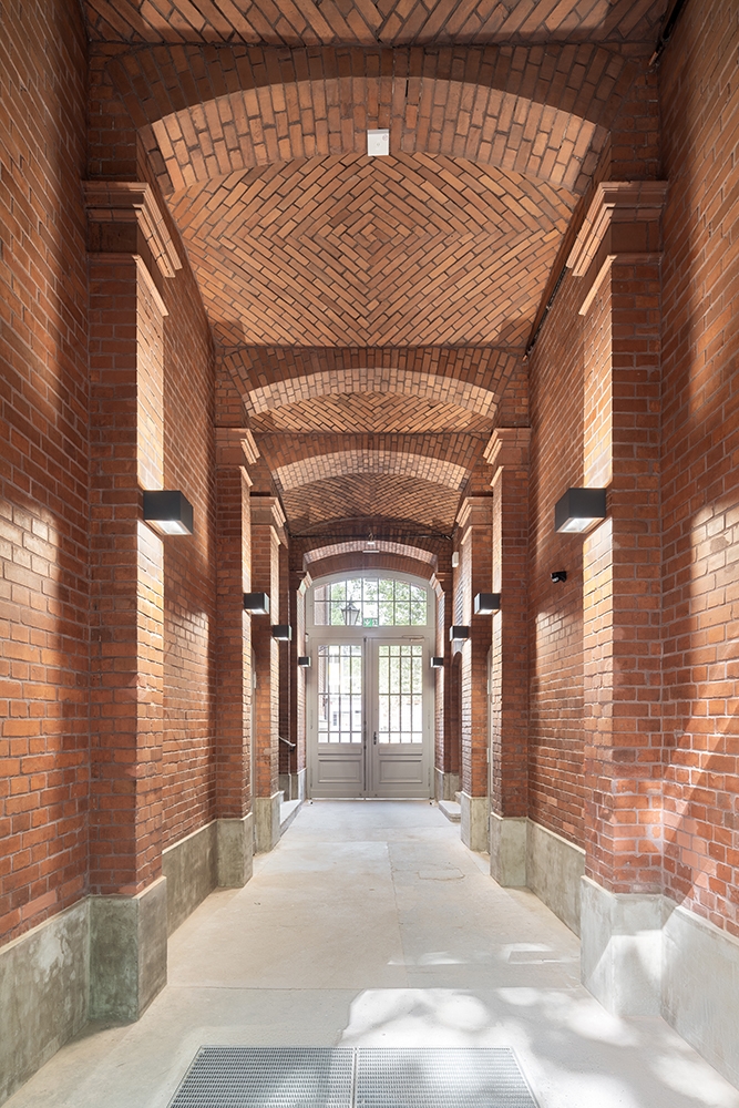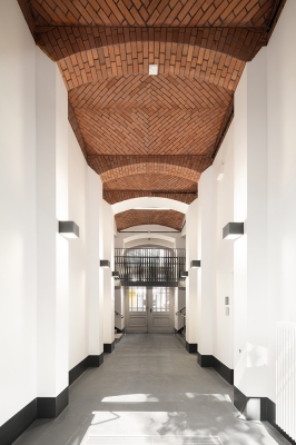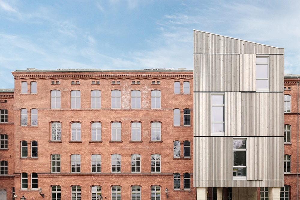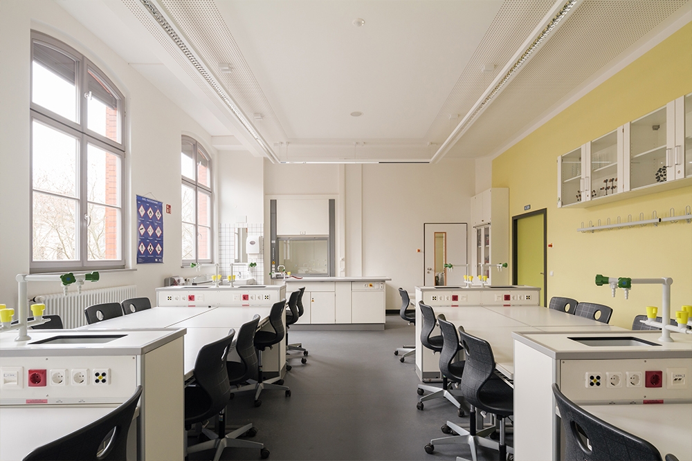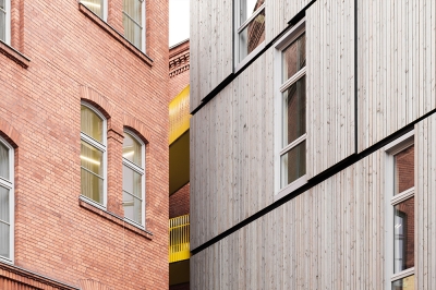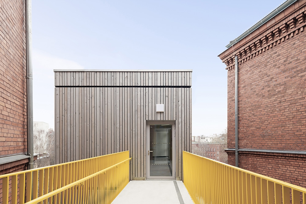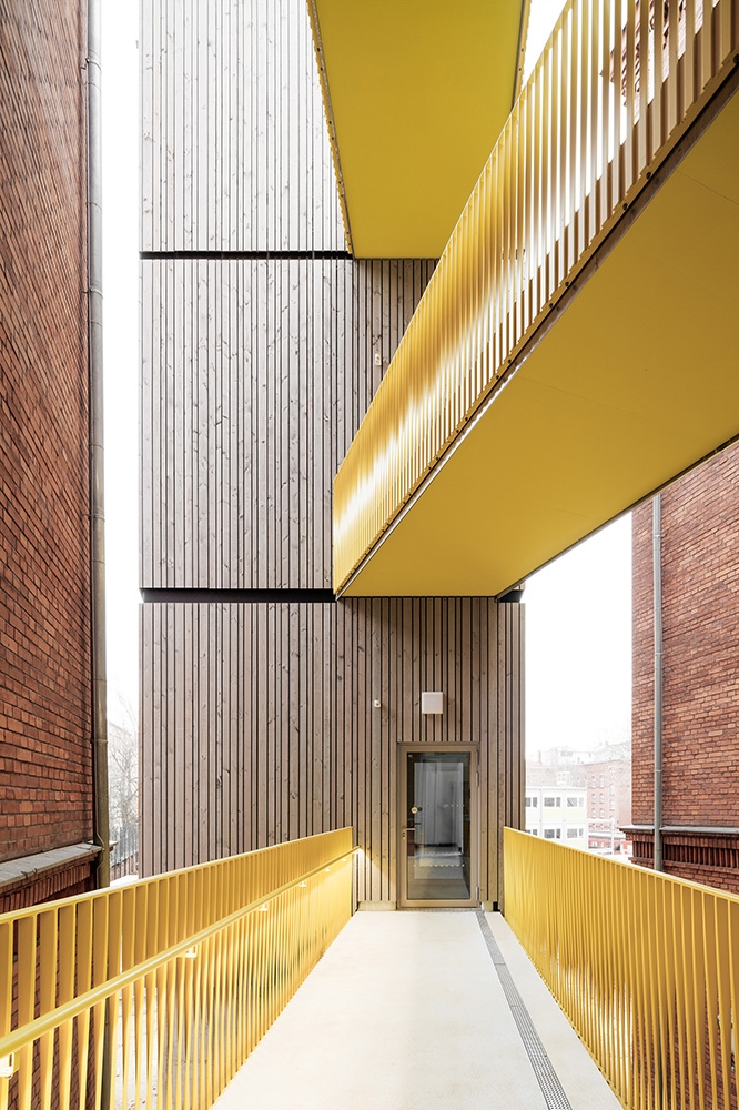 The protected school was extended with a modern architectural design. The main building was renovated. The new building complements the existing structure. The three-storey extension distances itself respectfully from the red masonry building. A modern façade made of vertical larch wood was chosen as a contrast. In addition to the expressive cubature, the joints be-tween the storeys and the sliding elements lend plasticity. The columns give the structure of the extension a floating effect. The existing building is connected to the extension by four yel-low bridges. Special rooms are housed here.