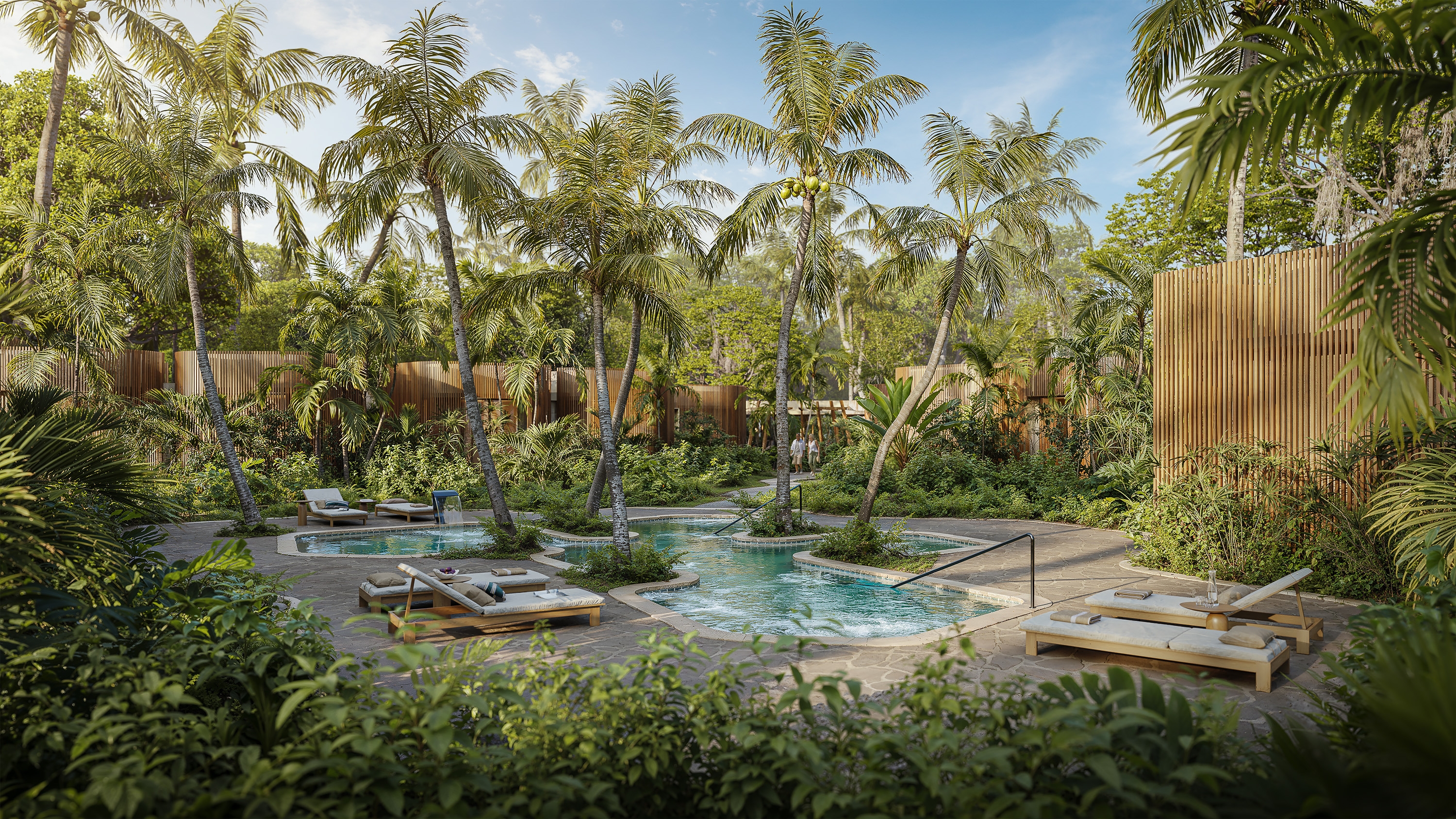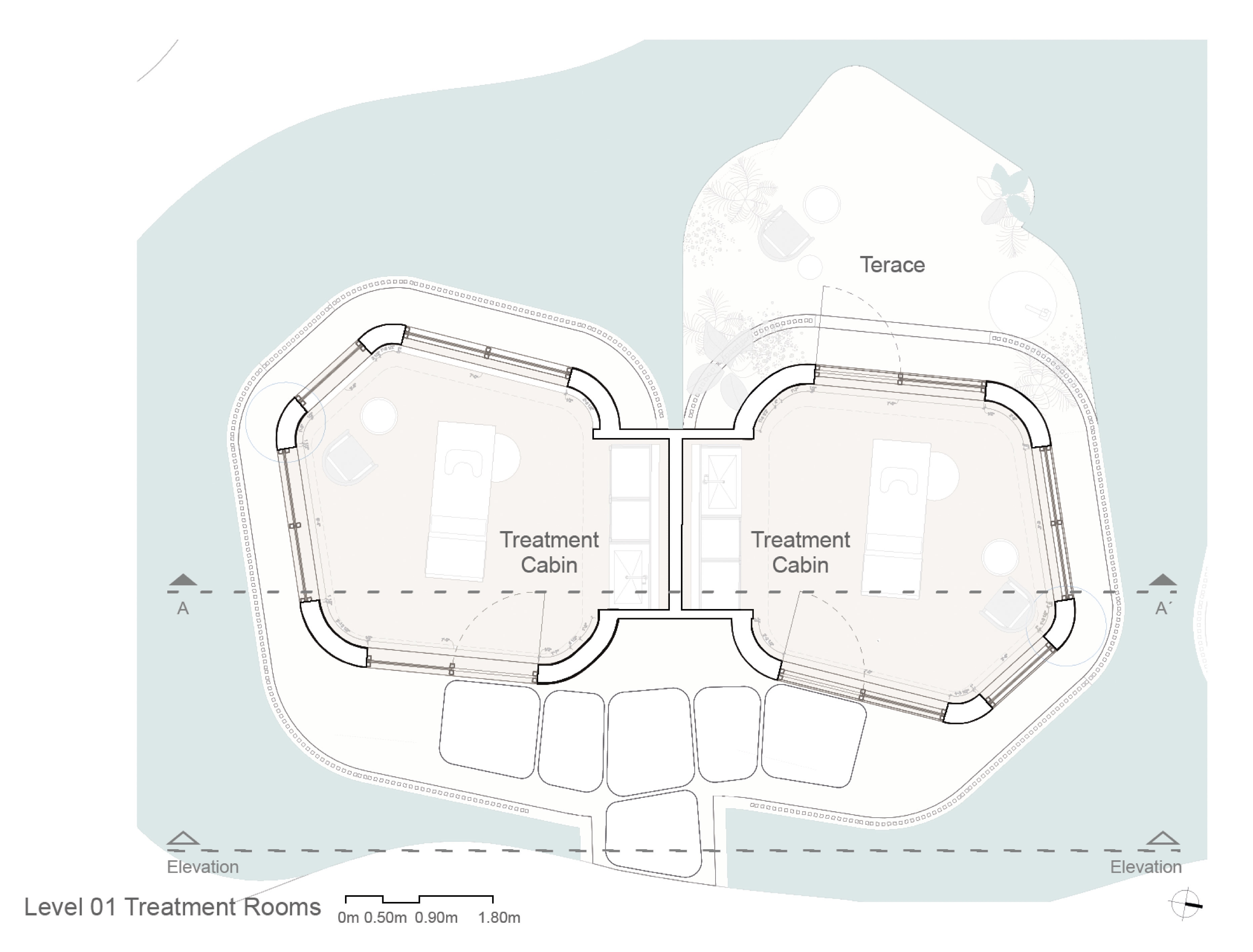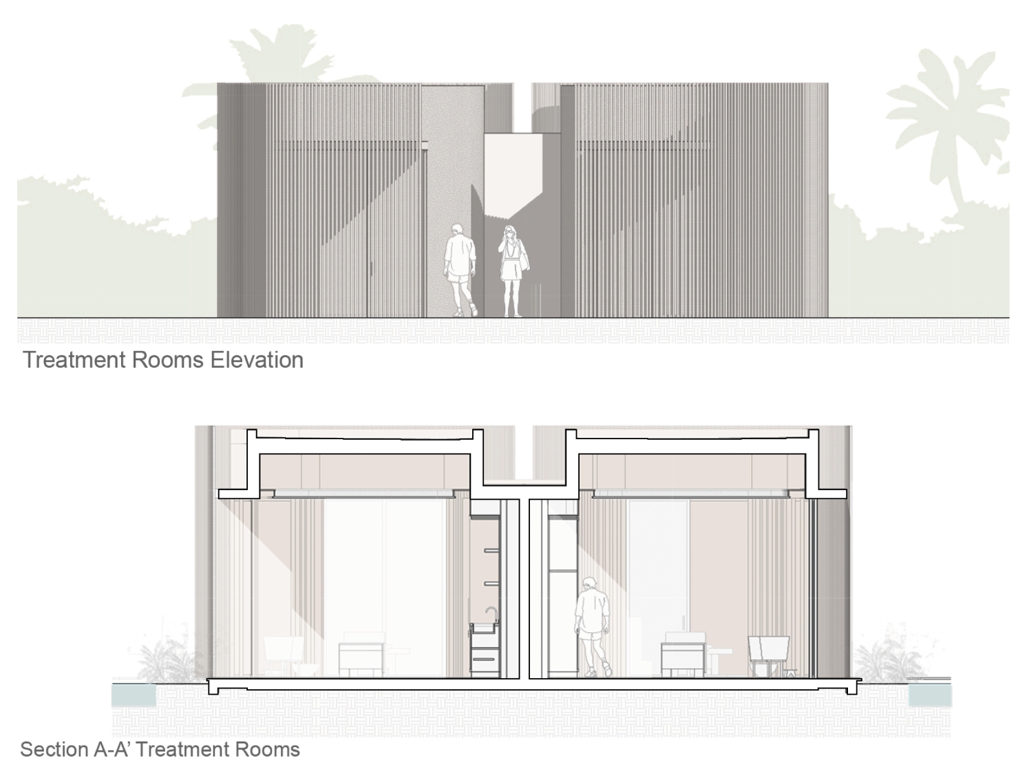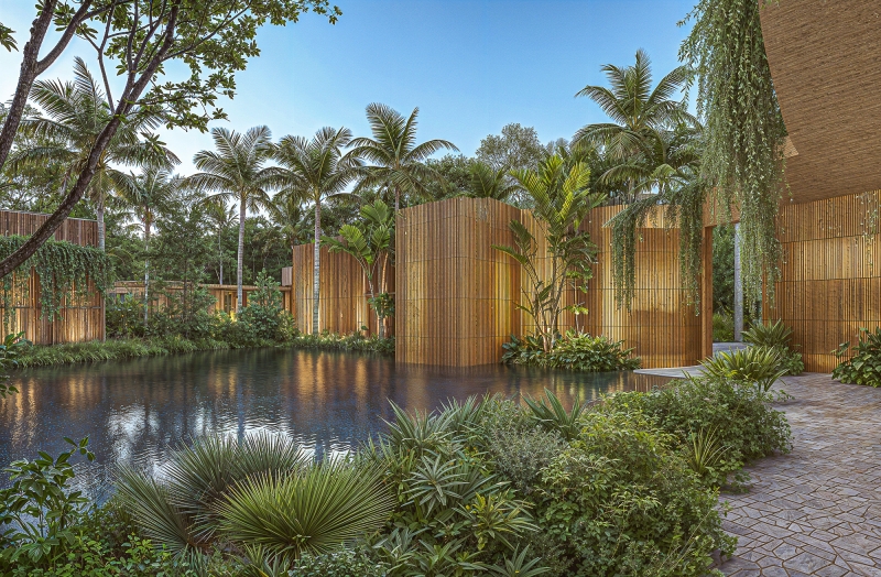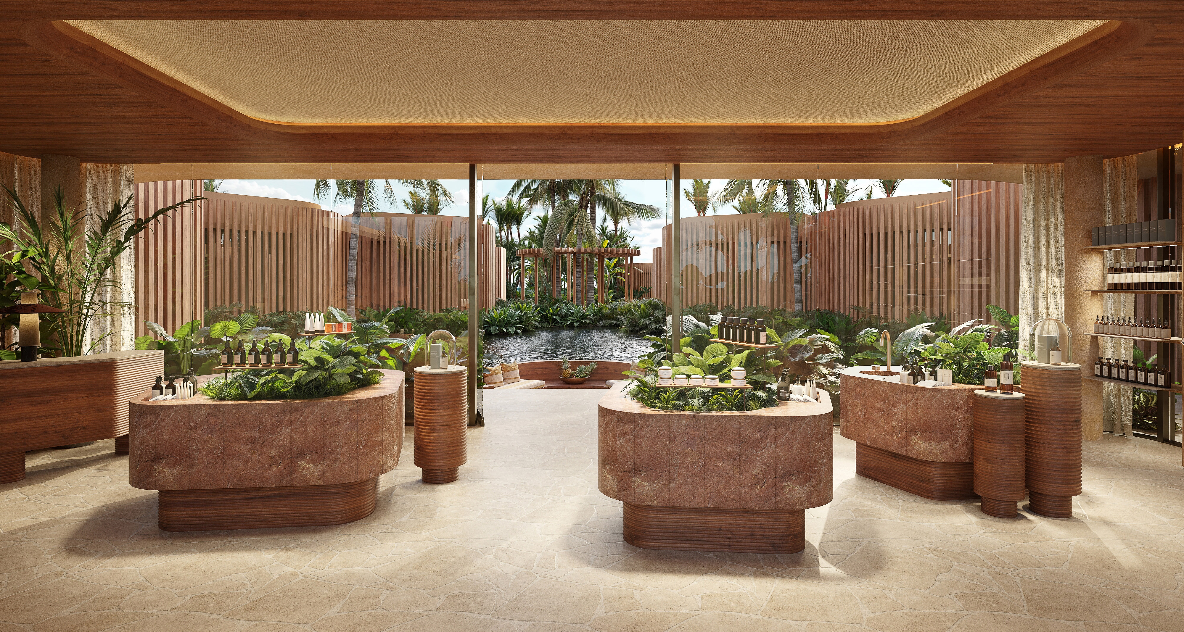 The architecture was inspired by the the pineapple’s hexagonal shell, an enduring symbol of Bahamian agrarian traditions. The design, developed by a modular system of interlocking and independent pavilions complemented by a rectilinear lobby and fitness center organized around a series of stone totems made out of limestone, quartzite and dark wood, is set within a tropical garden and linked by bridges across water ponds, creating fluid transitions between relaxation, and wellness spaces. The water ponds function as rainwater reservoirs for the spa and golf course.