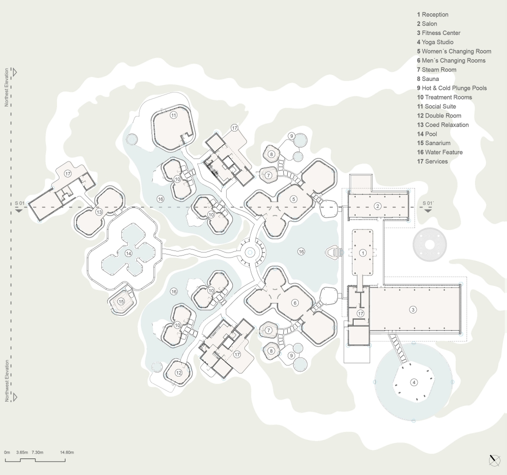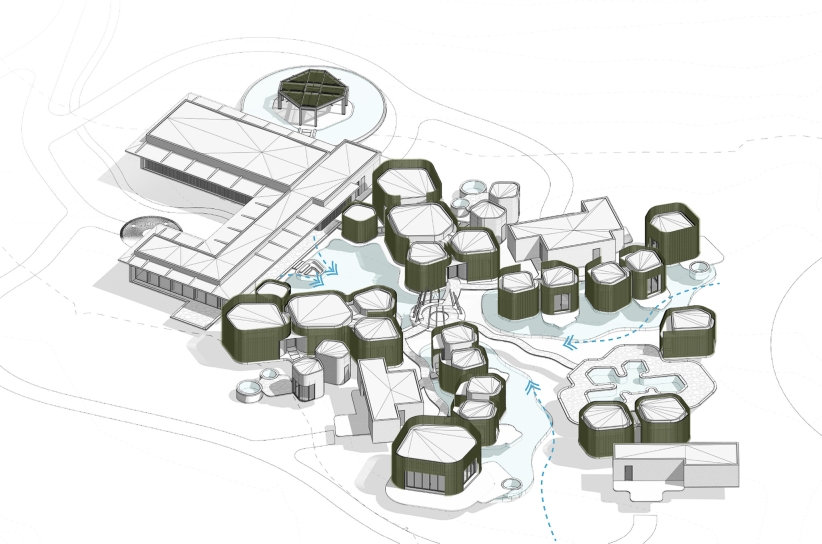 The Ananas Spa embodies the future of wellness architecture through its geometry, materiality and ecological integration. The project forms an essential component of the resort´s master plan designed by the same studio.