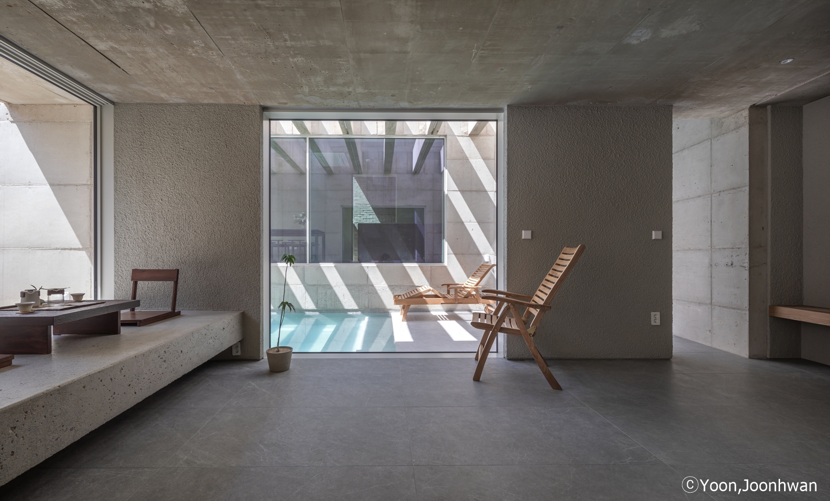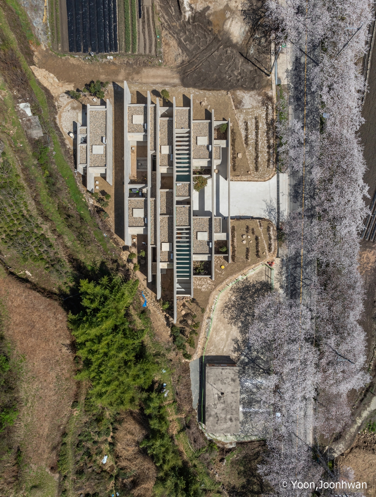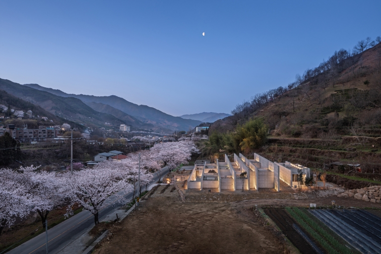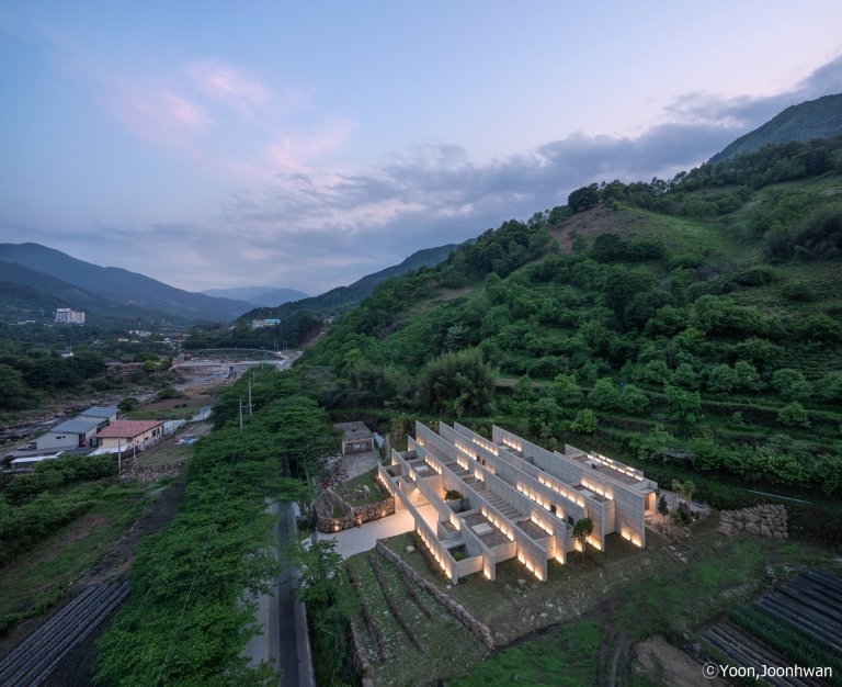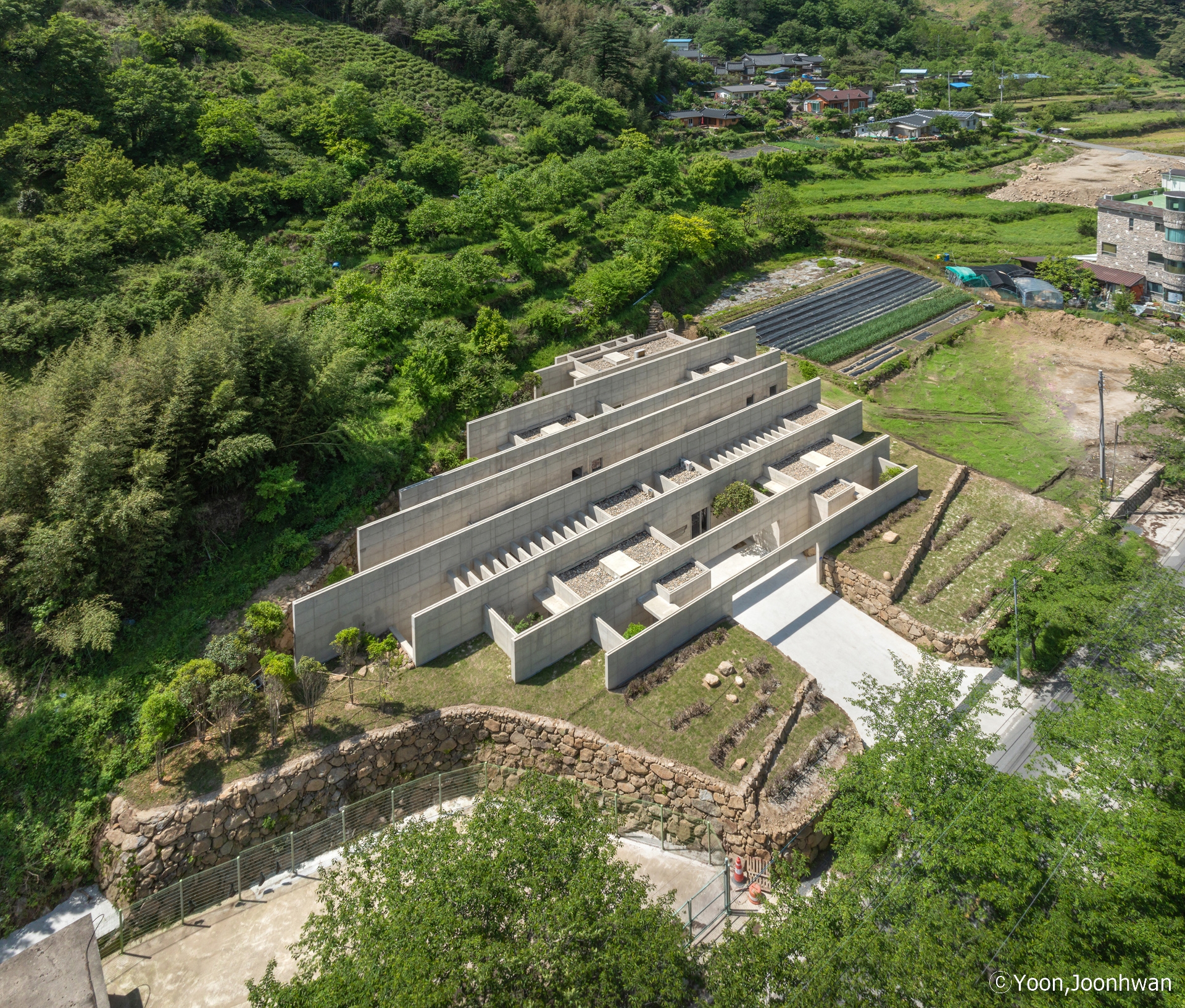 Nestled in the deep mountain valley of Ssanggyesa, Hadong—within the scenic slopes of Jirisan—the site is surrounded by centuries-old terraced green tea fields shaped by stone walls and rhythmic planting lines. Rather than asserting itself, the architecture seeks to dissolve into this landscape, continuing the memory of the land.