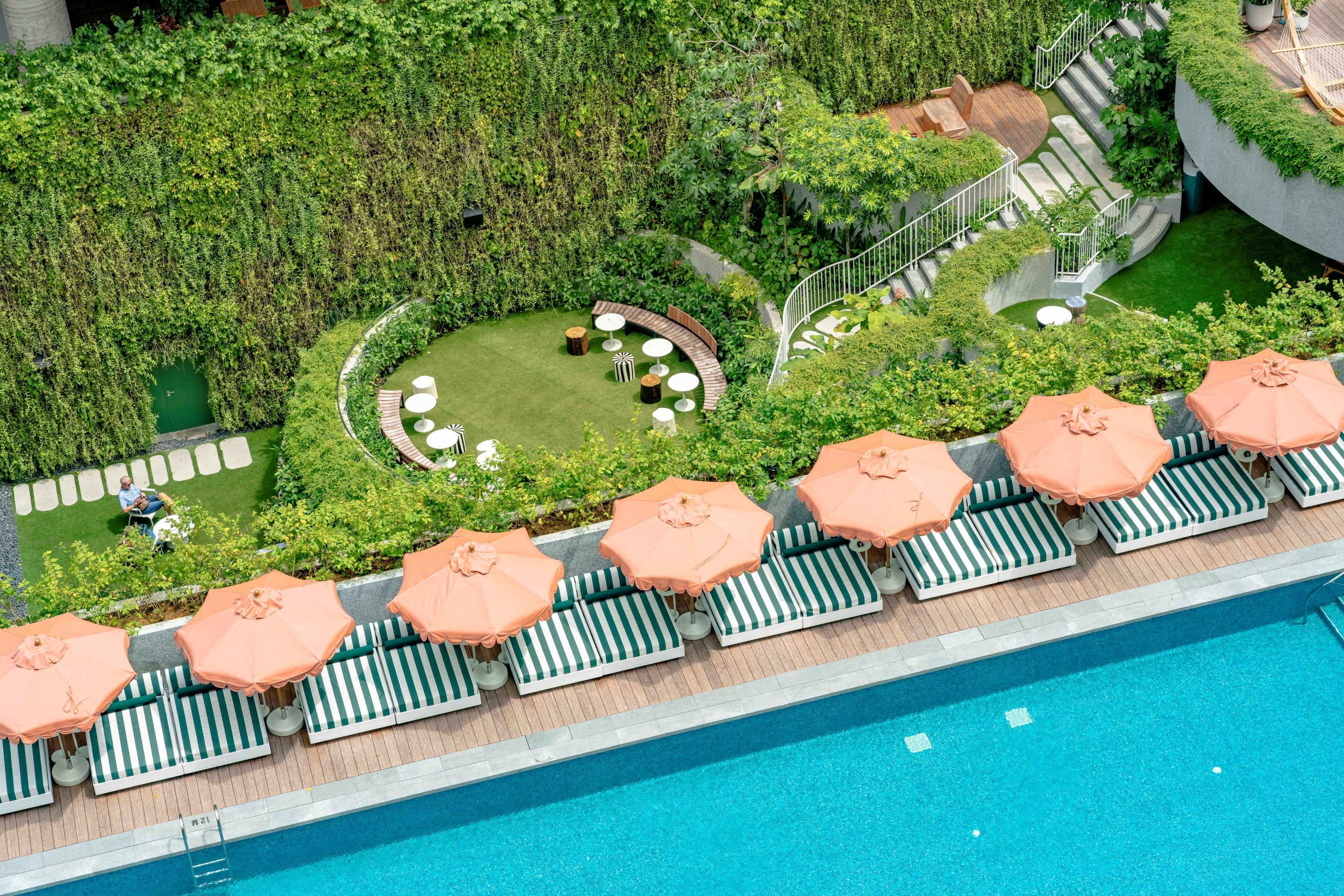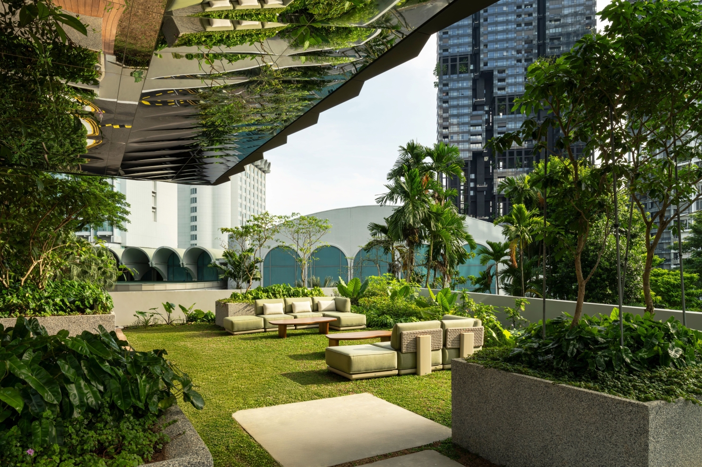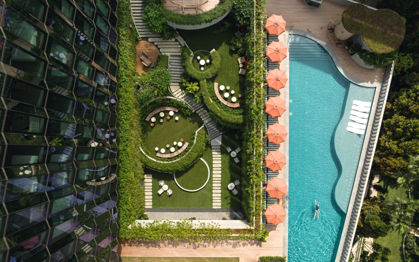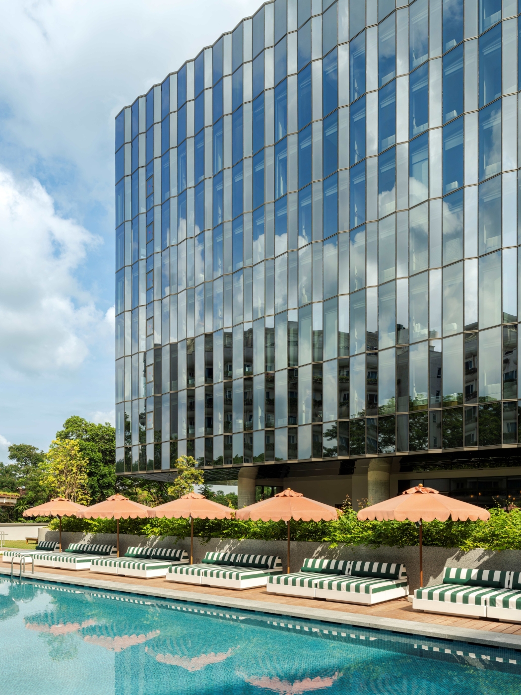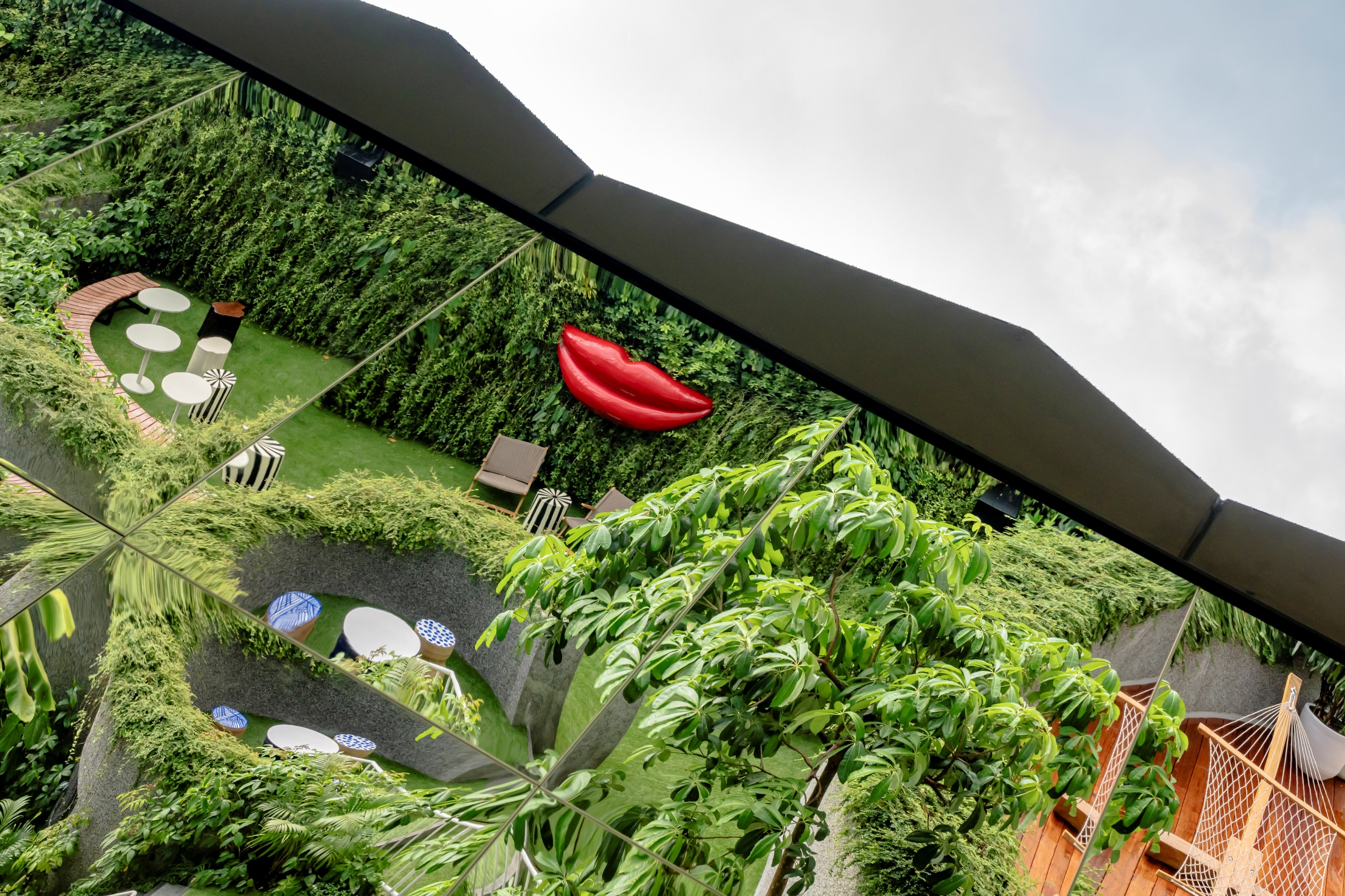 The Standard, Singapore resides along Orange Grove Road, nestled among some of Singapore’s most prestigious addresses . It is a stone’s throw from the 150-year-old UNESCO-honoured Botanic Gardens and close to the bustle of Orchard Road—akin to New York’s Fifth Avenue. Amidst the demure volumes of mostly residential blocks lining the stretch between Botanic Gardens and Orchard Road, the hotel’s eight-storey form stands out with a lenticular façade that shimmers, coyly beckoning visitors towards the twists of amenities concealed in the hotel podium below. Arriving at the drop-off point, guests are greeted by a cantilevered tower and a mirrored ceiling of striking reflectivity. Stepping inside, the interior brings guests into an alternative interpretation of pop-biophilia, where the reception and café allude to a hidden tropical oasis. The podium houses a secret courtyard, a semi-secluded cave room and stepped terraces that offer various modes of self-expression, culminating in the landscaped pool deck and all-day dining, the nexus of the hotel’s social activities. These social spaces are designed to encourage serendipitous encounters while reflecting the brand’s quirky character.