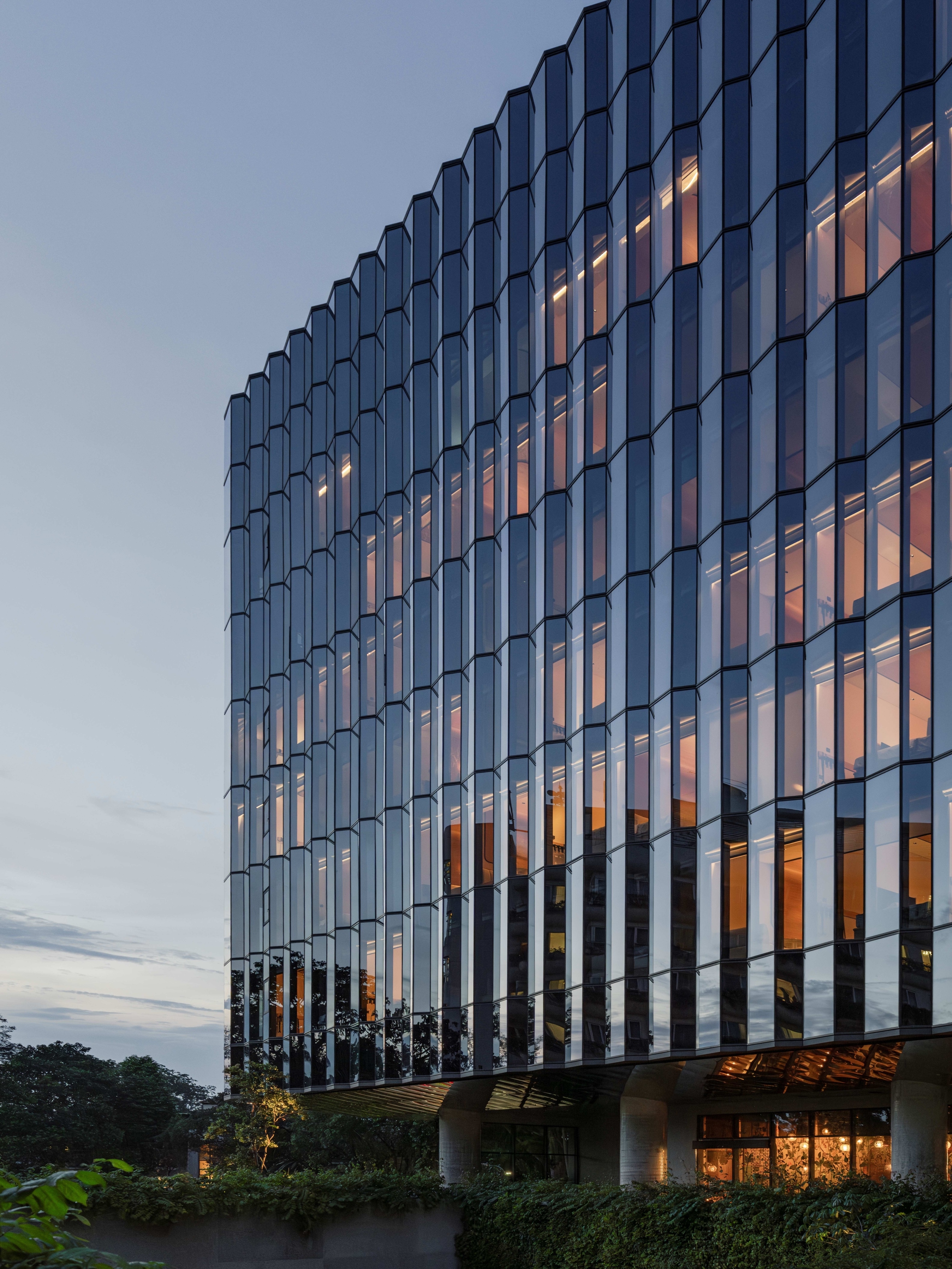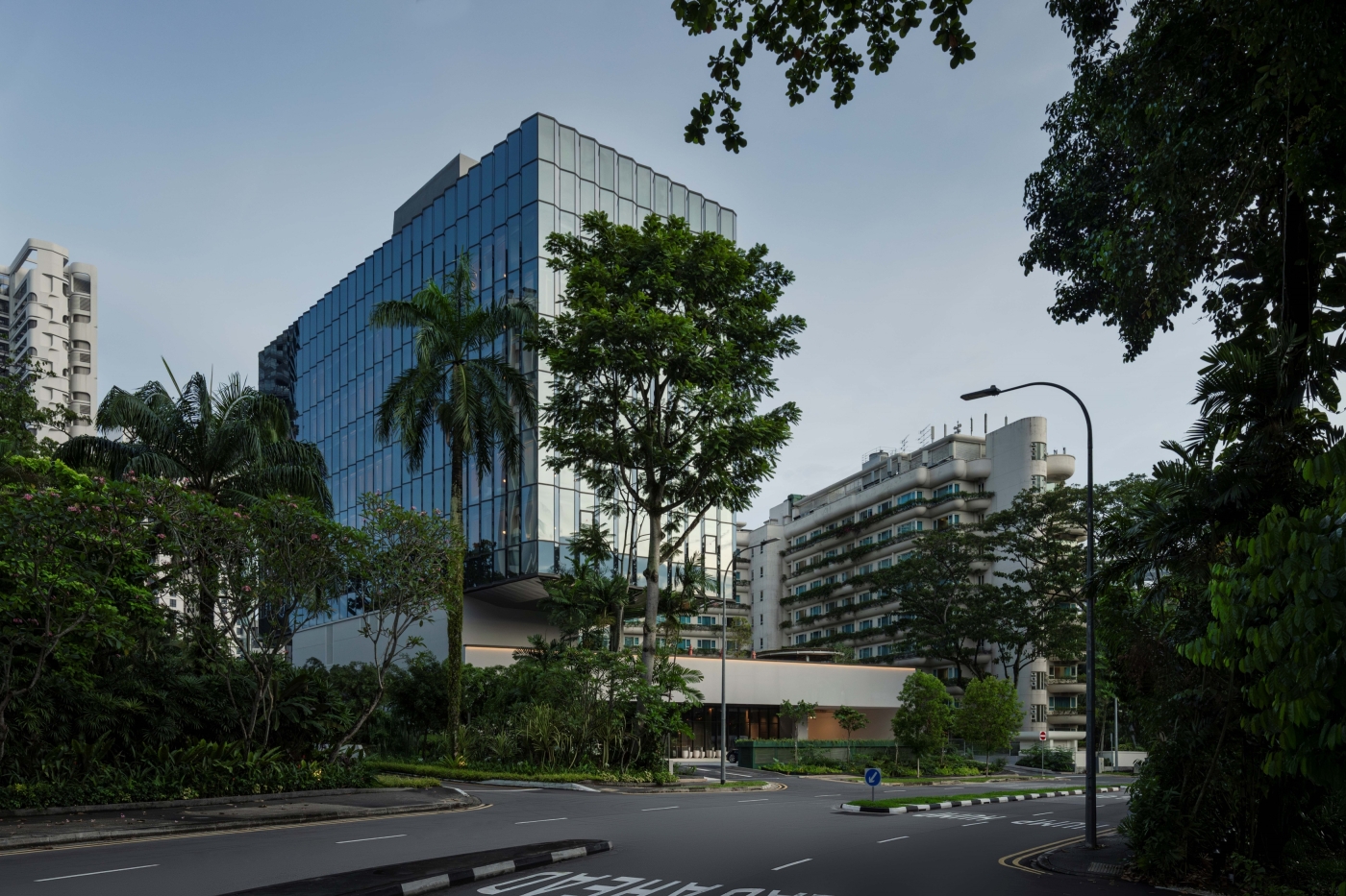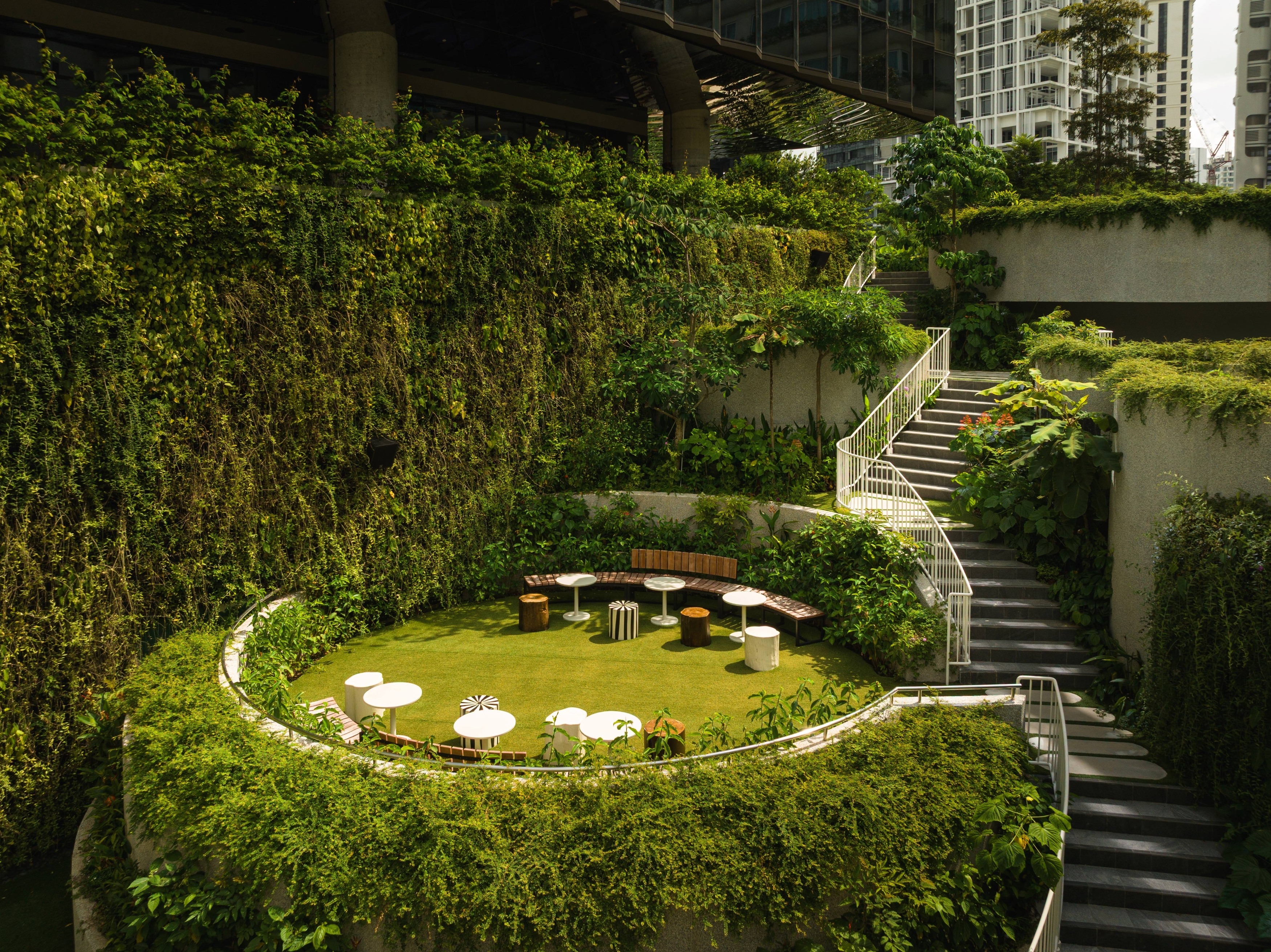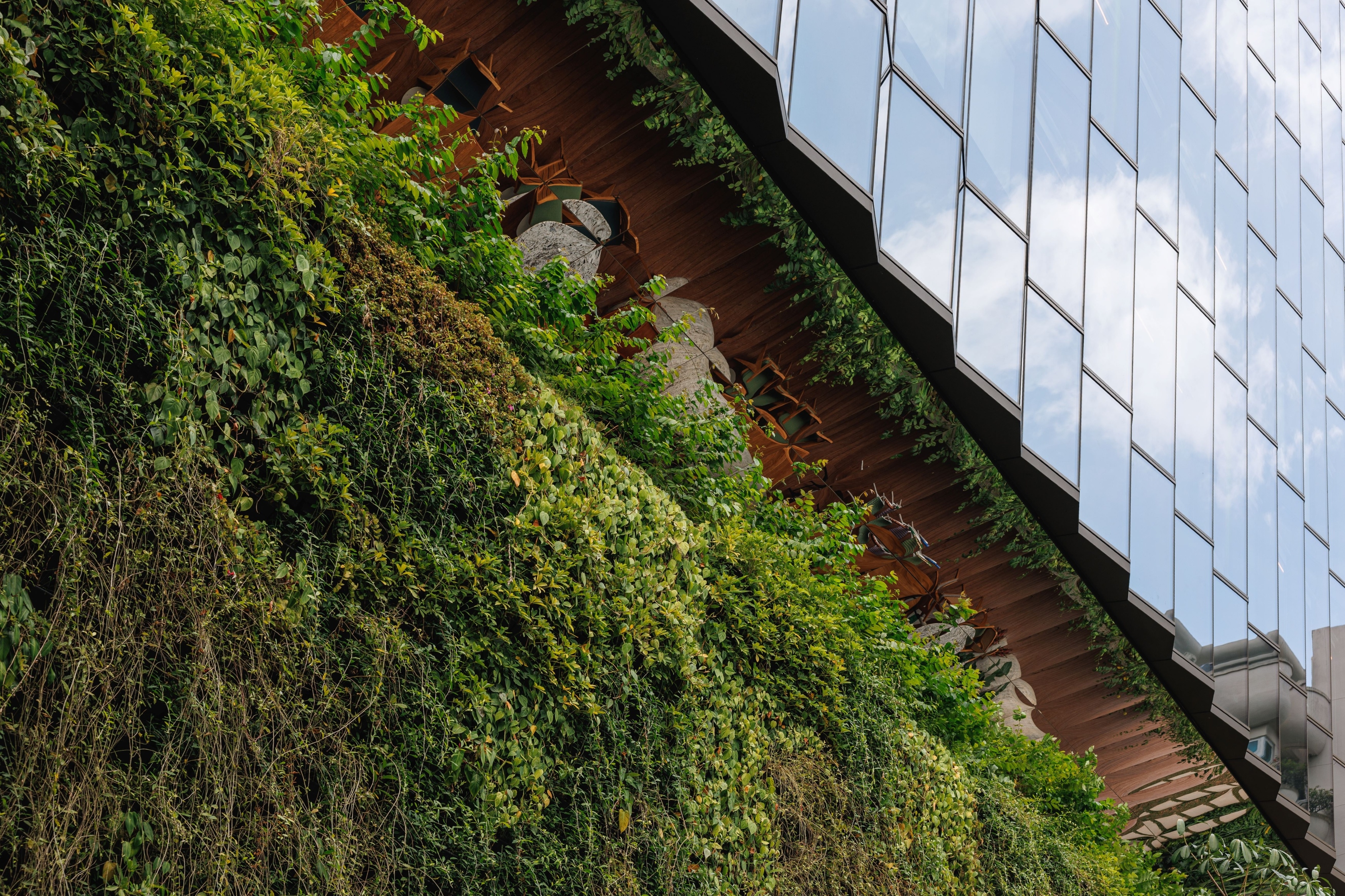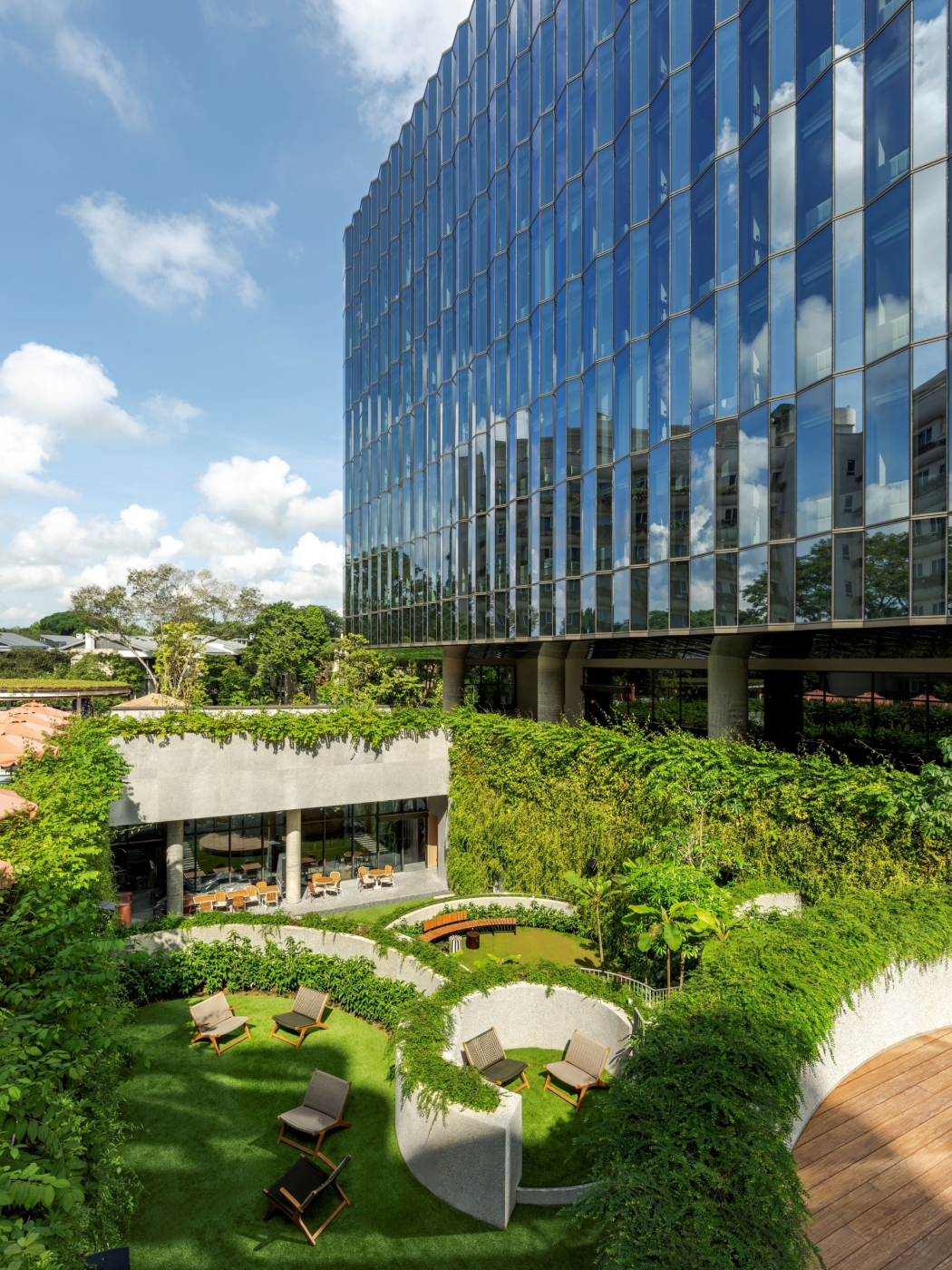 The Standard, Singapore resides along Orange Grove Road, nestled among some of Singapore’s most prestigious addresses . It is a stone’s throw from the 150-year-old UNESCO-honoured Botanic Gardens and close to the bustle of Orchard Road—akin to New York’s Fifth Avenue. Amidst the demure volumes of mostly residential blocks lining the stretch between Botanic Gardens and Orchard Road, the hotel’s eight-storey form stands out with a lenticular façade that shimmers, coyly beckoning visitors towards the twists of amenities concealed in the hotel podium below. Arriving at the drop-off point, guests are greeted by a cantilevered tower and a mirrored ceiling of striking reflectivity. Stepping inside, the interior brings guests into an alternative interpretation of pop-biophilia, where the reception and café allude to a hidden tropical oasis. The podium houses a secret courtyard, a semi-secluded cave room and stepped terraces that offer various modes of self-expression, culminating in the landscaped pool deck and all-day dining, the nexus of the hotel’s social activities. These social spaces are designed to encourage serendipitous encounters while reflecting the brand’s quirky character.