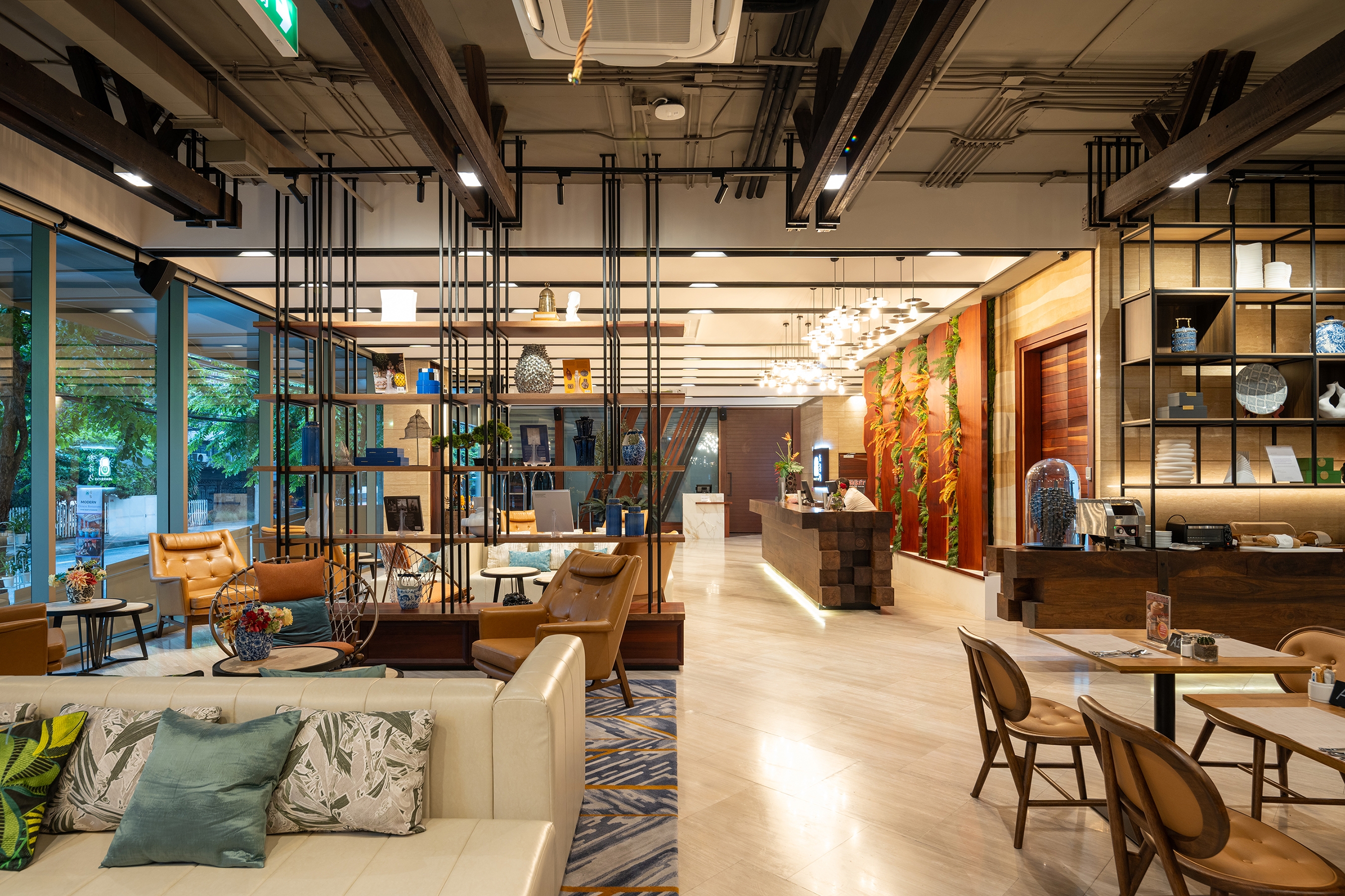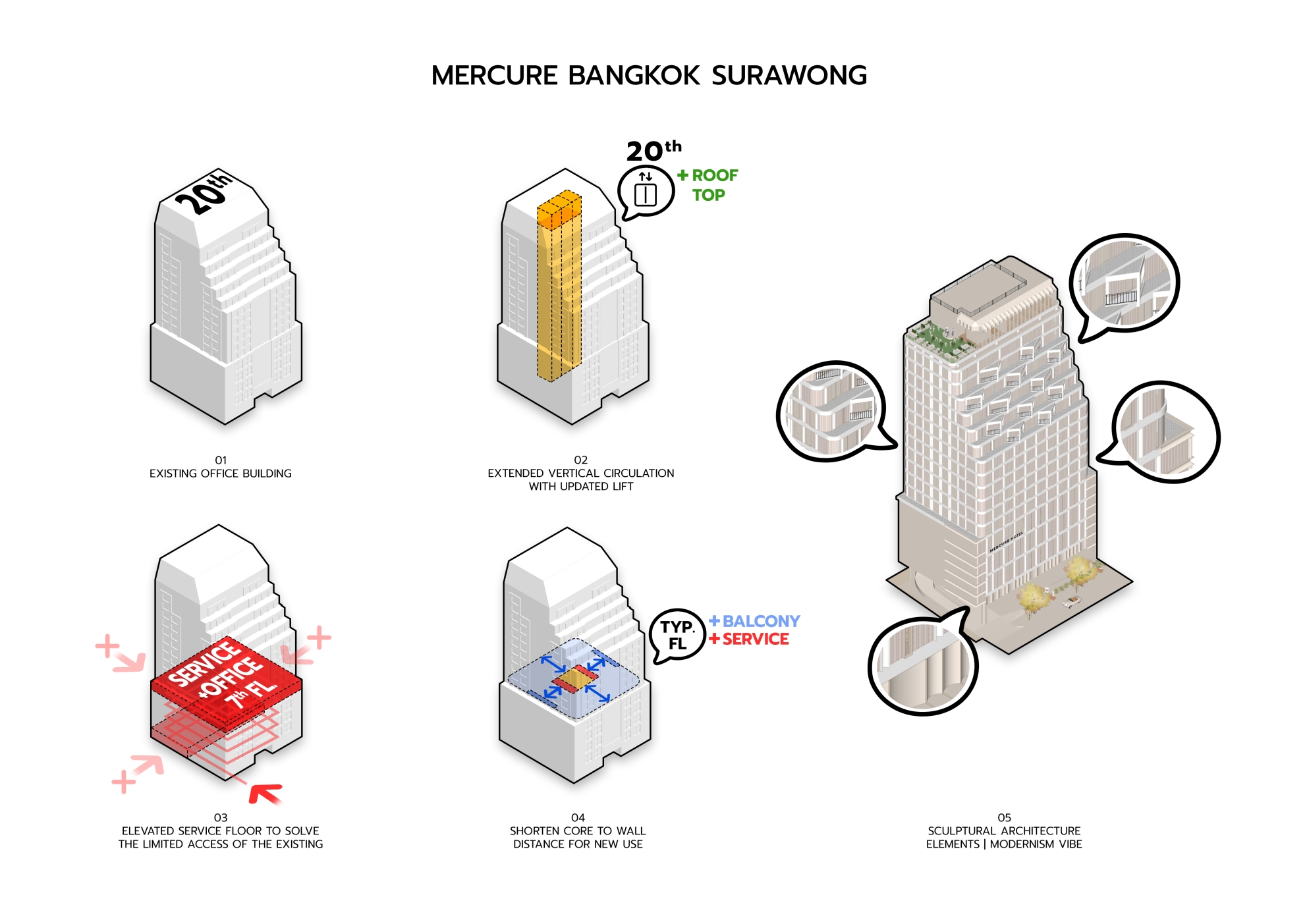 The renovation of Mercure Bangkok Surawong pays tribute to the district’s modernist heritage while introducing refined, contemporary detailing. With no driveway around the site, the service zone was elevated above parking, preserving an open and welcoming ground-level entrance.