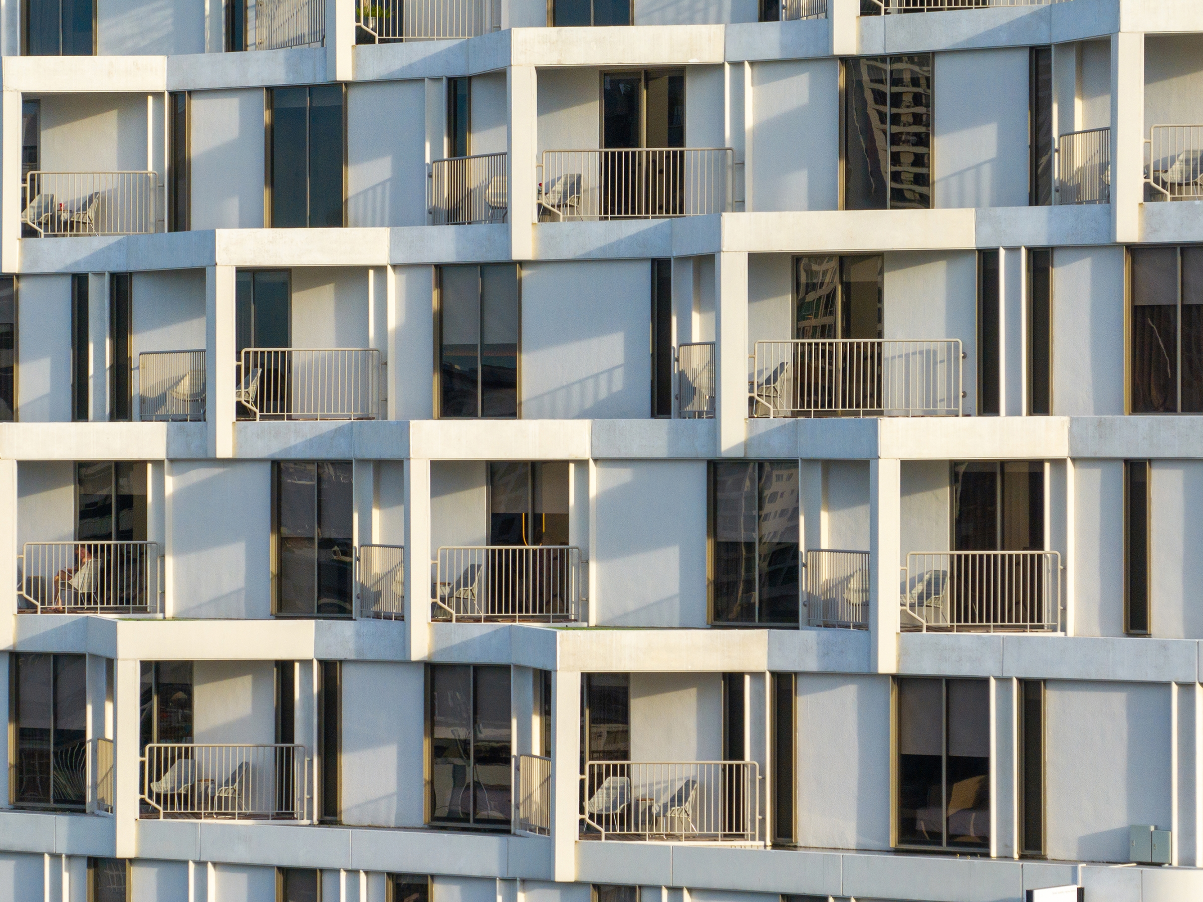The façade reflects the geometric precision of mid-century modernism through sculpted volumes and staggered balconies. Key to this transformation is the use of white cement precast panels, chosen for their tactile, slightly rustic finish. This surface quality brings a classic character that resonates with the aging elegance of surrounding modernist buildings, allowing the new structure to blend with its context while standing out with quiet confidence.
