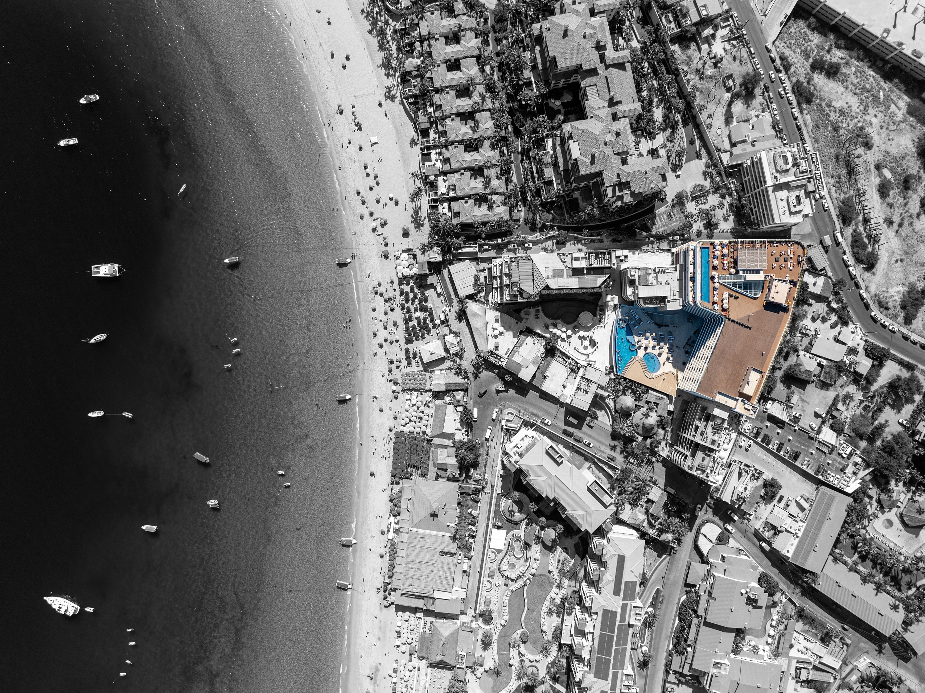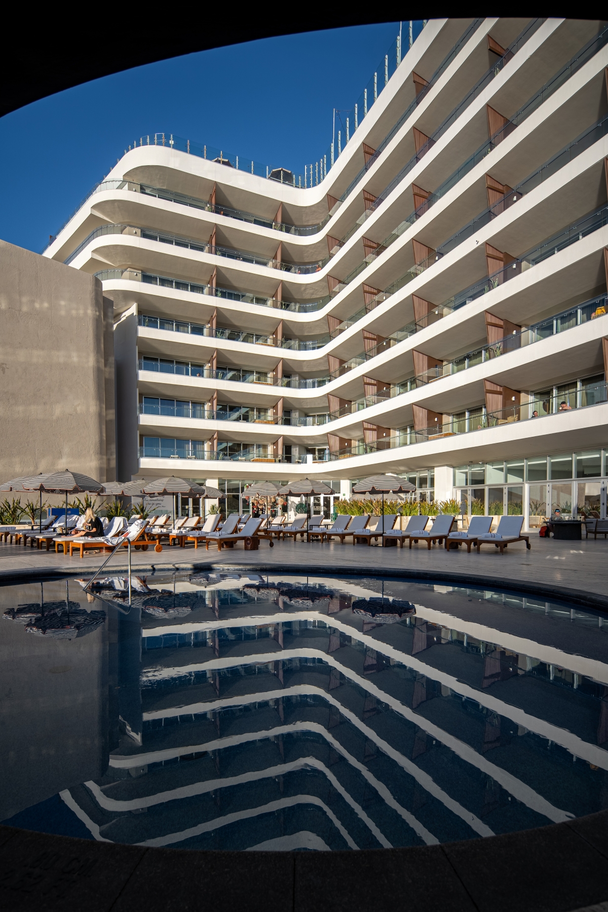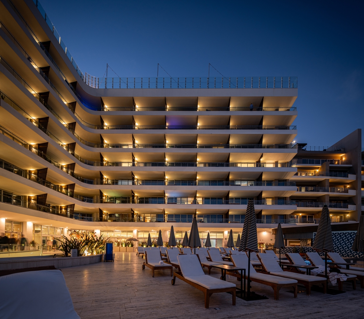 Its central atrium organizes internal circulation and efficiently connects public spaces, guest rooms, and amenities. On the ground floor, the lobby links the restaurant, pool bar, and terrace, extending toward the outdoor pool and providing direct access to the beach club.
