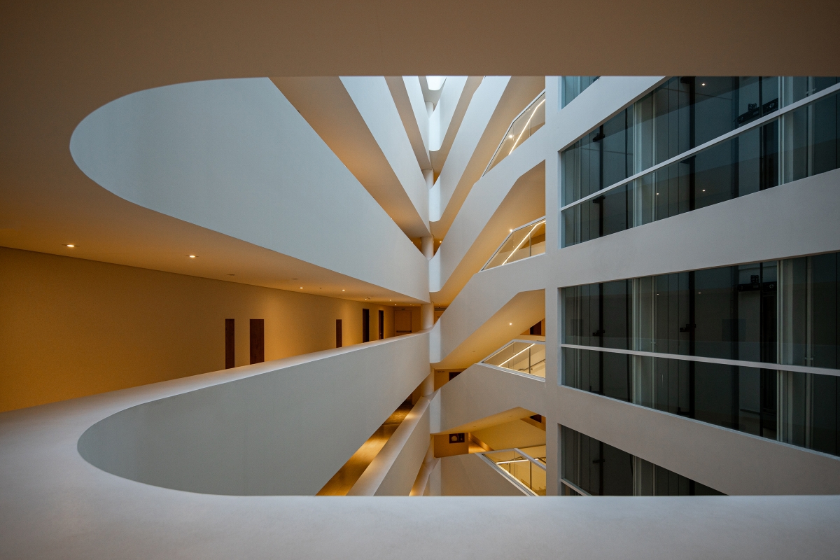The new white concrete addition, features horizontal bands inspired by nautical typologies. It creates a visual rhythm that interacts with the verticality of the original towers, harmonizing the pre-existing façade with that of the new volume.