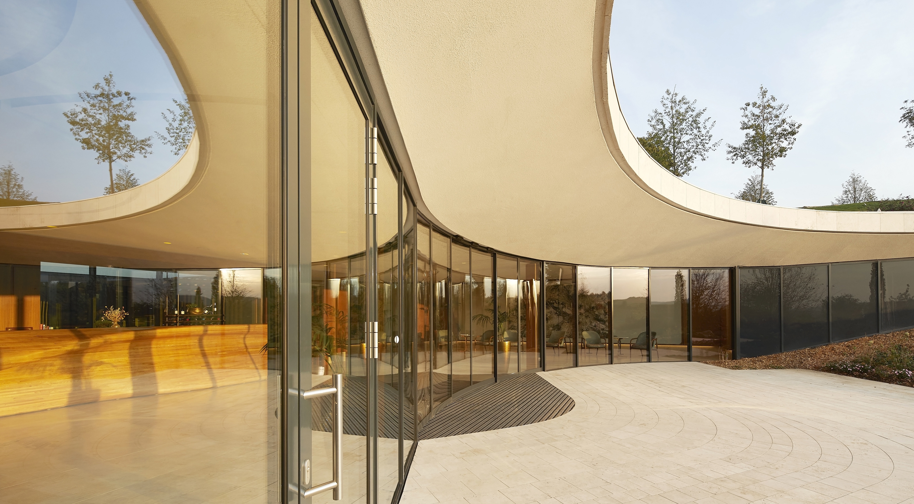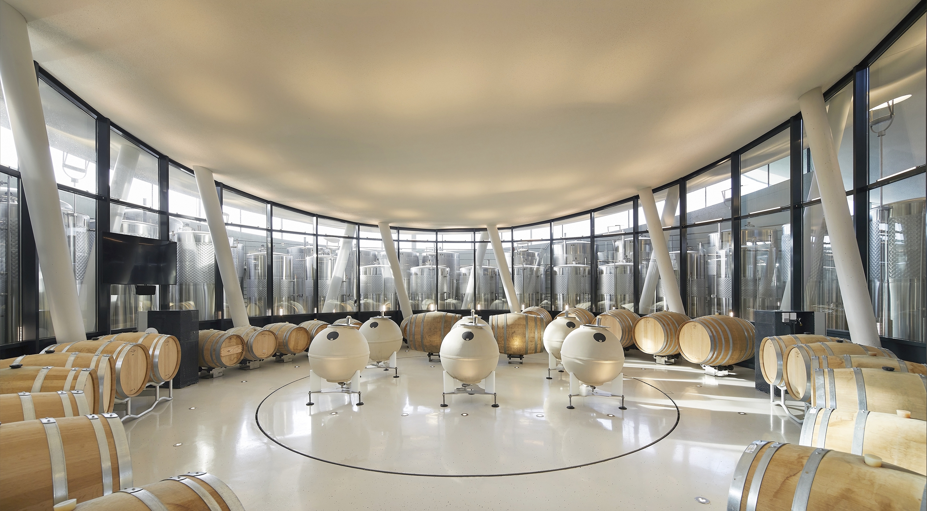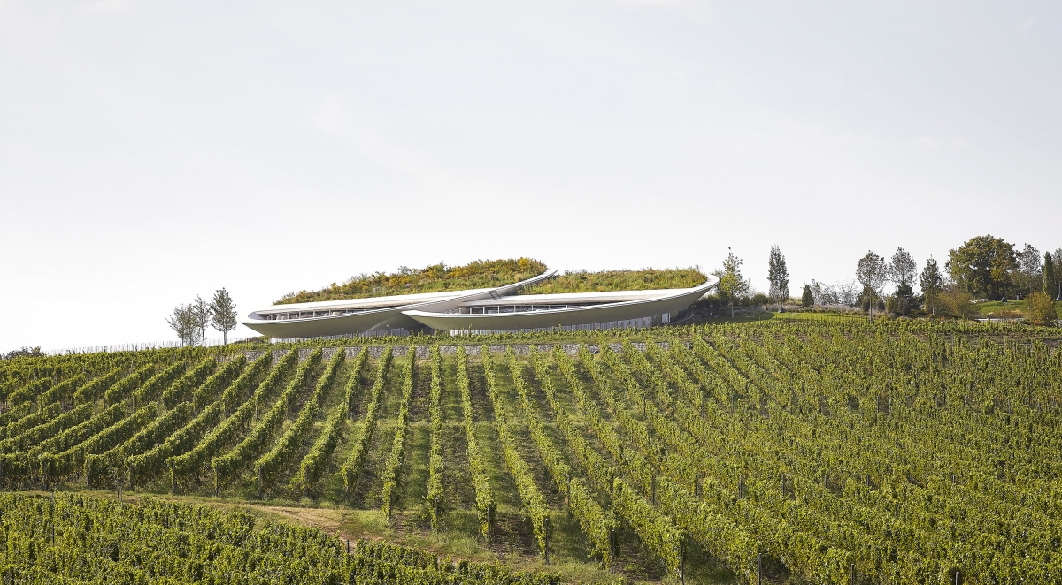 The architectural concept envisioned the structure as a gentle form floating above the landscape. At the top of Padi Hill, two 36-meter-diameter lenses house the bar and the restaurant of the winery. This is the only part of the building visible above ground level. The visitor entrance and lobby are located behind the lenses hidden in the hillside. The winemaking areas are located on the basement level, with fermentation rooms placed in circular spaces beneath the lenses. Steel tanks are arranged in concentric circles, surrounding a central wooden barrel aging area. A tunnel connecting to the cellar ensures efficient grape transportation and shipment of finished goods.