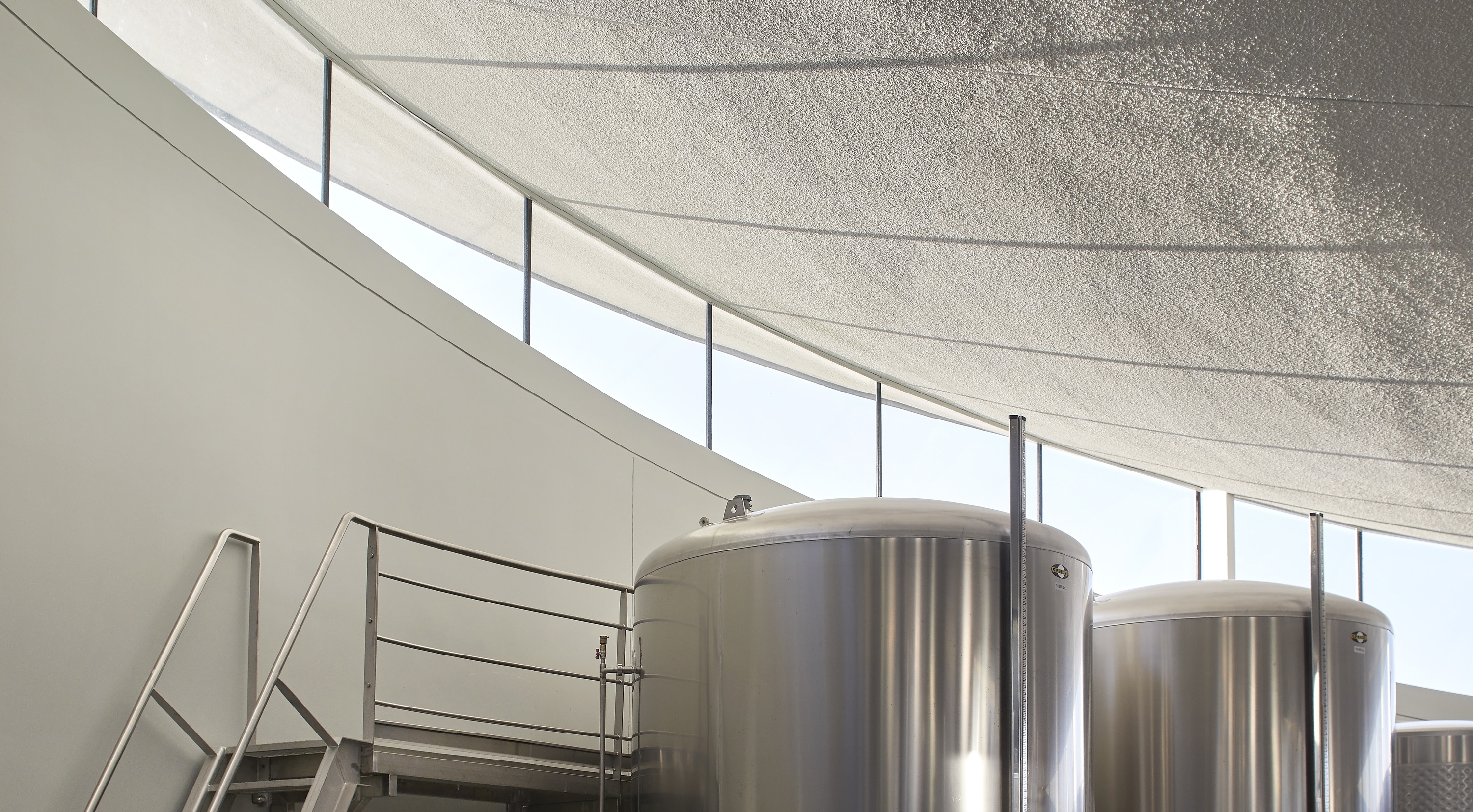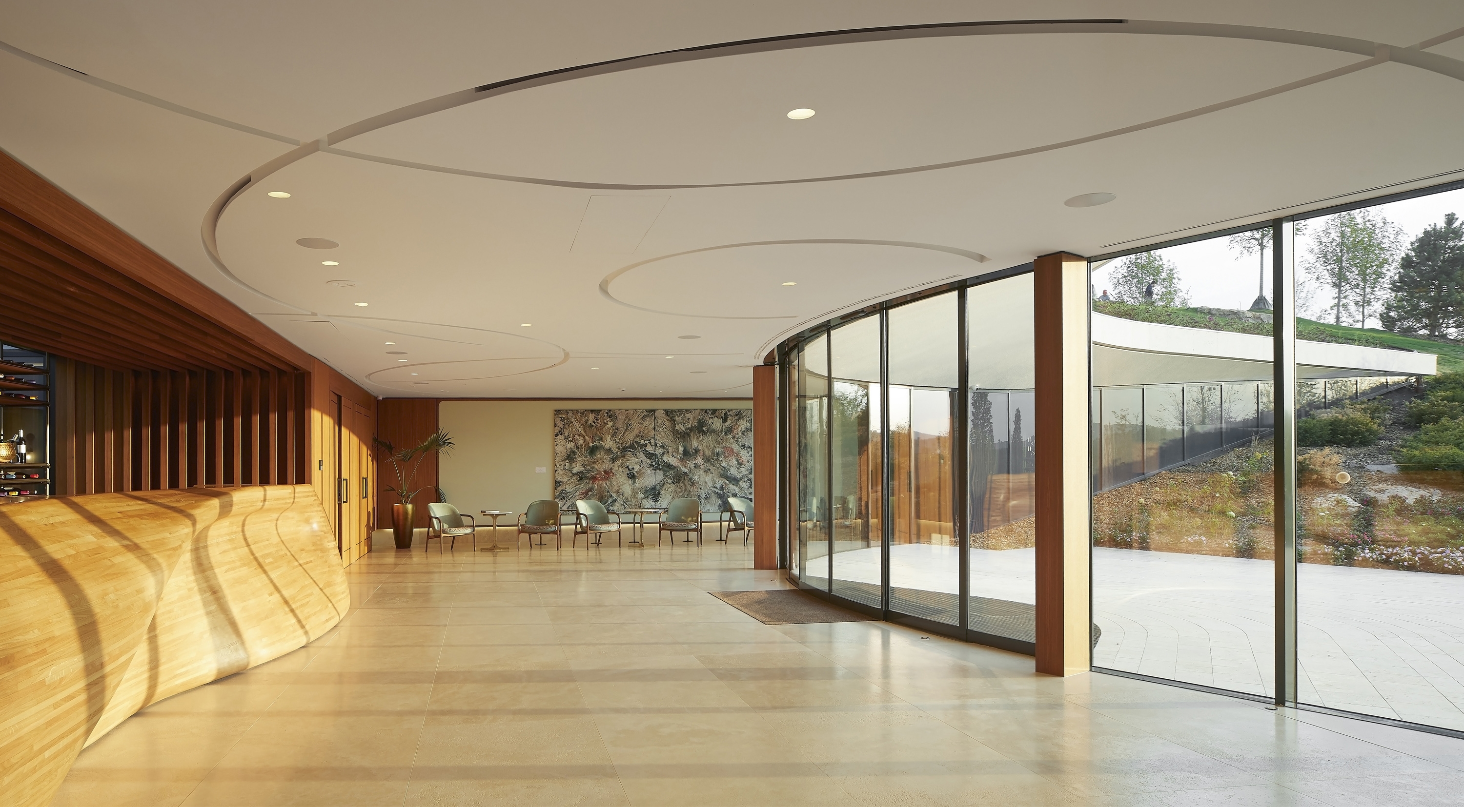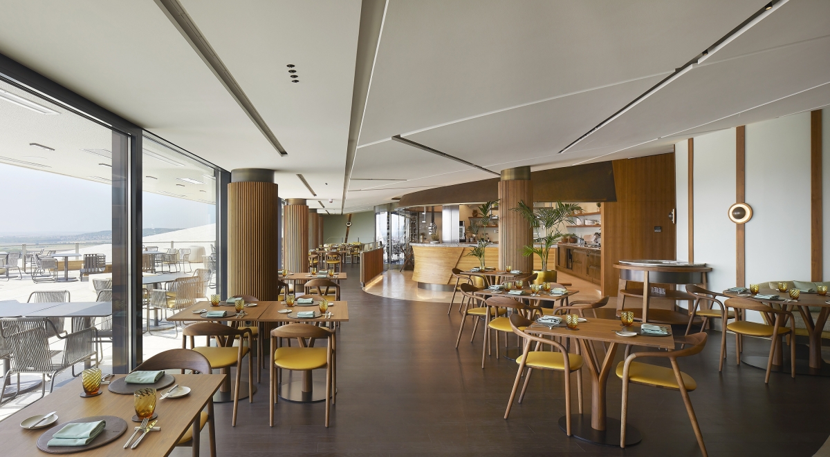 The architectural concept envisioned the structure as a gentle form floating above the landscape. At the top of Padi Hill, two 36-meter-diameter lenses house the bar and the restaurant of the winery. This is the only part of the building visible above ground level. The visitor entrance and lobby are located behind the lenses hidden in the hillside. The winemaking areas are located on the basement level, with fermentation rooms placed in circular spaces beneath the lenses. Steel tanks are arranged in concentric circles, surrounding a central wooden barrel aging area. A tunnel connecting to the cellar ensures efficient grape transportation and shipment of finished goods.