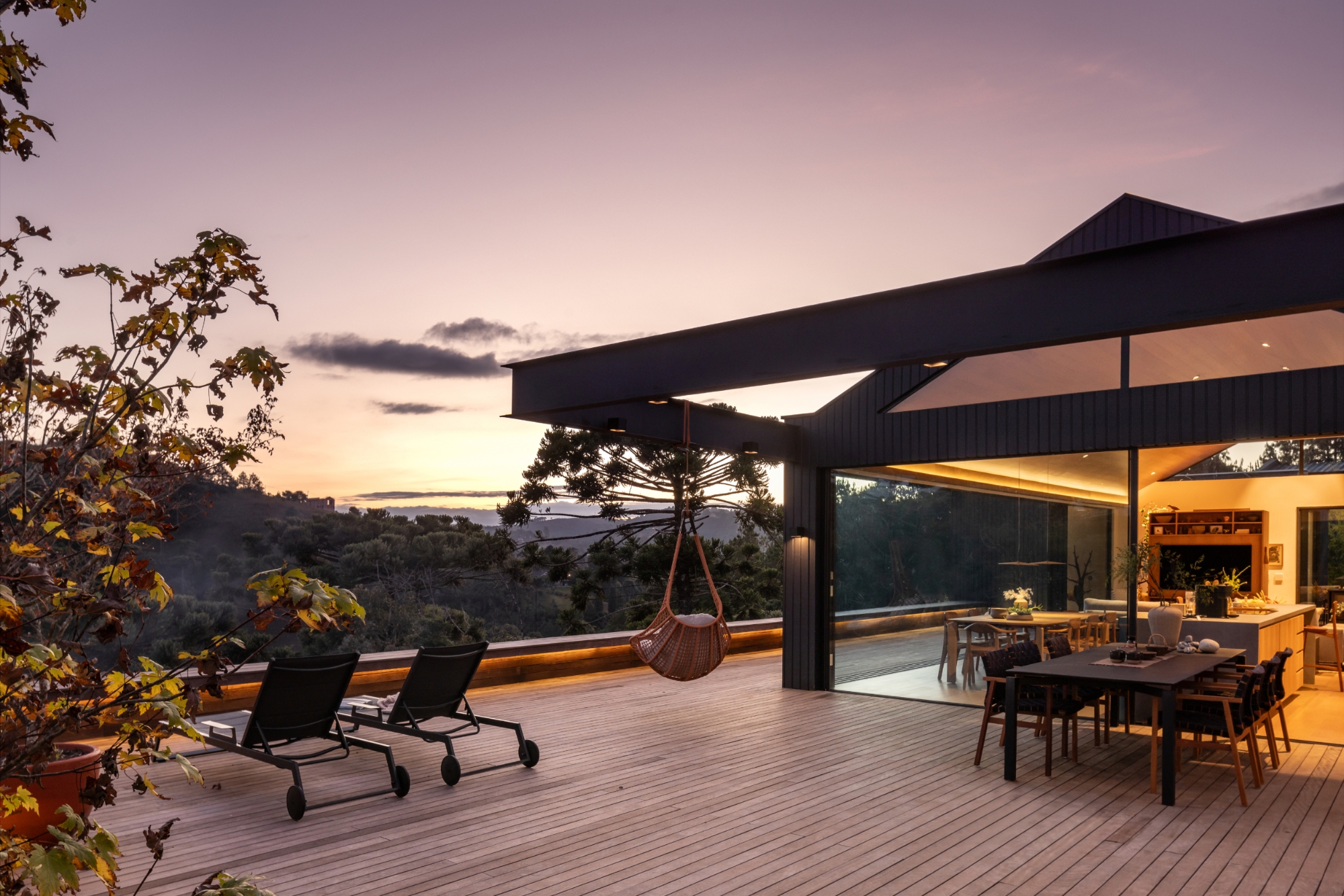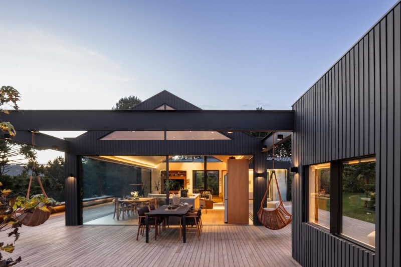 The house unfolds around a central wooden deck, embraced by volumes that open to the surrounding forest. Drawing from archetypal forms — gable roofs, linear structures — the architecture blends restraint and warmth. Sliding glass panels dissolve boundaries between indoors and out, while sloped timber ceilings add intimacy.