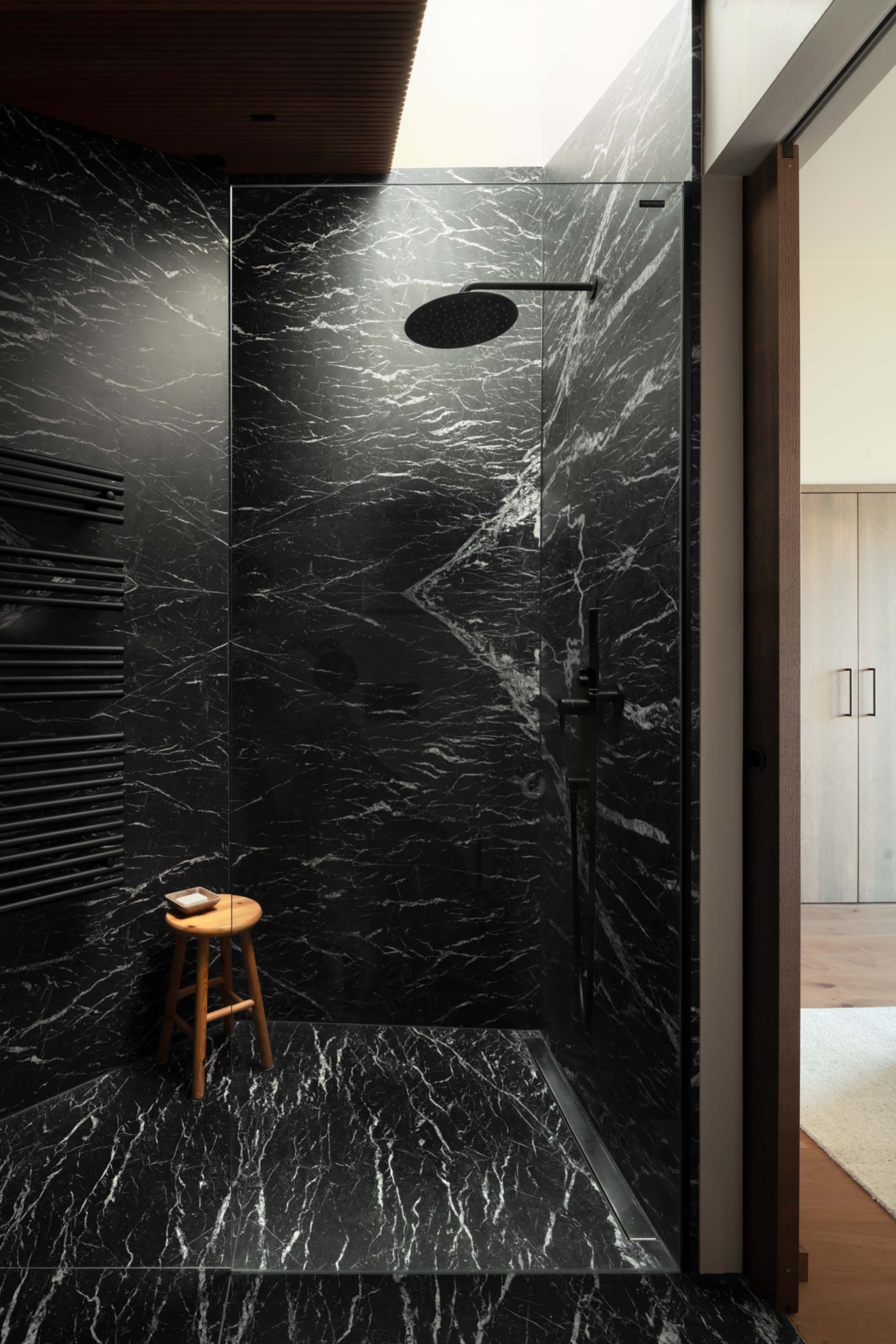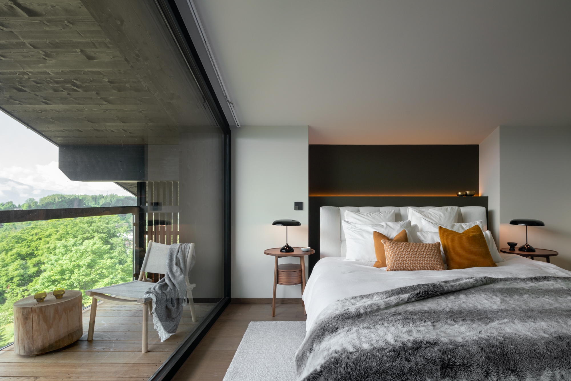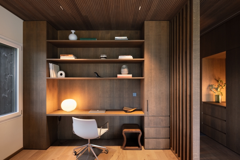 The traditional Swiss chalet is reinterpreted with a modern, abstract approach through movement and flow using stacked dark geometric screens to create a striking silhouette against the mountainous backdrop. The home maintains visual continuity while embracing openness and honoring the heritage of the region while the contrast between the dark exterior and the light-filled interior enhances the home’s contemporary aesthetic, bridging the gap between classic and modern.