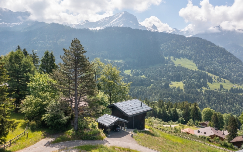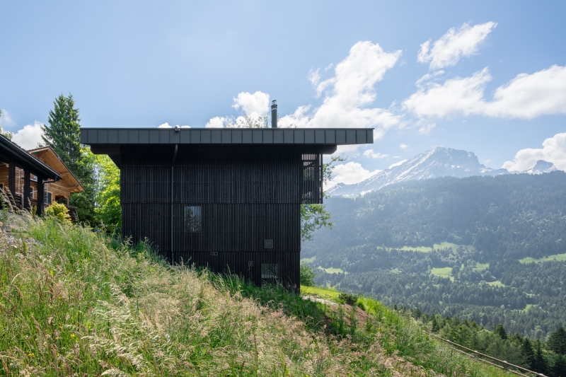 Nestled on a sloped hillside, this modern chalet seamlessly blends contemporary design with traditional Swiss architectural sensibilities. The home is constructed using a wood panelized system and a masonry basement level, incorporating locally sourced materials and skilled craftsmen. A solar standing seam metal roof sits atop the structure, while floor-to-ceiling windows frame panoramic views of the Grand Muveran massif, ensuring a continuous connection with the landscape.