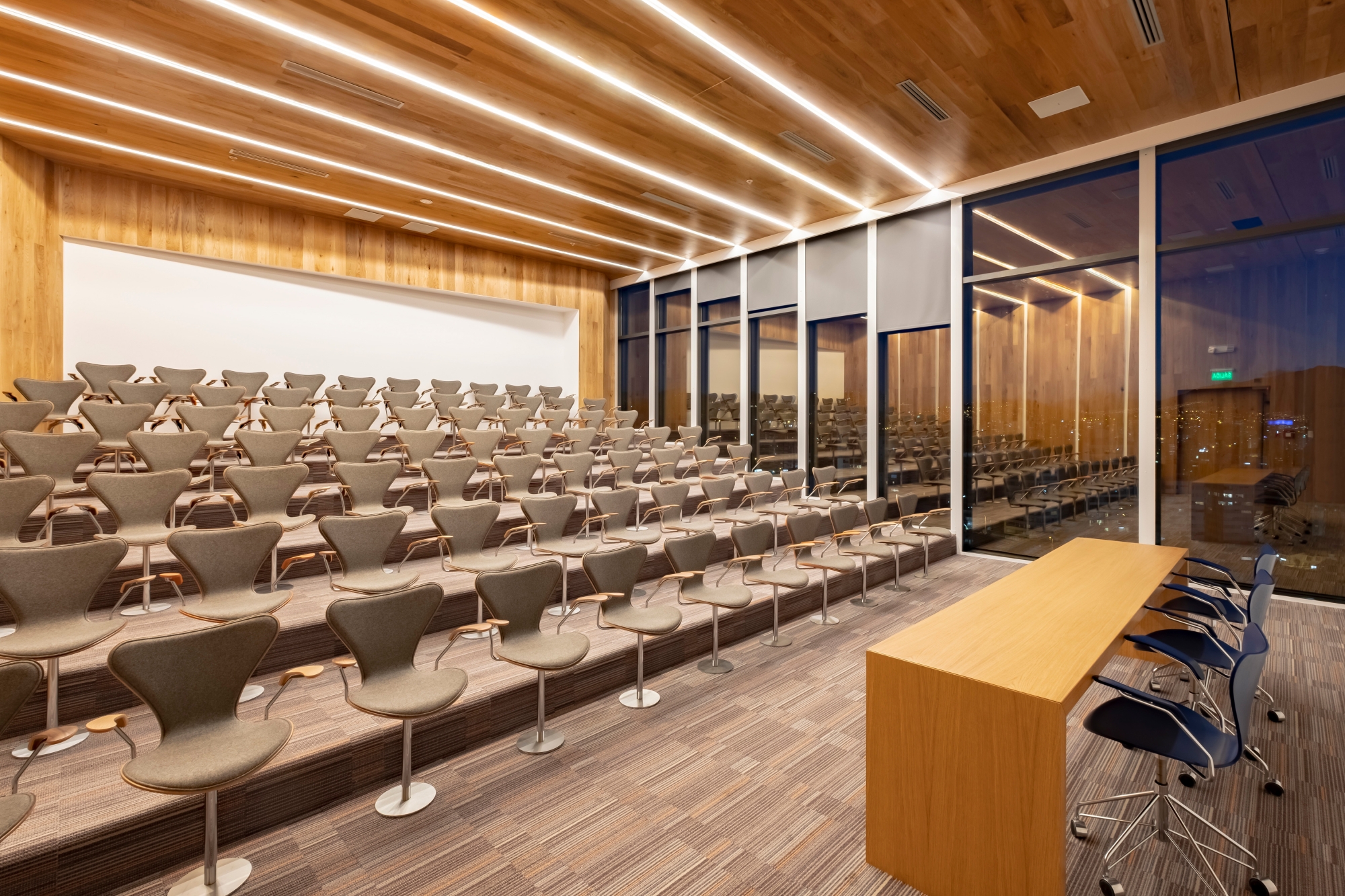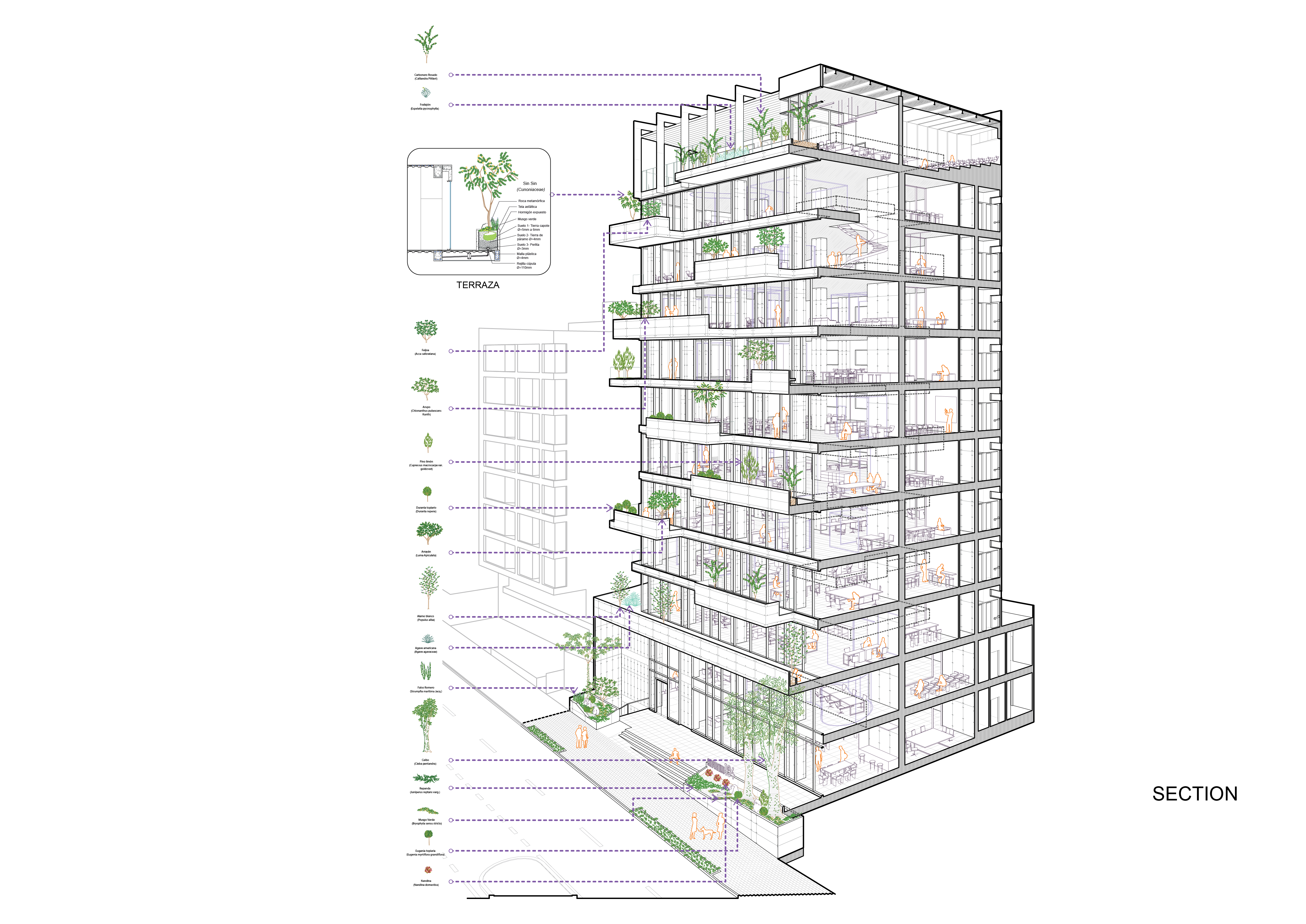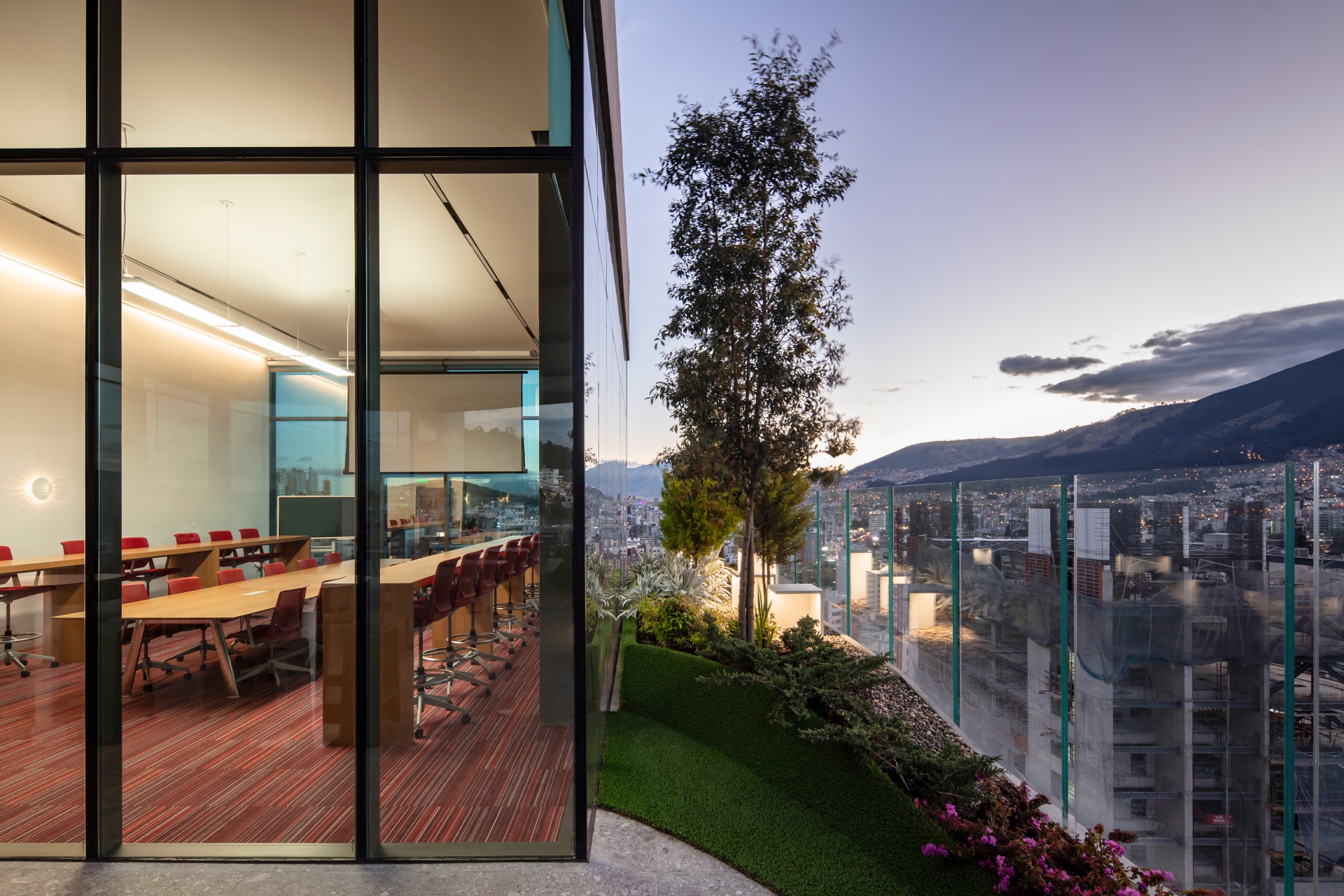 Inspired by the Japanese concept of Shakkei—"a garden must evoke the horizon"—the building integrates city and nature into a seamless whole. A sidewalk shaded by rescued ceiba trees welcomes visitors with a green threshold. Terraces throughout the floors merge with the landscape, culminating in a rooftop that offers panoramic views of the Andes and hosts a café, meeting spaces, and an auditorium.