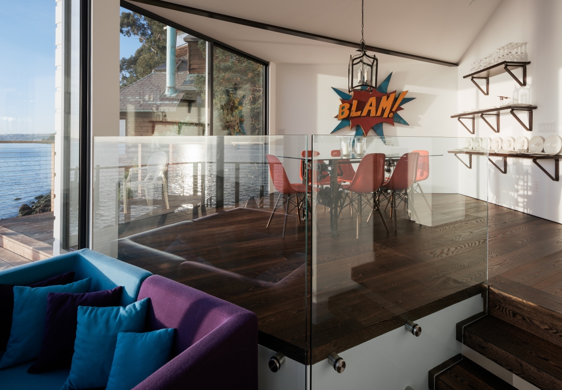 Inside, the home retains its offbeat charm through the jagged floor plan and changing ceiling heights. We were determined to celebrate its quirkiness however, the roof configuration limited the size and location of picture windows, and several interior walls obstructed views. As a result, we removed a series of walls to allow for a more fluid layout and raised the eaves to create space for floor-to-ceiling windows which capture generous aspects to the water and San Francisco’s skyline in the distance.