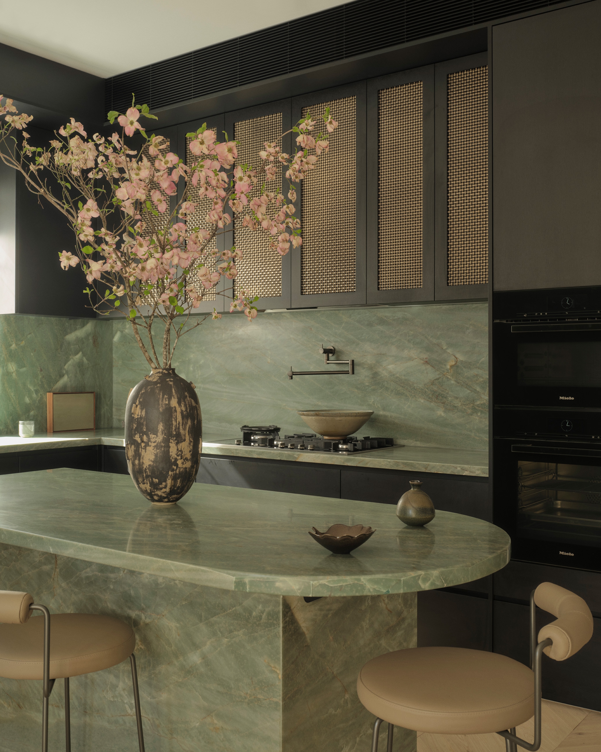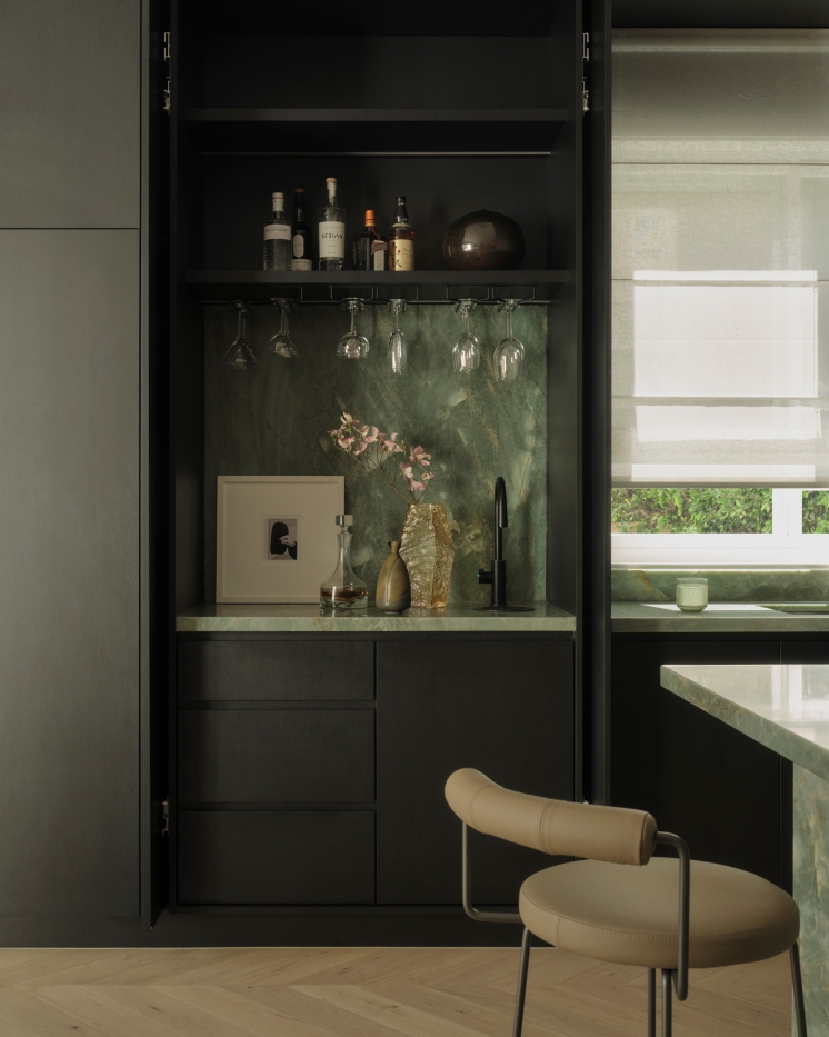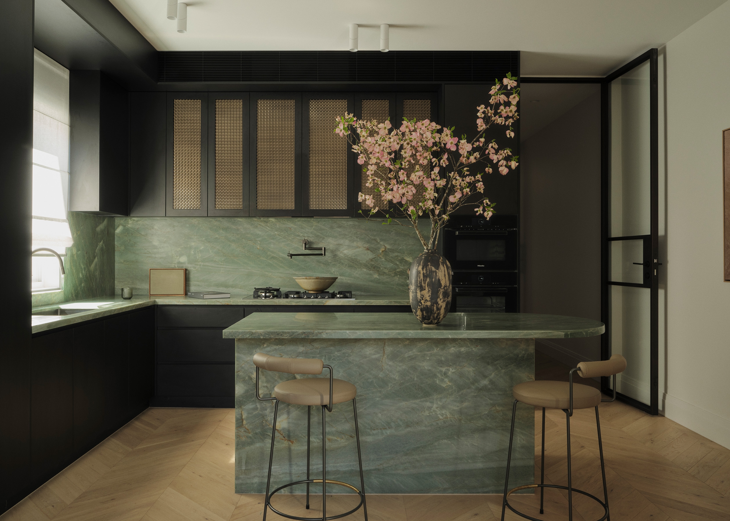 Forget the ‘Heart of the Home’, marking the clients love of Hospitality and Hosting this Kitchen was designed to be the ‘The envy of Friends’. 2-Tone Metallic Lattice Imported from New Zealand heads the upper cabinetry footed by a Smeraldo Quartzite selected for its ability to read as either 'Meditative' or 'Vibrant' - Whichever mood you’re in.