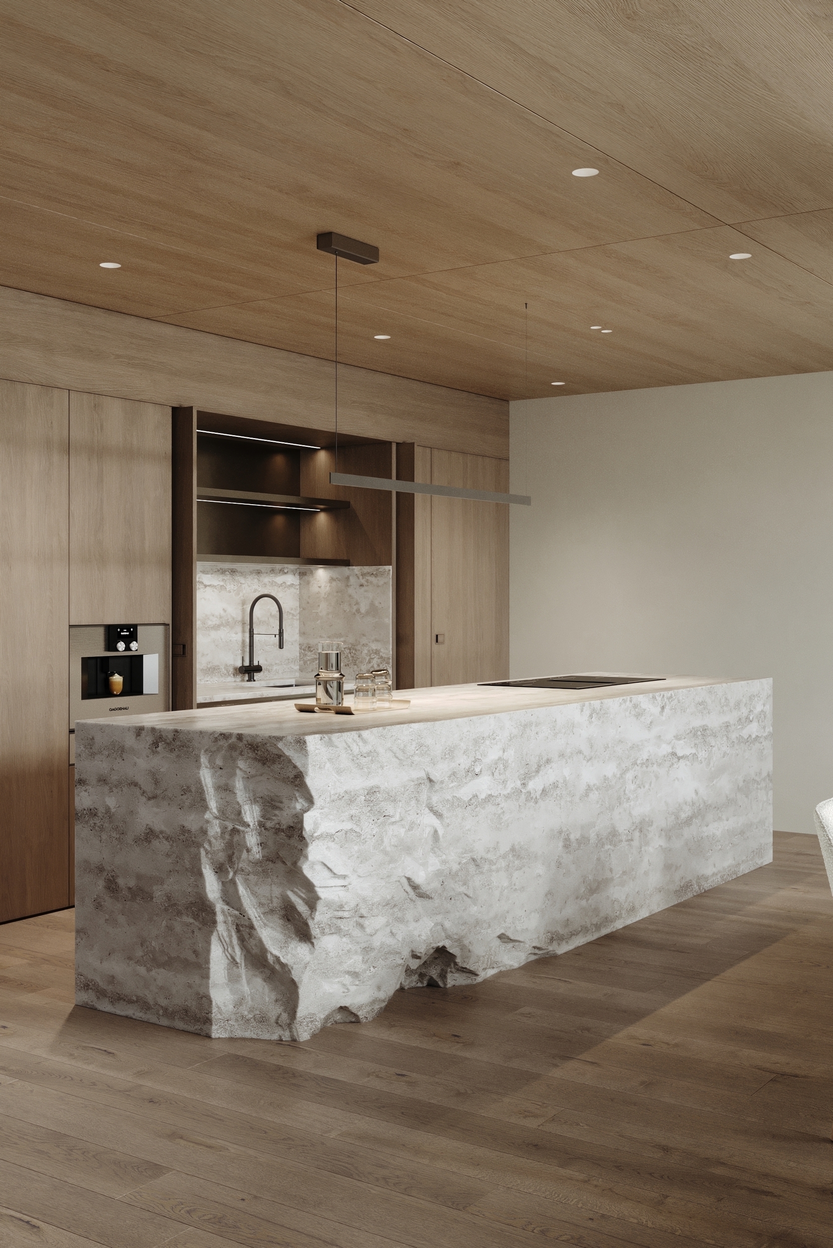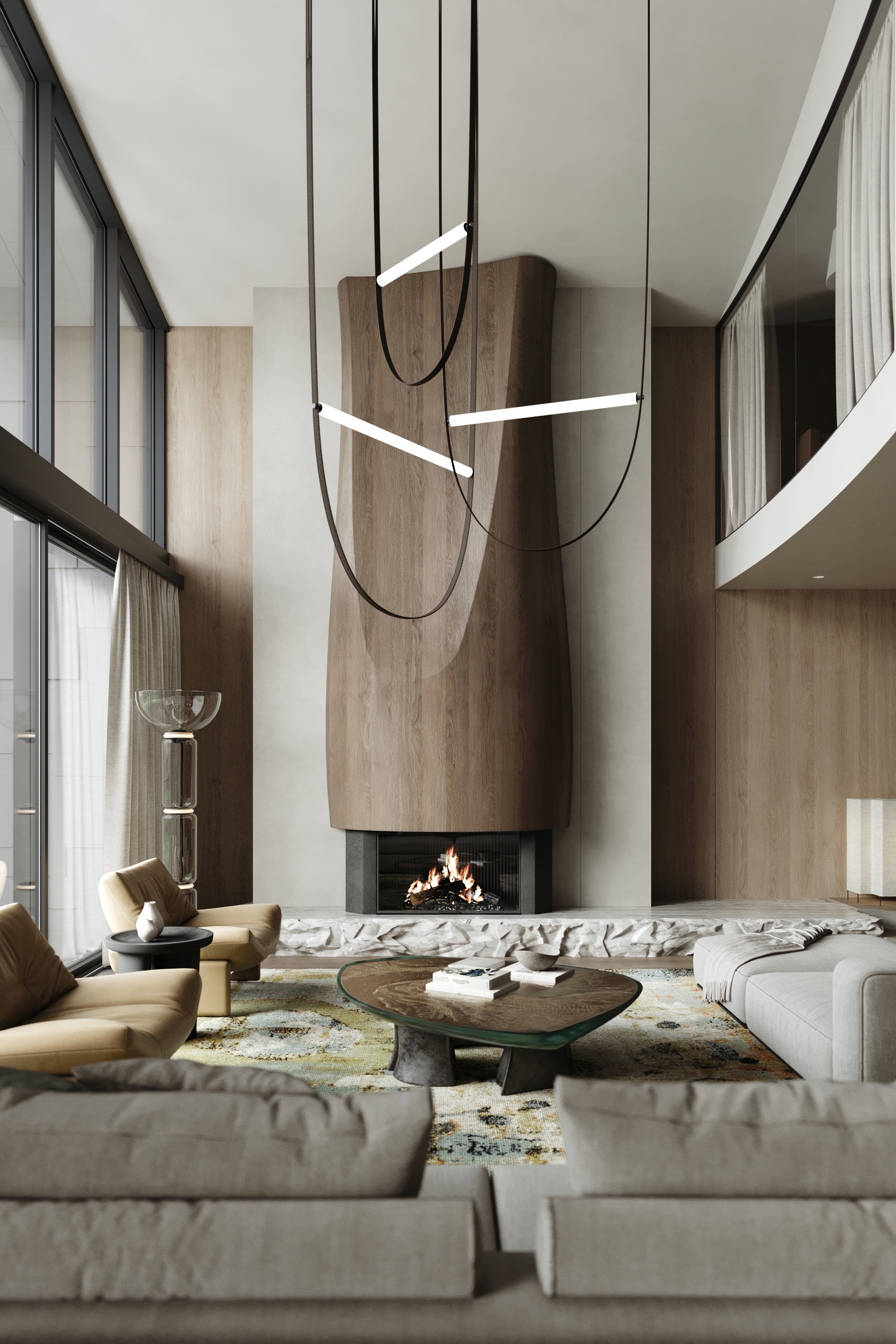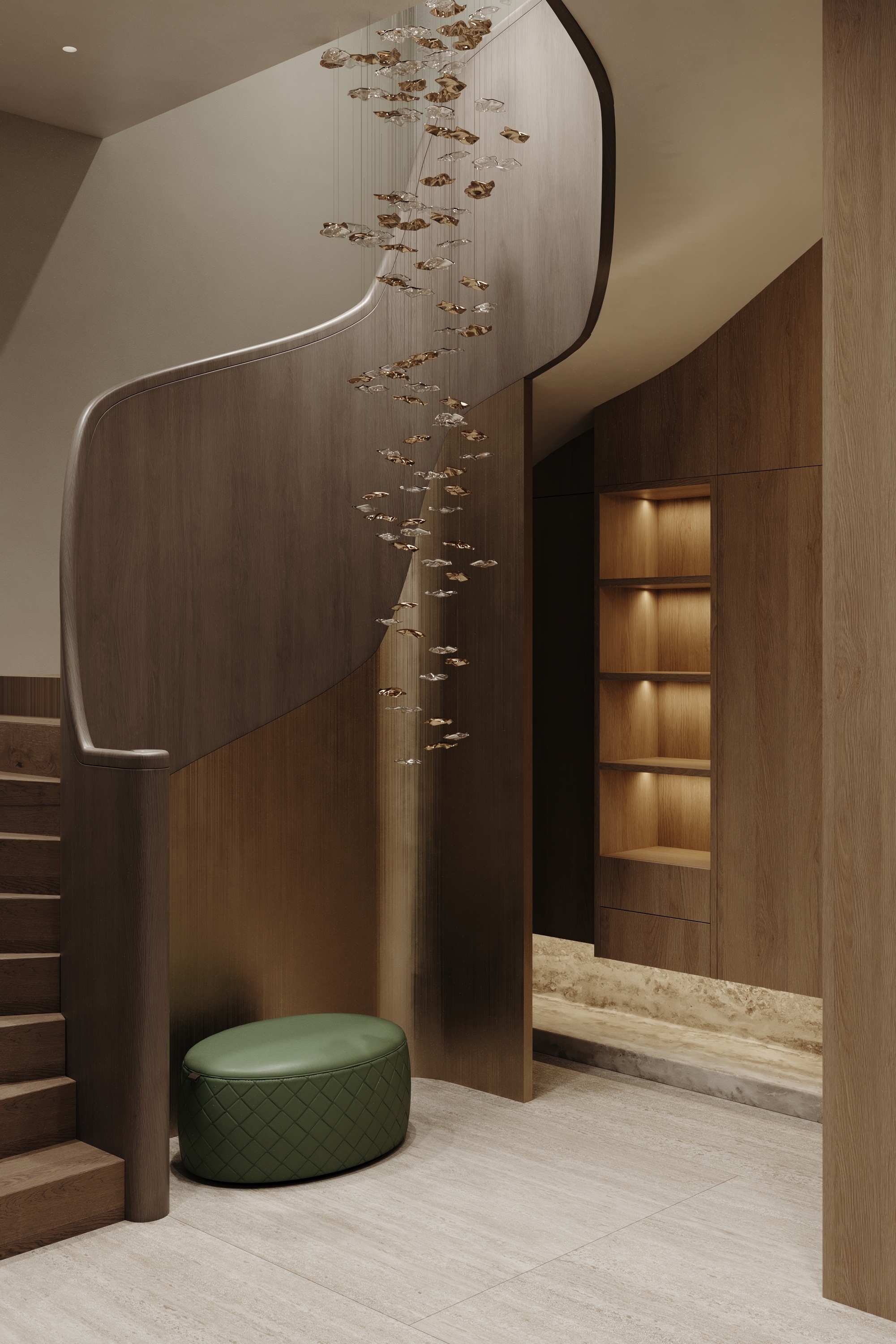 Level E comprises open-plan kitchen, dining, and living areas. The bespoke kitchen and island are crafted from noble wood and textured stone, while the living room combines layered lighting with soft contours and luxurious finishes.