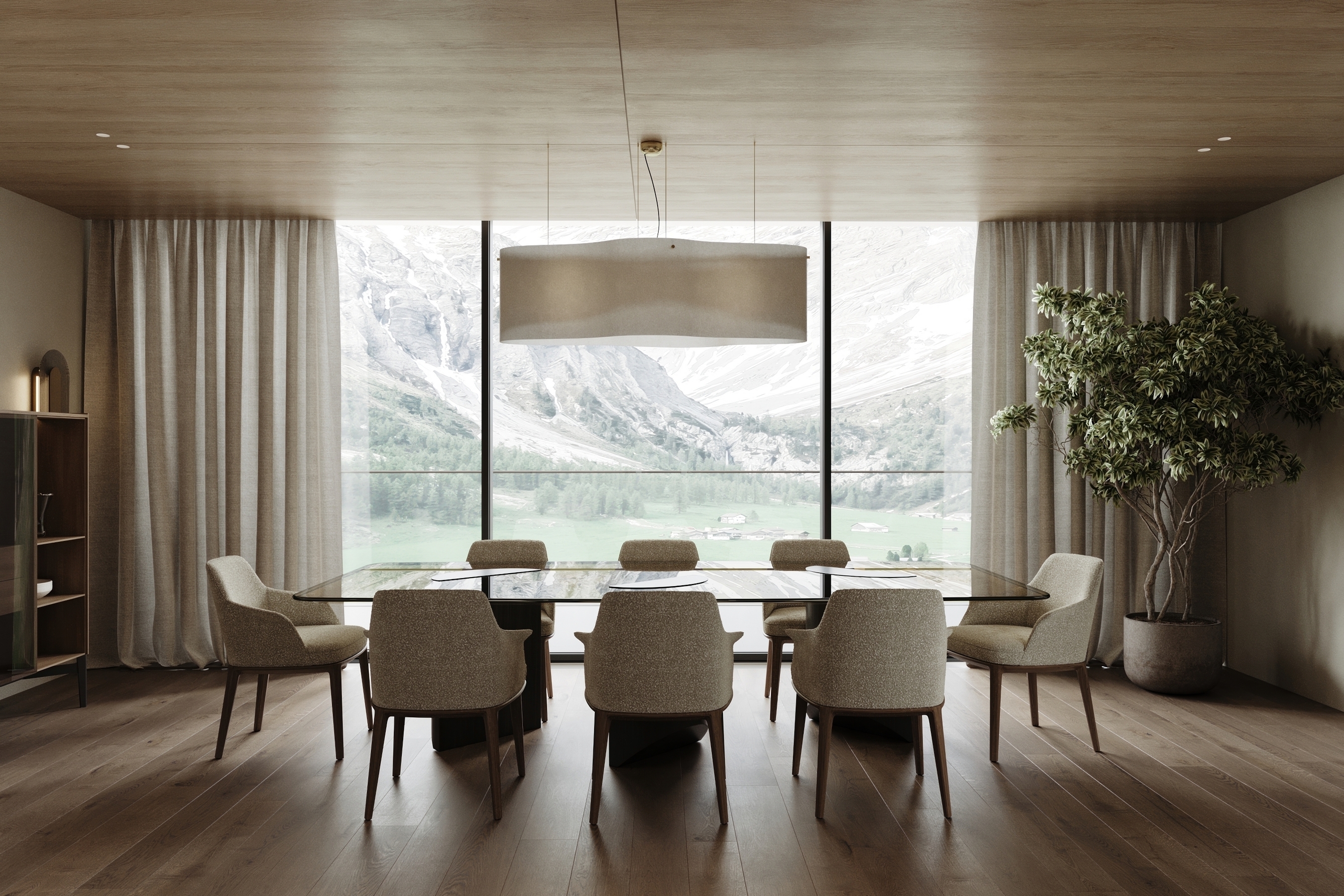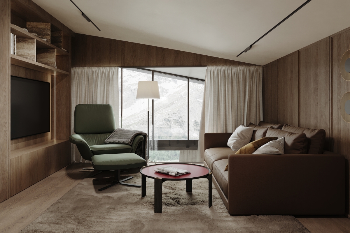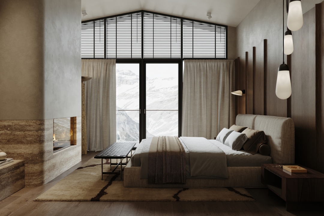 This Alpine villa was conceived as a private retreat, offering its owners a serene space to unwind and relax. The interior is designed to echo the surrounding landscape through the use of natural materials and a soft, earthy palette. Expansive panoramic windows blur the boundary between inside and out, immersing the living spaces in mountain views and daylight.