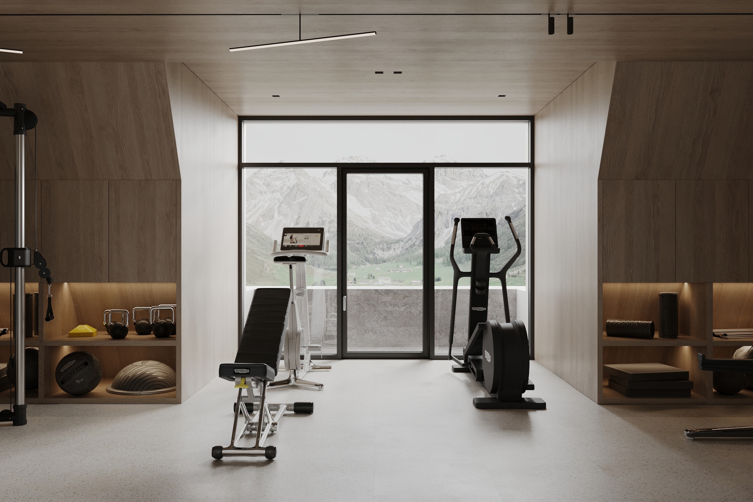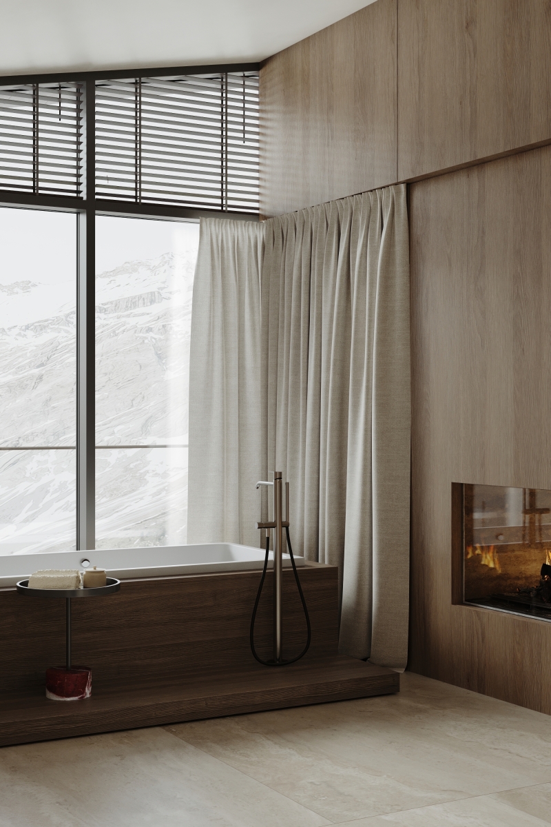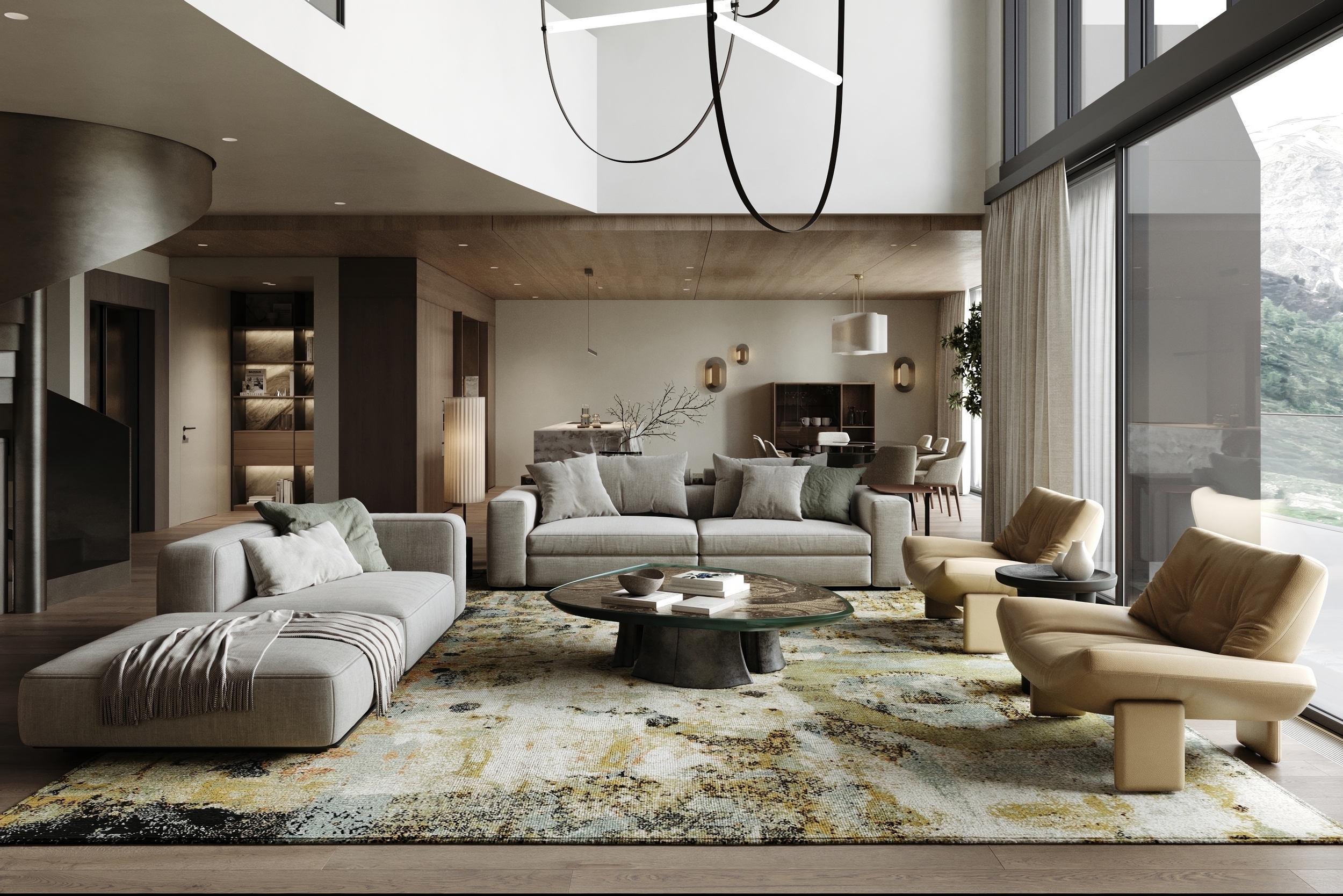 This Alpine villa was conceived as a private retreat, offering its owners a serene space to unwind and relax. The interior is designed to echo the surrounding landscape through the use of natural materials and a soft, earthy palette. Expansive panoramic windows blur the boundary between inside and out, immersing the living spaces in mountain views and daylight.