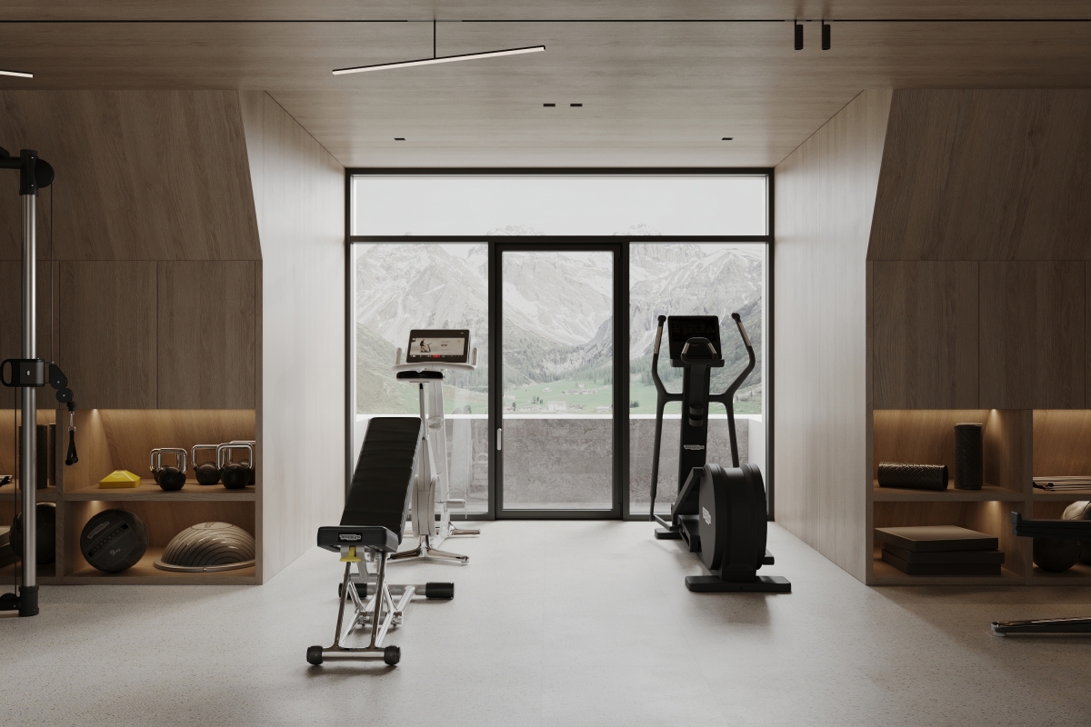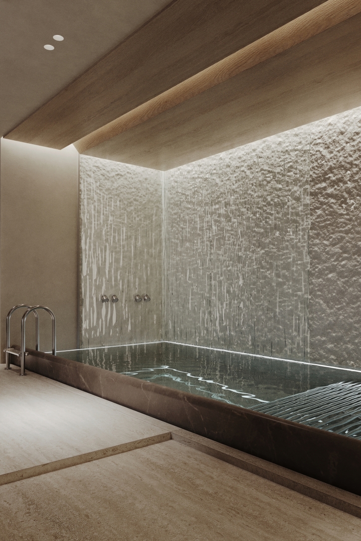Level C houses garage, utility, and technical rooms. Level D is dedicated to wellbeing, featuring guest bedrooms, a spa area with sauna, an indoor pool, and a gym.