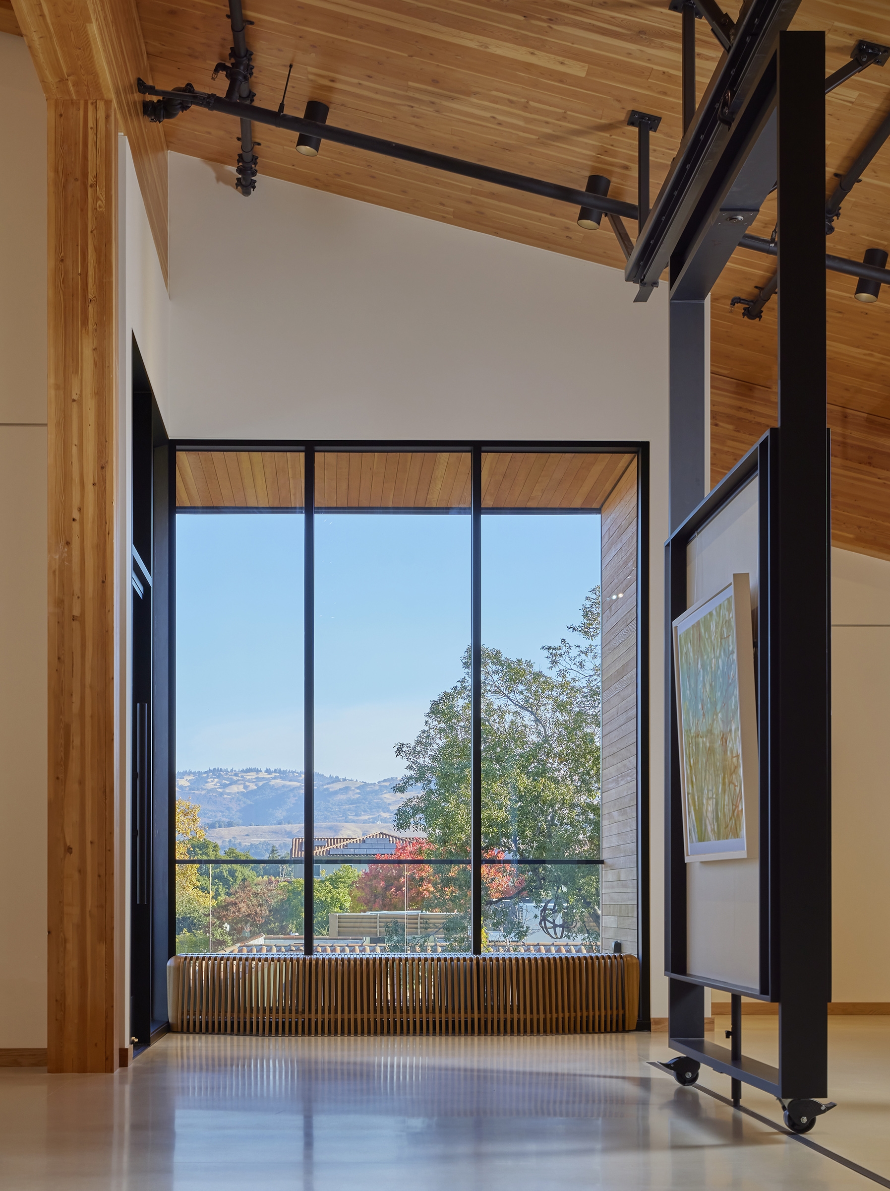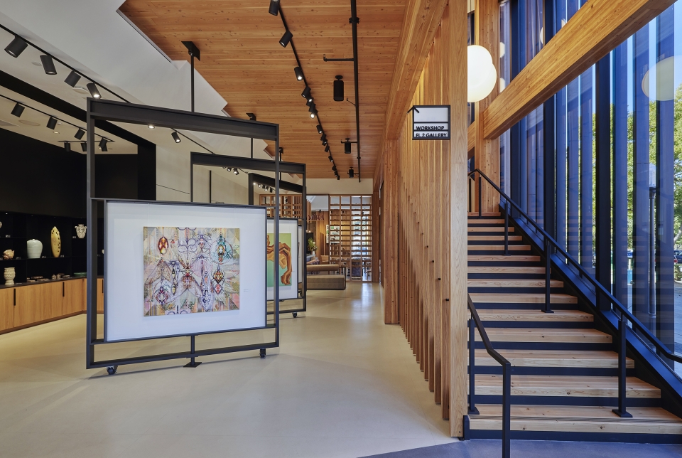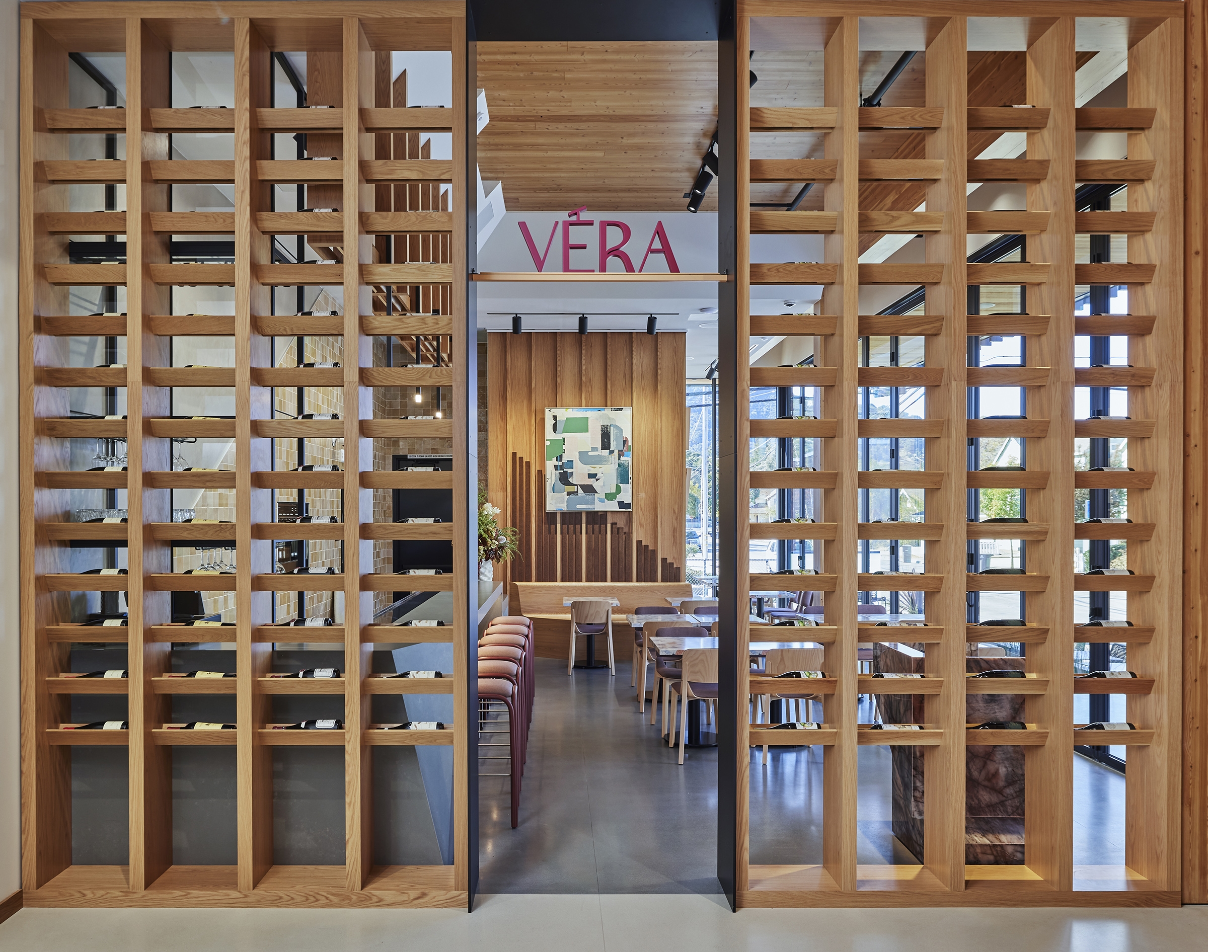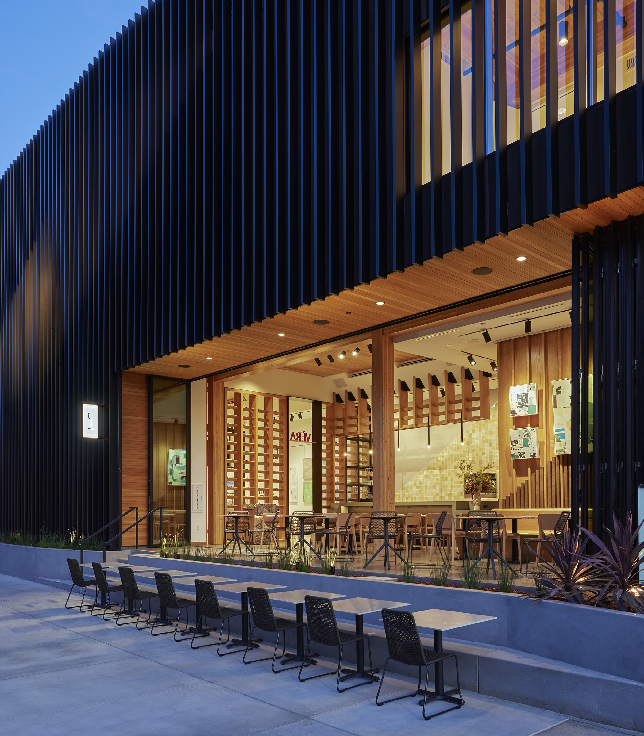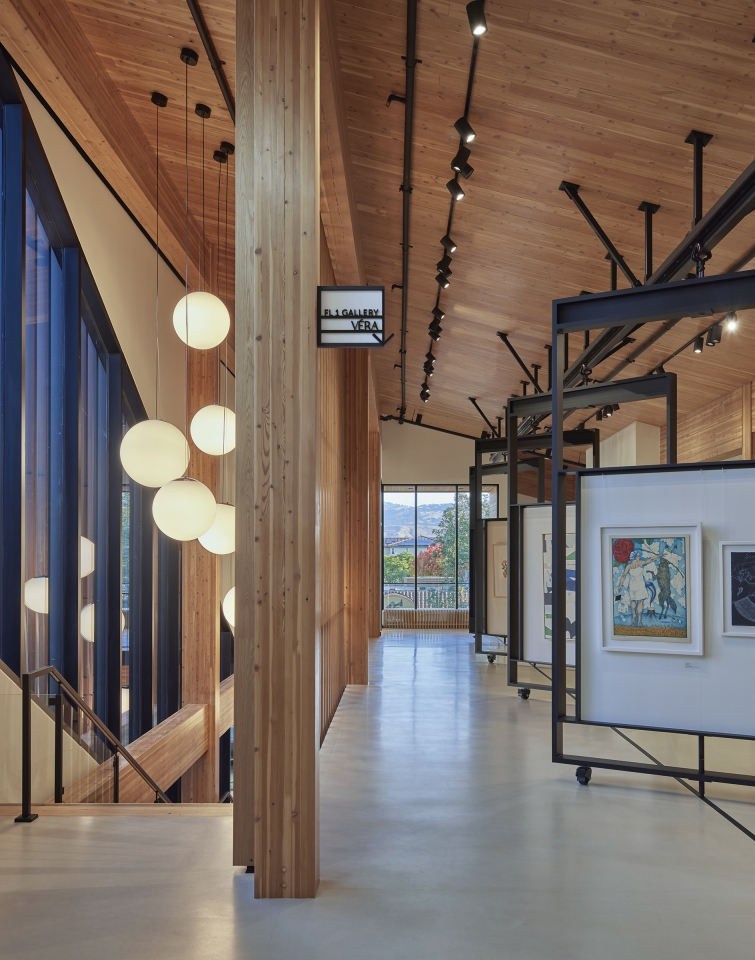 The Edes destination is a harmonious blend of art, design, and culinary excellence, crafted to immerse visitors in a creative environment. Geometry, form, and organization define a clean, linear aesthetic that frames the El Toro Peak. Mass timber construction was selected for its natural beauty, biophilic benefits, and reduced carbon footprint. The interior embraces the mass timber and blends the warmth of the wood with an airy, modern design. Custom shelving and display units accommodate a myriad of art, including canvas and prints, jewelry, pottery and glass pieces. Custom rotating walls pivot and adjust the flow of gallery visitors to accommodate the art and create a flexible, unified space. The first-floor gallery leads to a wine bar with modern furniture, a functional seating area and a combination of displayed wine and art pieces. A dramatic staircase lights up like a lantern at night, pointing the way upstairs in an intriguing way. Flexibility and movement shape the experience. Cura’s layered displays adapt to evolving art, while Vera’s seasonal menu and local ingredients reflect culinary fluidity. Together, they invite exploration, discovery, and connection.
