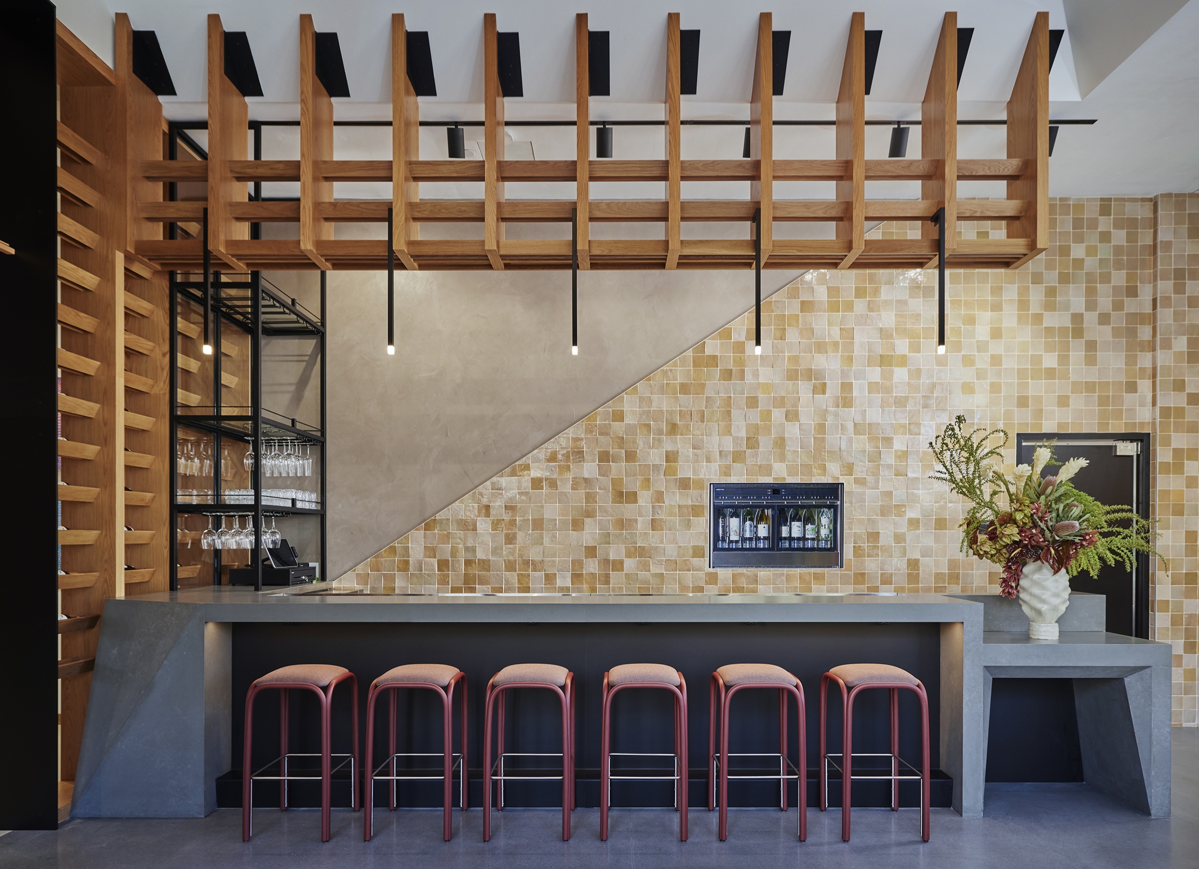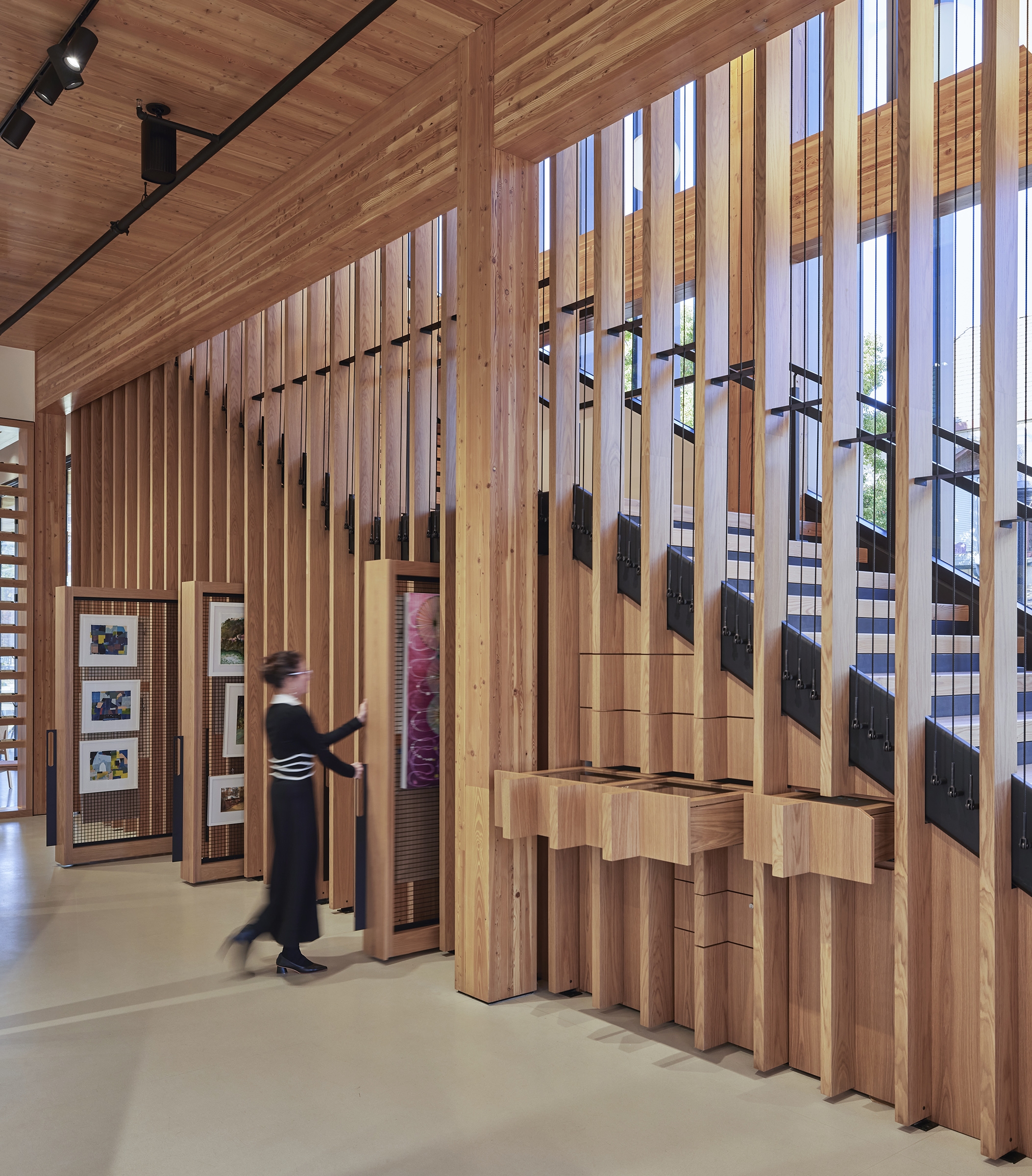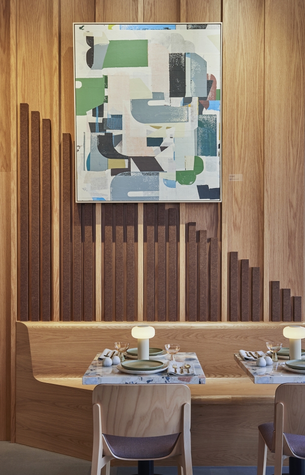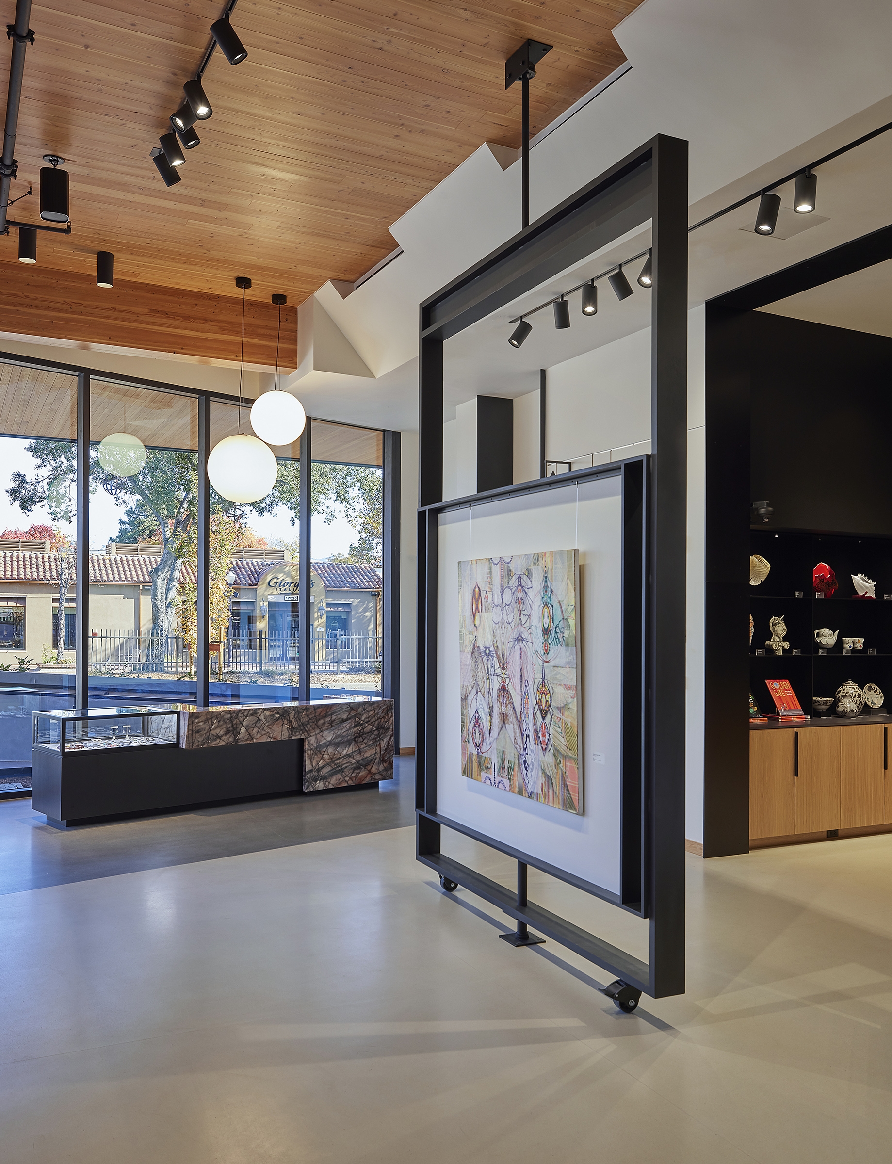 The Edes destination is a harmonious blend of art, design, and culinary excellence, crafted to immerse visitors in a creative environment. Geometry, form, and organization define a clean, linear aesthetic that frames the El Toro Peak. Mass timber construction was selected for its natural beauty, biophilic benefits, and reduced carbon footprint. The interior embraces the mass timber and blends the warmth of the wood with an airy, modern design. Custom shelving and display units accommodate a myriad of art, including canvas and prints, jewelry, pottery and glass pieces. Custom rotating walls pivot and adjust the flow of gallery visitors to accommodate the art and create a flexible, unified space. The first-floor gallery leads to a wine bar with modern furniture, a functional seating area and a combination of displayed wine and art pieces. A dramatic staircase lights up like a lantern at night, pointing the way upstairs in an intriguing way. Flexibility and movement shape the experience. Cura’s layered displays adapt to evolving art, while Vera’s seasonal menu and local ingredients reflect culinary fluidity. Together, they invite exploration, discovery, and connection.