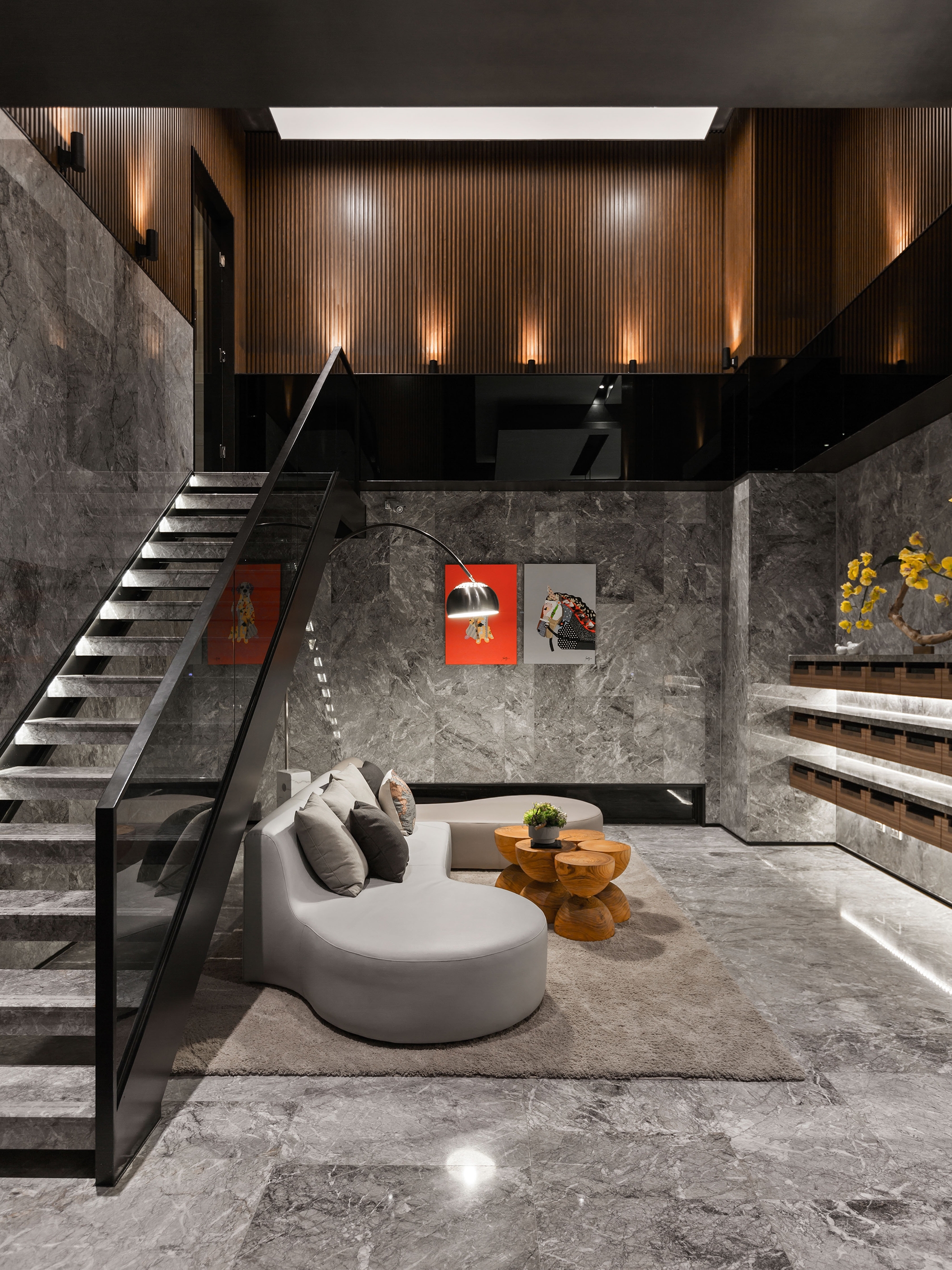 To address the diverse needs of residents, the designer has thoughtfully conceived a range of public amenities, including a state-of-the-art gym, an engaging parent-child interaction area, and a tranquil reading nook. Each space is curated to ensure functionality while maintaining a spacious and luminous ambiance that invites relaxation and comfort. This masterful design establishes a peaceful sanctuary amidst the vibrancy of city life, providing an oasis where residents can relish the tranquility and beauty that surrounds them.