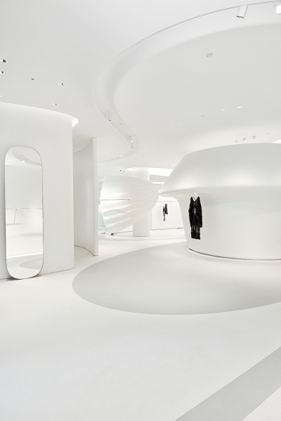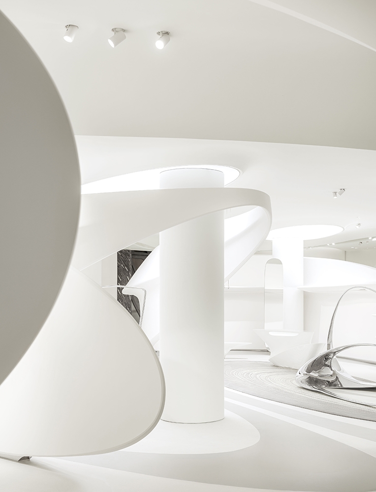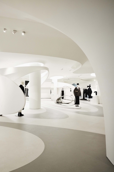 Featuring the main flagship store, a pop-up store for temporary exhibitions and events, a homeware gallery for décor and furniture, as well as a café and an outdoor courtyard, this showroom design embodies a unifying architectural language of dynamism, with distinct elements unique to each label.