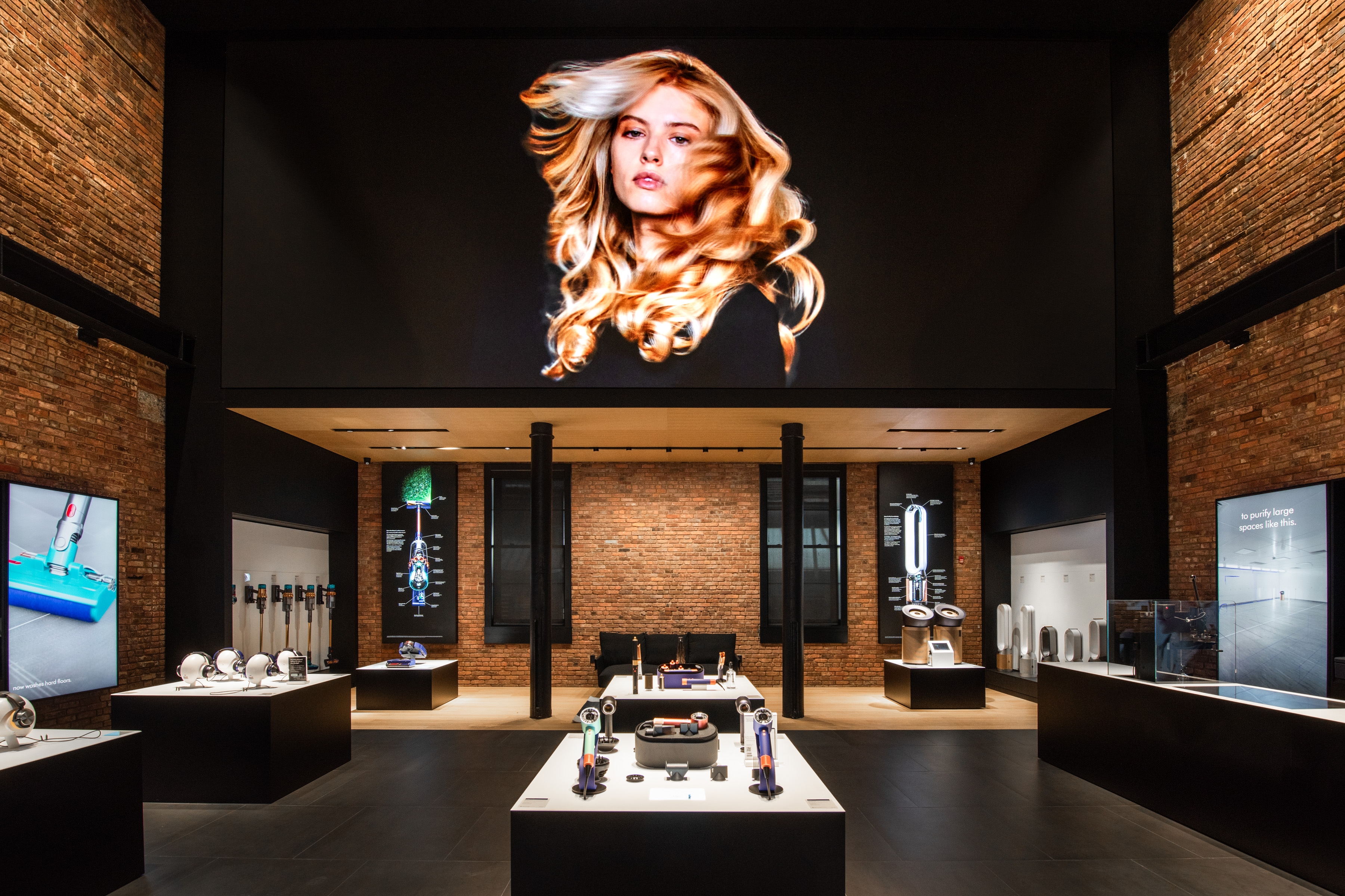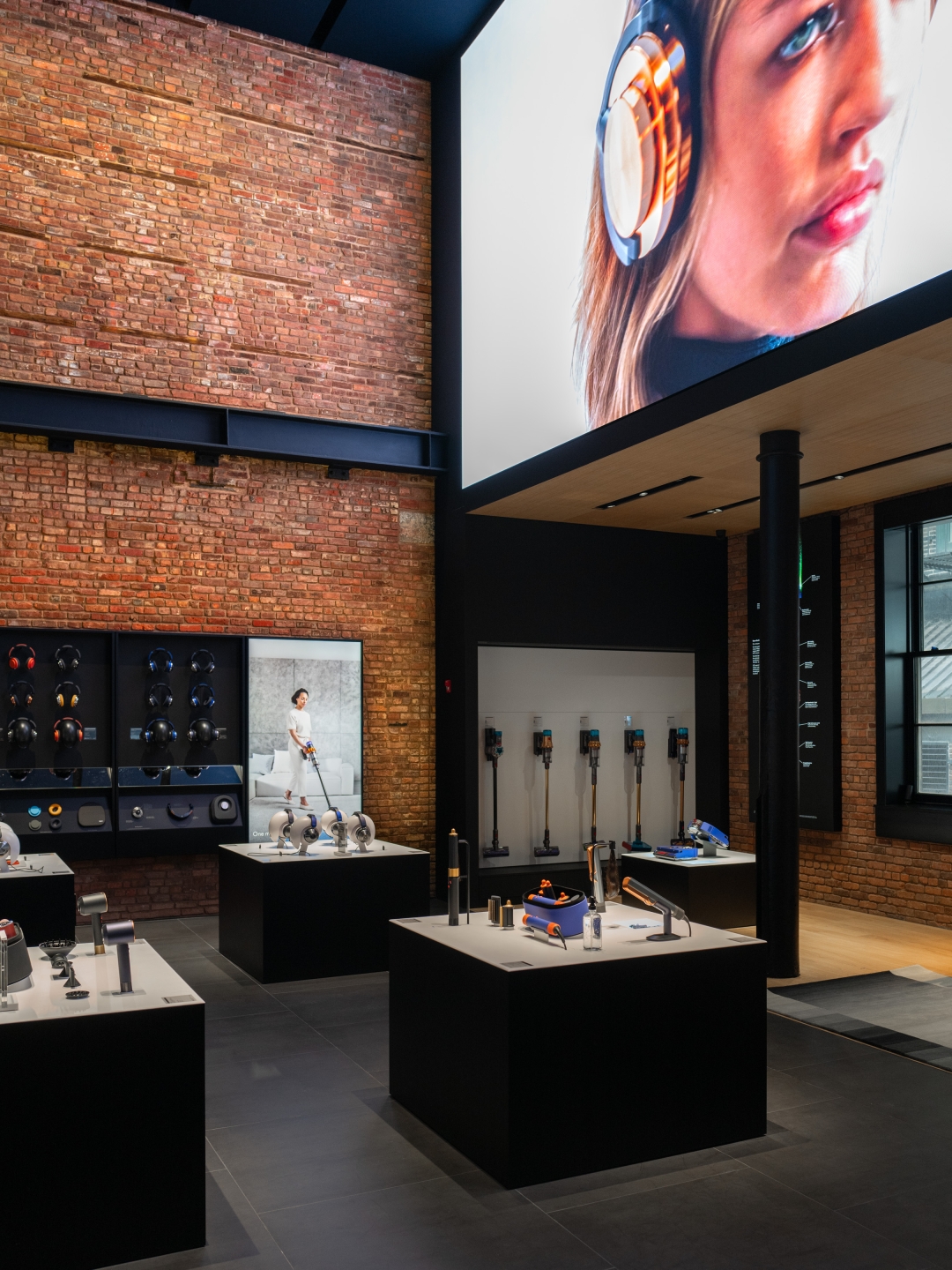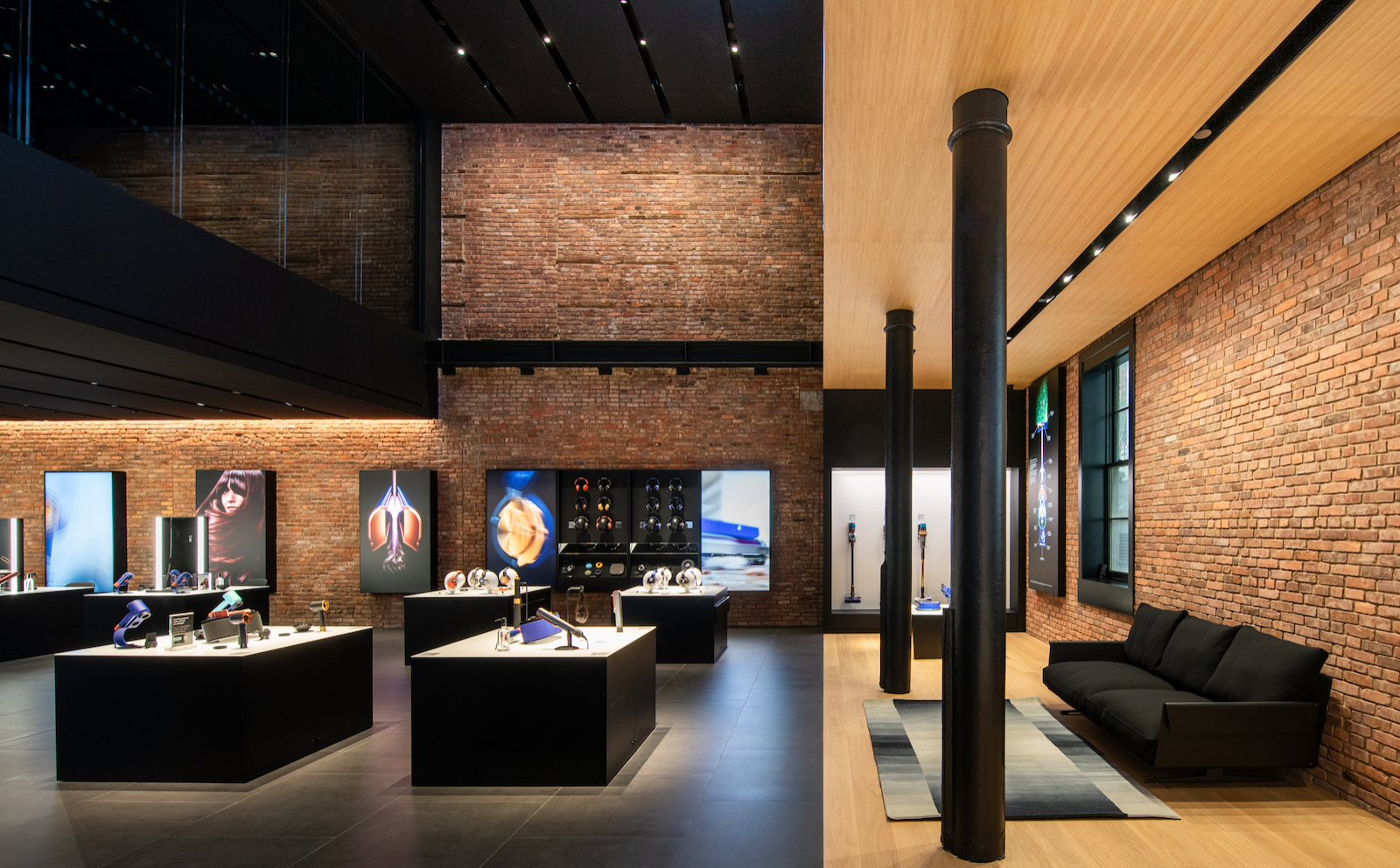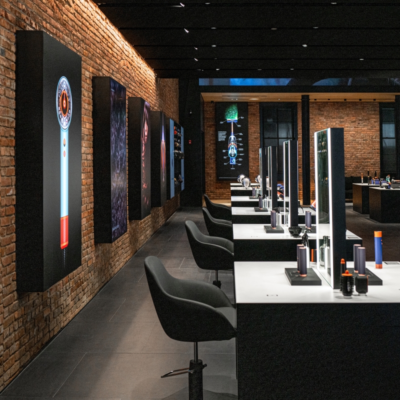 Through close collaboration with the Landmarks Preservation Commission, the design team carefully preserved and enhanced the façade, while newly exposed brick walls and cast-iron columns evoke the materiality of the context and their innate luxury. The store embraces a multi-layered narrative to provide a foundation for the building’s transformation. Our adaptive reuse approach integrates cutting-edge retail requirements into the historical shell, adding a link in the chain of the space’s creative legacy. Embracing artifacts of the industrial history, this forward-looking shopping experience maintains the building's integrity and delivers a sophisticated retail environment that is uniquely SoHo while showcasing Dyson's tech-driven brand.