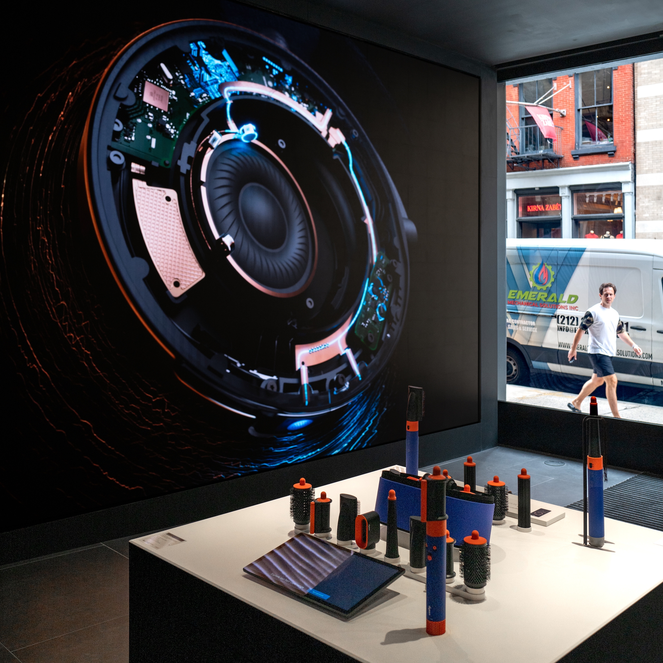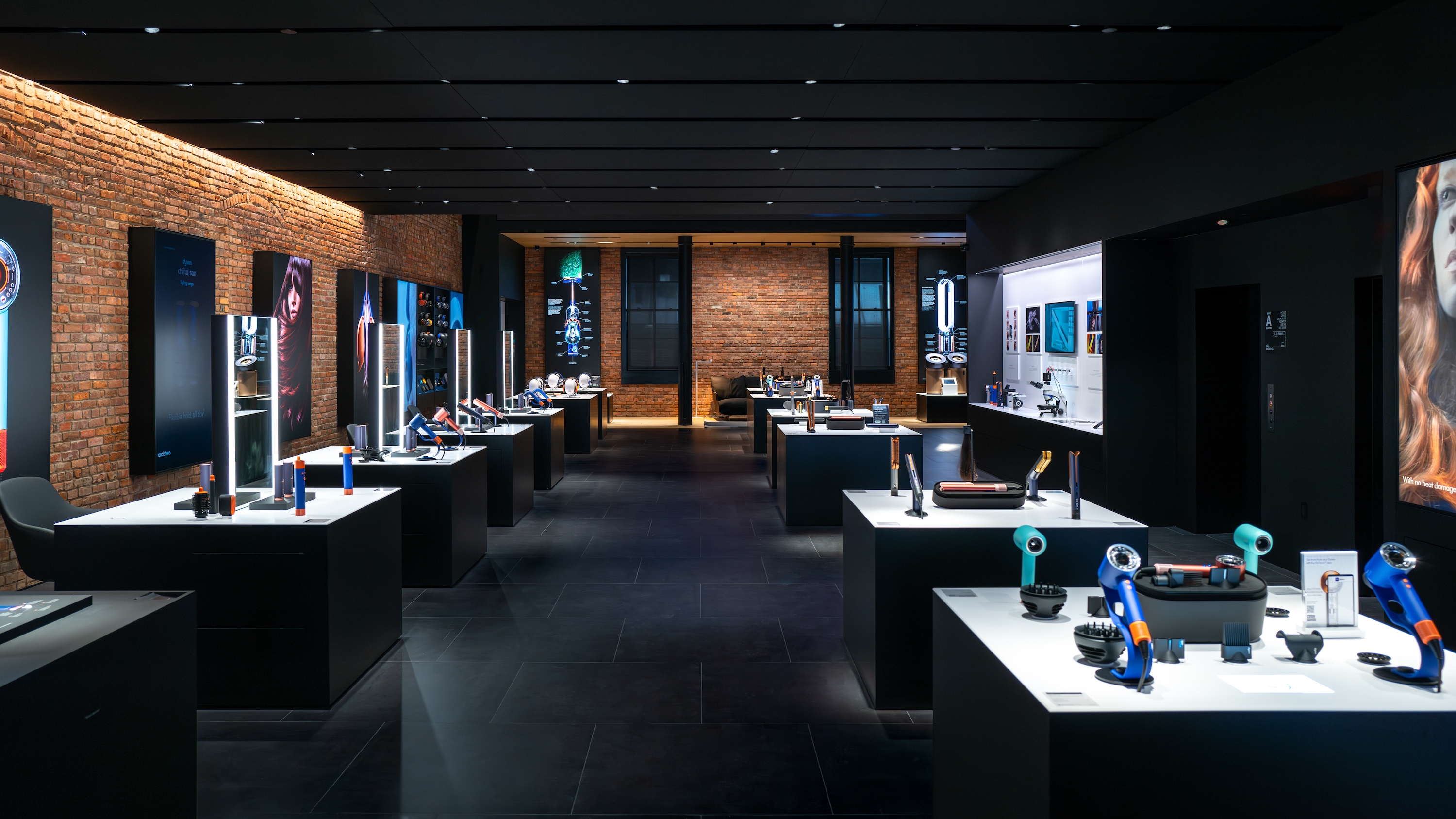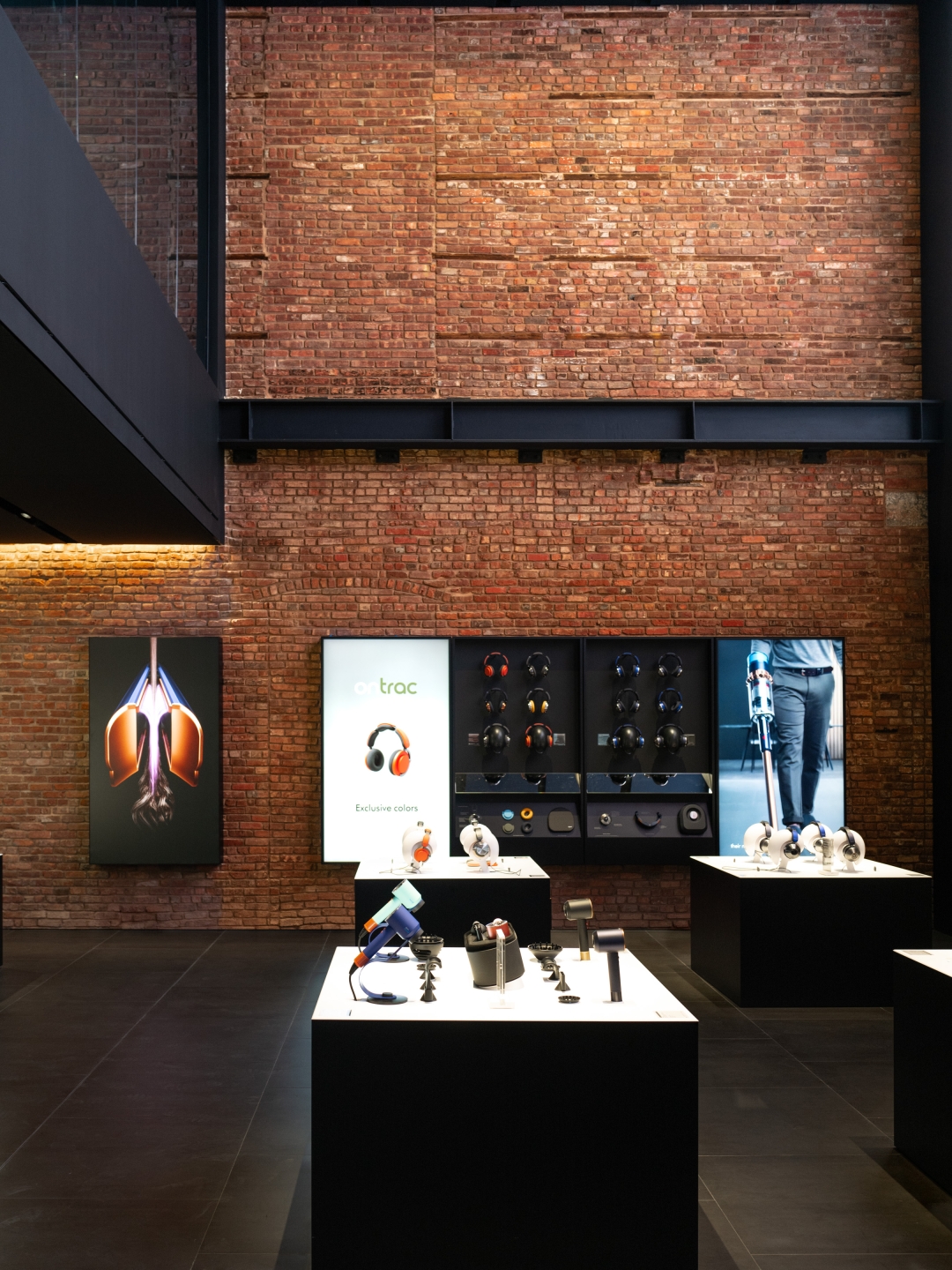 Through close collaboration with the Landmarks Preservation Commission, the design team carefully preserved and enhanced the façade, while newly exposed brick walls and cast-iron columns evoke the materiality of the context and their innate luxury. The store embraces a multi-layered narrative to provide a foundation for the building’s transformation. Our adaptive reuse approach integrates cutting-edge retail requirements into the historical shell, adding a link in the chain of the space’s creative legacy. Embracing artifacts of the industrial history, this forward-looking shopping experience maintains the building's integrity and delivers a sophisticated retail environment that is uniquely SoHo while showcasing Dyson's tech-driven brand.