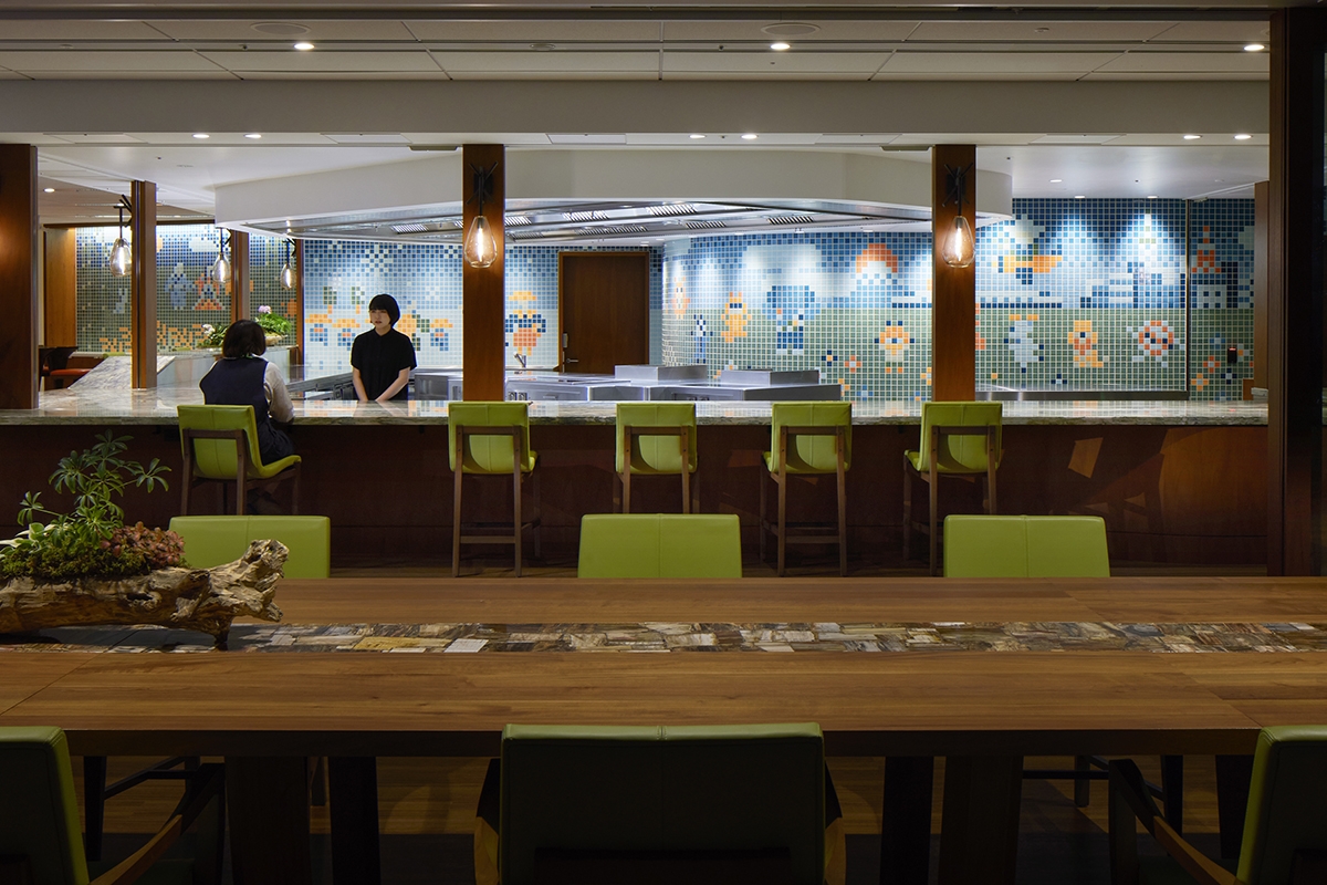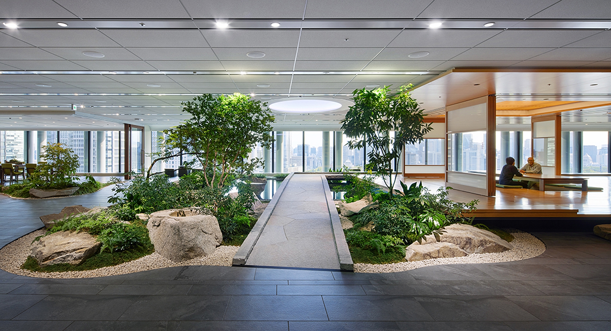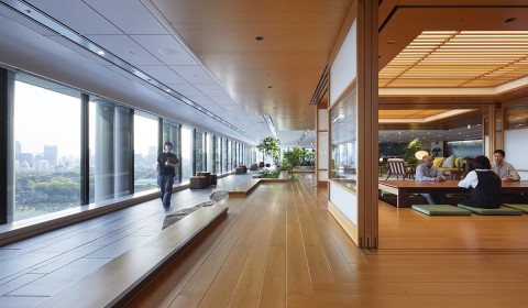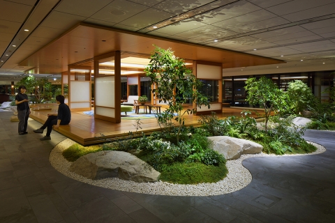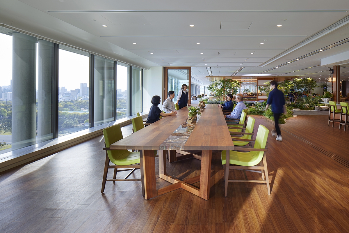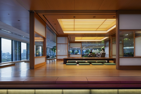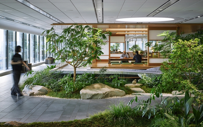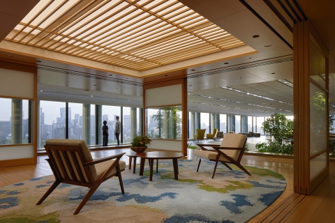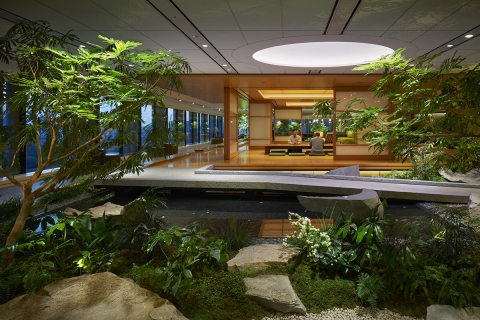 The Ohana Floor, Salesforce’s signature amenity floor, offers uninterrupted views of central Tokyo and the Imperial Gardens. A unique departure from other global namesake projects, the Tokyo Ohana Floor afforded the opportunity to investigate the intersections of the company’s corporate design standards and traditional Japanese culture. A traditional Japanese house and garden is strategically placed in the heart of the space and is surrounded by native trees, low-lying vegetation, and a reflecting pool that forms a connection to the Imperial Moats.